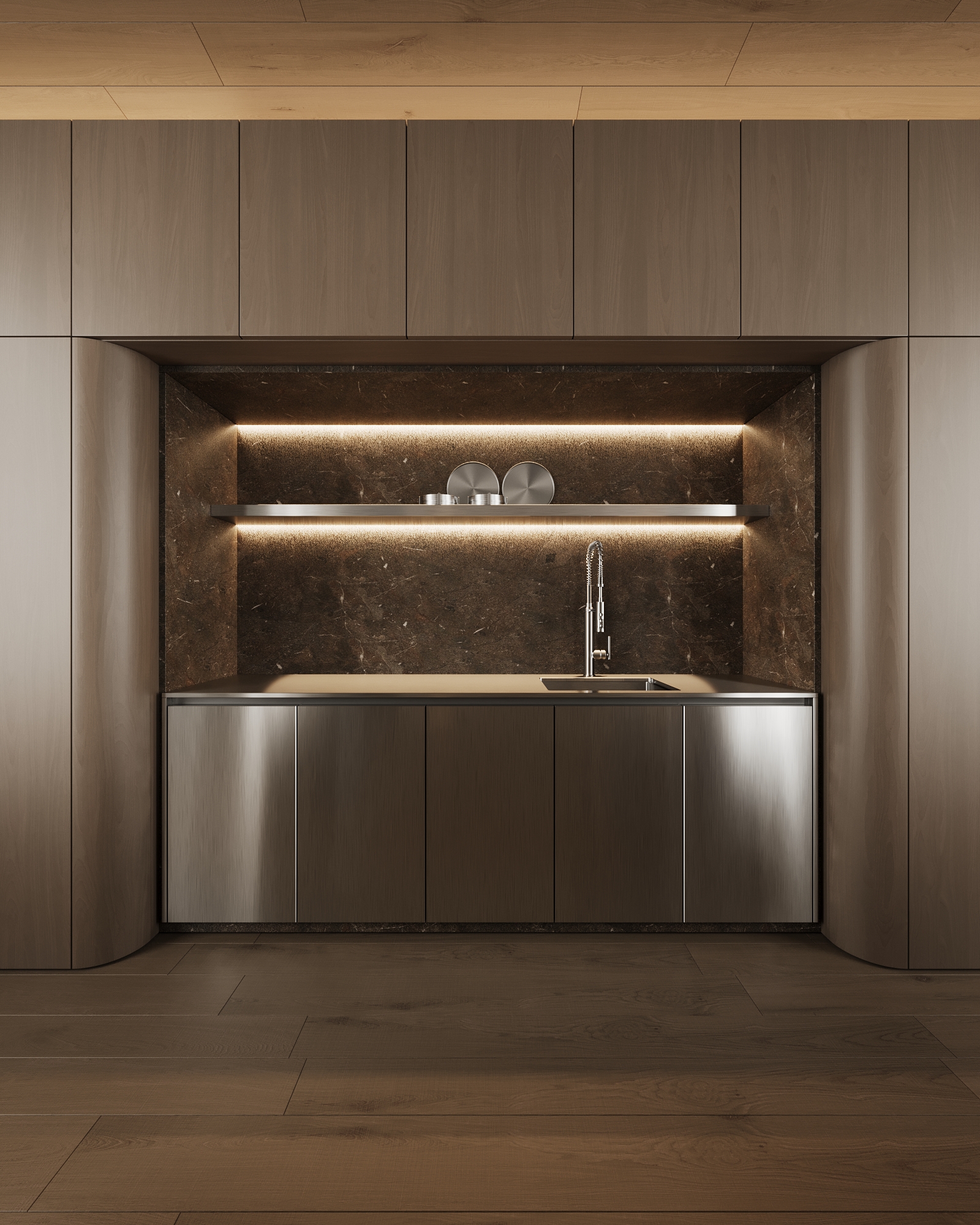 Гостинная с кухней, стальной остров и кухонный фасады, смешанные с темными тонами дерева и кожи