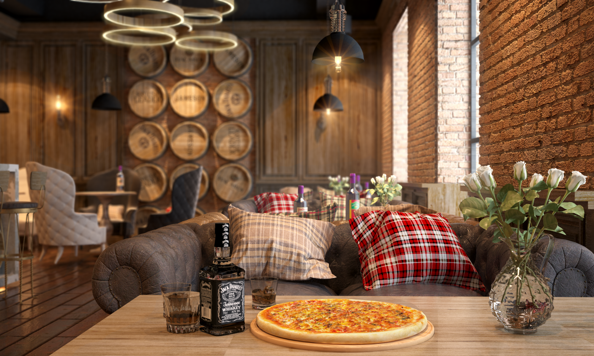 Класс, я бы хотела побывать в таком кафе) Единственное с материалами кожи и пола что-то не так, и на первом изображении бутылки справа летают над столом, но в целом очень красиво!