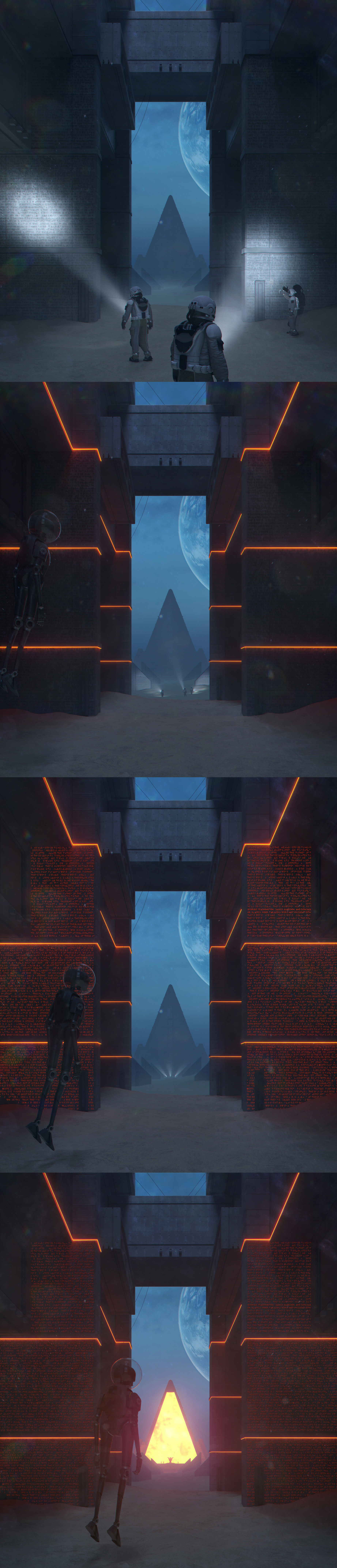 Громадная пирамида возвышалась перед землянами. Археологи со смешанным чувством благоговения и ужаса смотрели на ее вершину, уходящую на сотни метров вверх, в темноту космоса. Вдруг позади, там, где остался узкий проход между мегалитами, послышался скрежещущий звук. Астронавты медленно, как во сне, обернулись…
