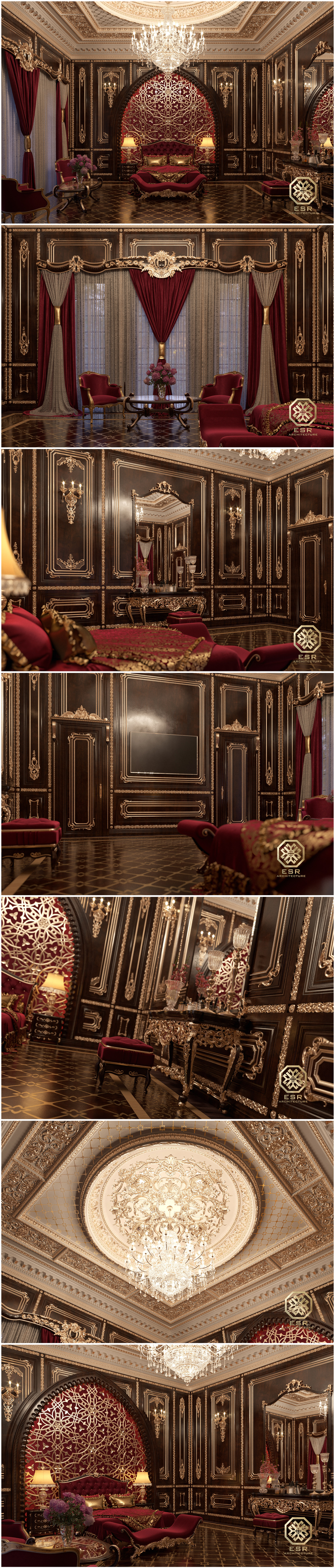 Шикарная работа ! Но для спальни очень тяжёлый интерьер, это все таки больше кабинетный стиль, темное дерево, зеленное сукно стола, бордовый кожаный диван.