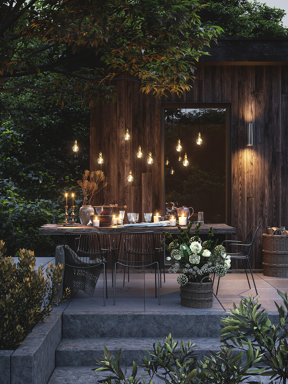 Ну, так как это вообще ни разу не реальный проект - я представила себе, как фотограф, рискуя жизнью, развешивает лампочки на ветках, нависающих над столом. И все ради симпатичного кадра)) Если бы был реальный, разумеется, все было бы продумано.