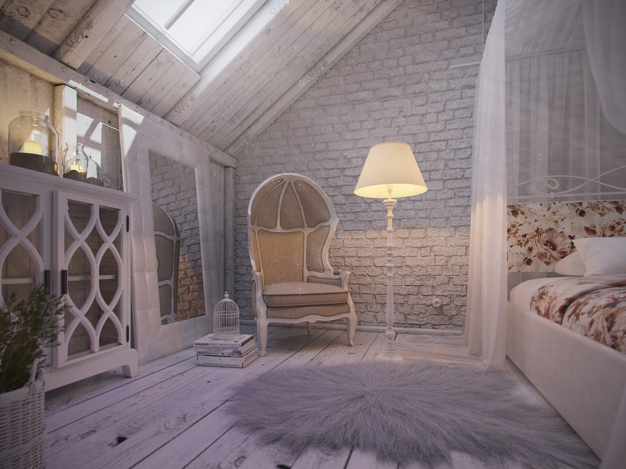 Мансард,кроват, корзин :) в целом неплохо- только при обилии красивых постелей на 3ddd Вы выбрали что-то очень странное и какое то бабушковское. Волосатый ковер больше похож на раздавленного и поседевшего кузена Итт из семейки Адамсовhttp://prostoloca.ru/wp-content/uploads/2014/10/%D0%BA%D1%83%D0%B7%D0%B5%D0%BD-%D0%B8%D1%82%D1%82-550x368.jpg На третьем кадре есть розетка,есть торшер-нет провода.