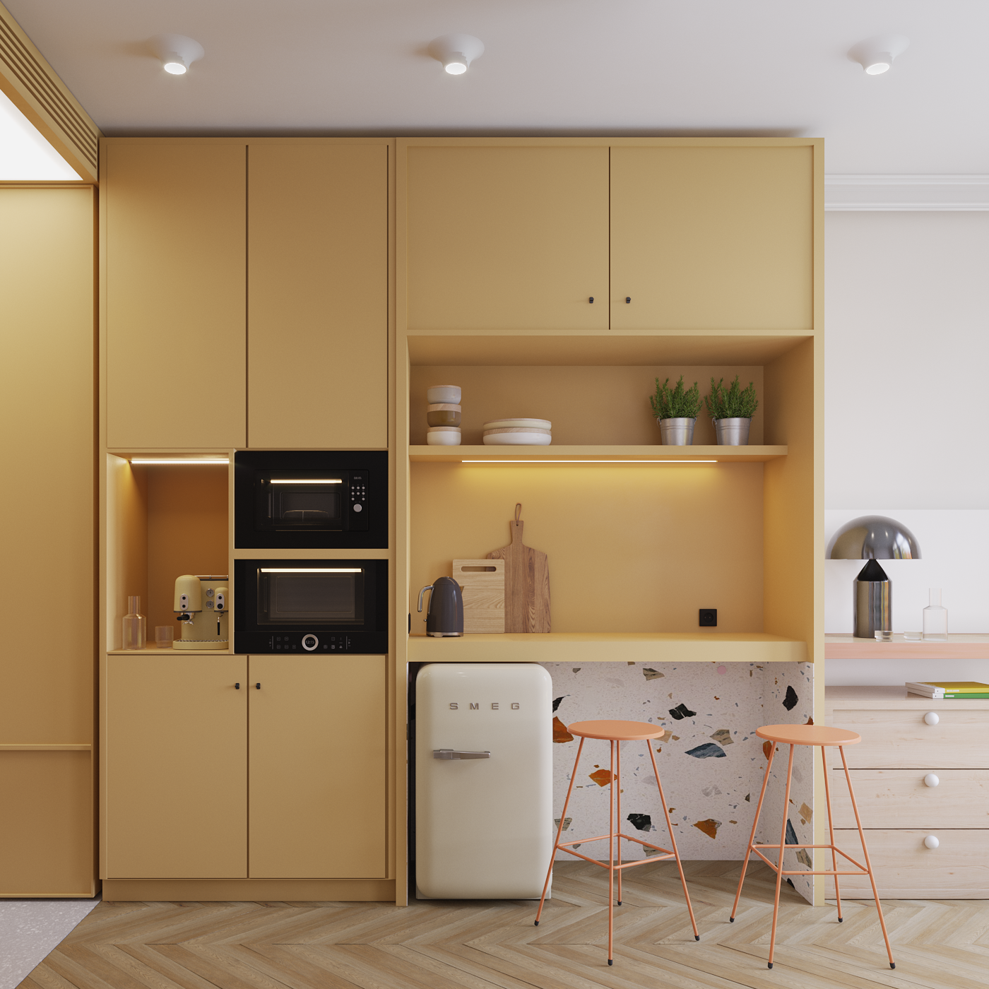 THE APARTMENT IS LOCATED NEAR THE HISTORICAL PARK IN SAINT PETERSBURG FOR RENT. THE MAIN IDEA OF THE PROJECT IS AN ACCENT BRIGHT COLOR SPOT IN A SMALL APARTMENT, MADE BY WALLS, CEILING AND FURNITURE FACADES.