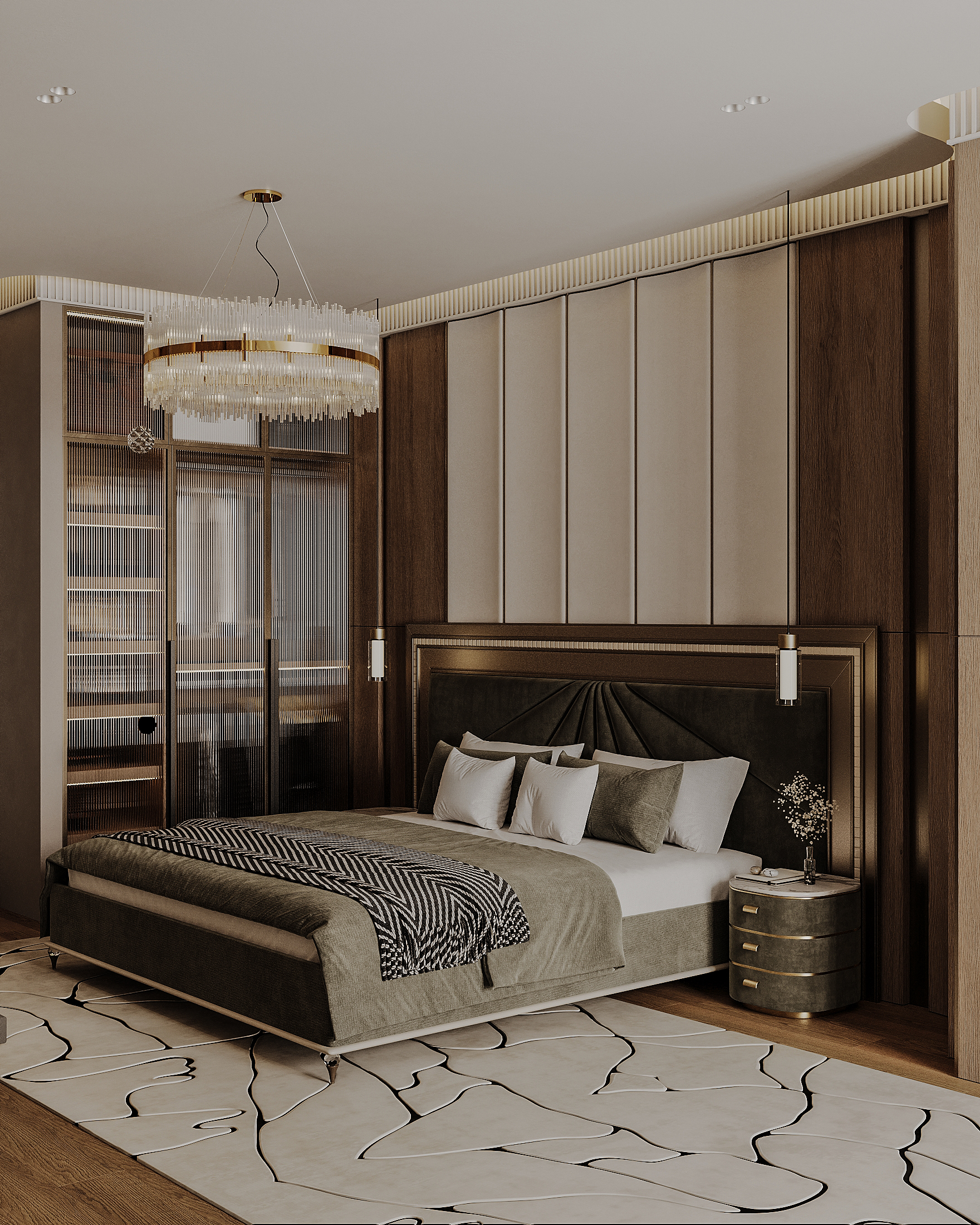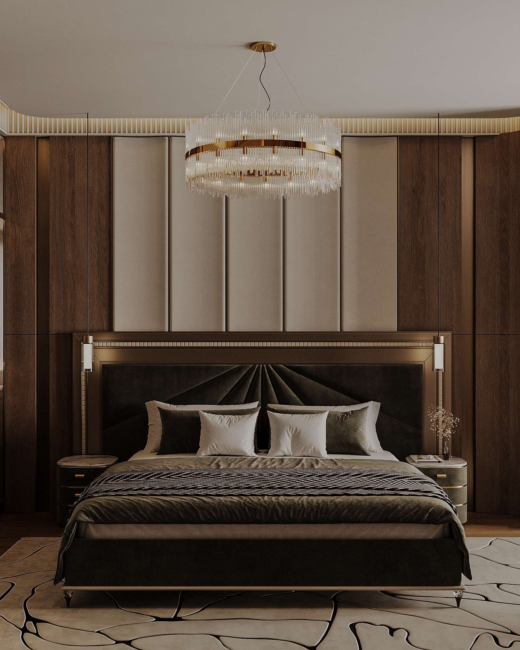 Благородные оттенки, чёткая геометрия и мягкий свет — спальня, где стиль встречается с комфортом.