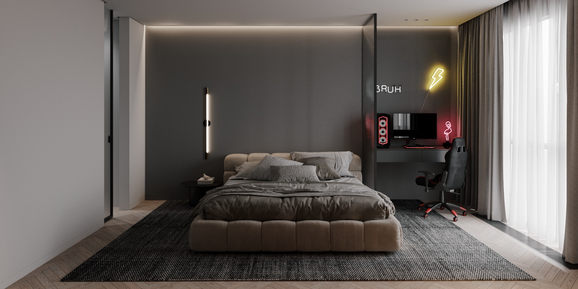 Минималистичная мастер спальня с рабочей-игровой зоной.