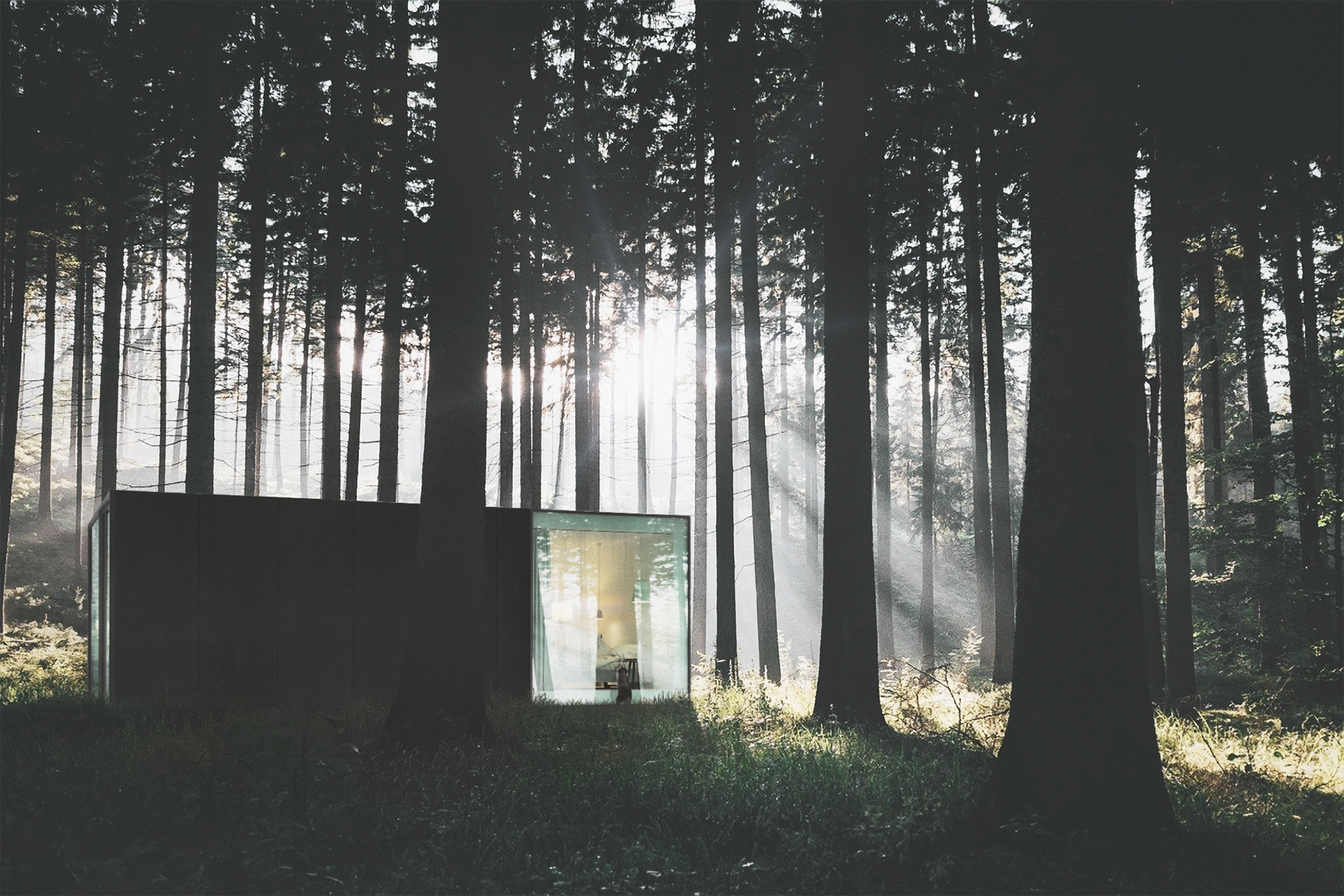 Концепт маленького префаба, который можно было бы возвести практически в любых условиях. Дом крайне минималистичный и с большой площадью остекления, что помогает ему вписать в окражющую природу и вместе с тем способствует сильному контрасту между антропогенным и природным.