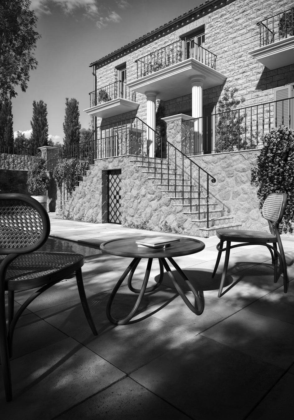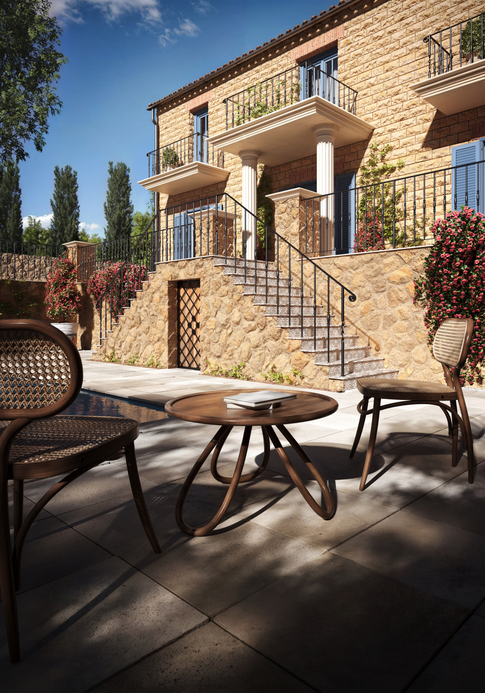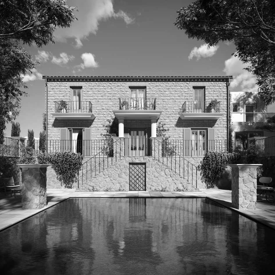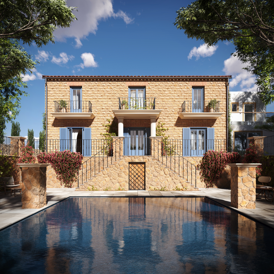 3D visualization of a Mediterranean villa: stone facade, blue shutters, and a pool reflecting the sky. Simple and cozy architecture surrounded by greenery. A great option for inspiration or a home project.