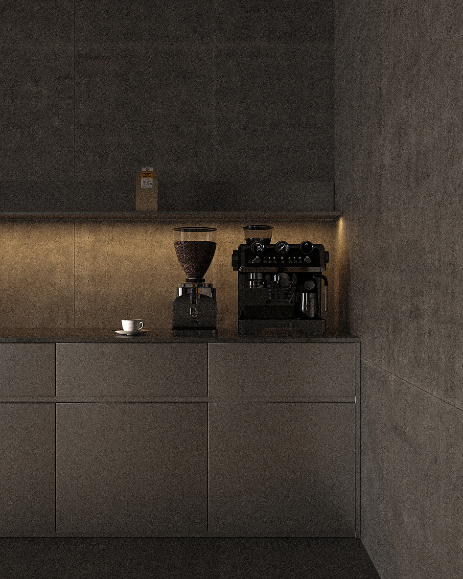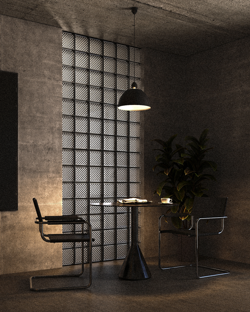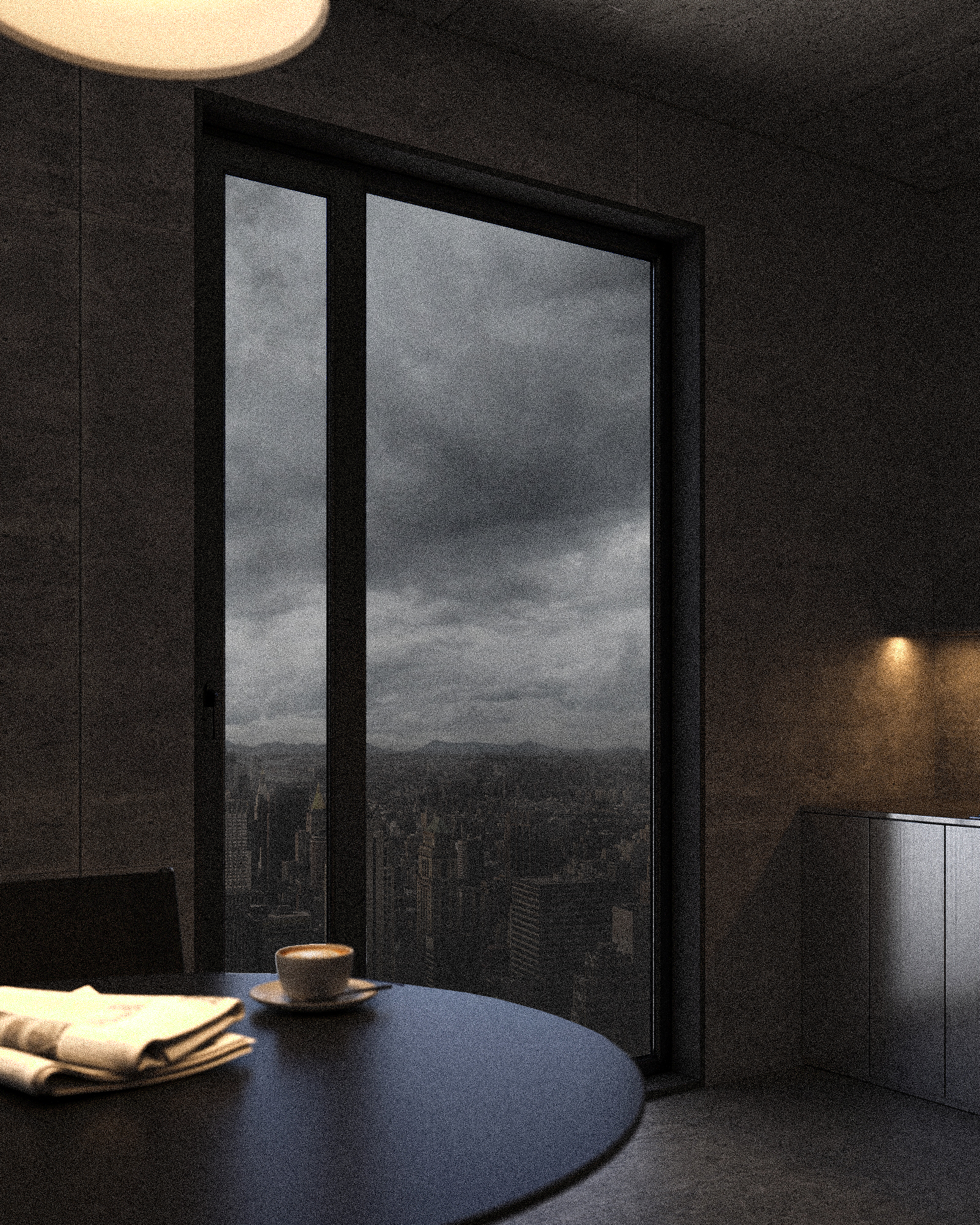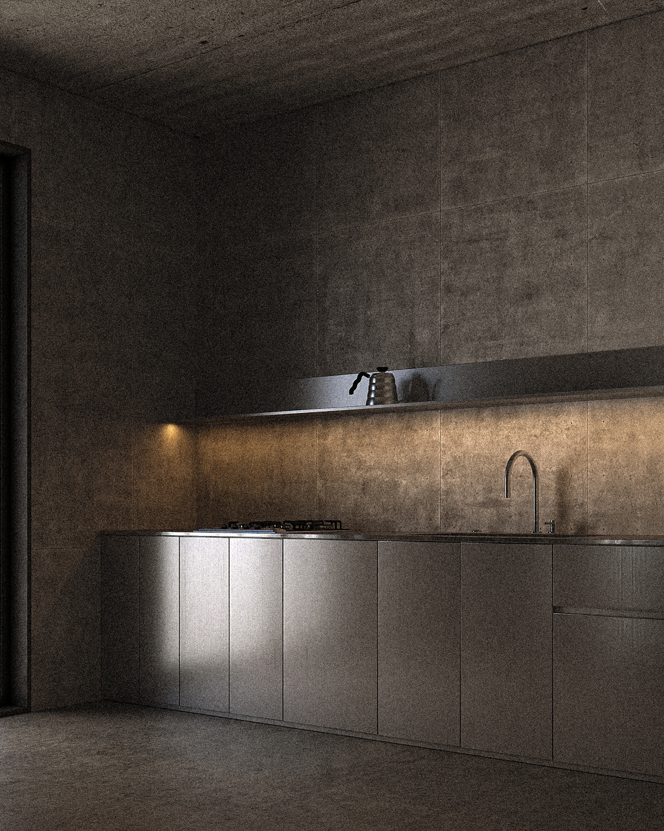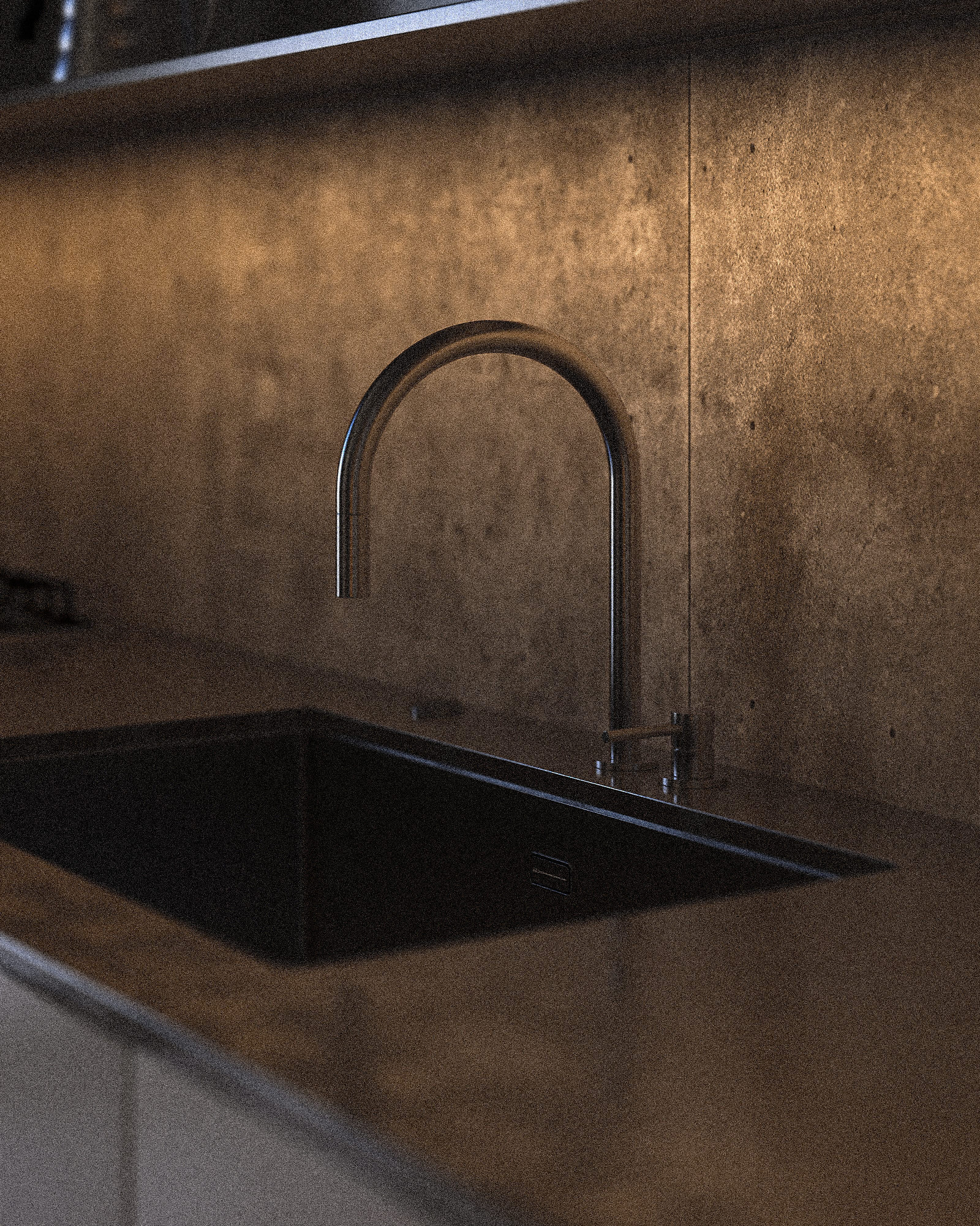 Потамушта дело даже не в шуме, а в том, что когда пытаются в минимализм, то акцент идет на композицию, свет, материалы. А у вас тут прям набор "ошибок новичка". Вы б еще ЧБ сделали до кучи и хроматических аберраций не хватает.