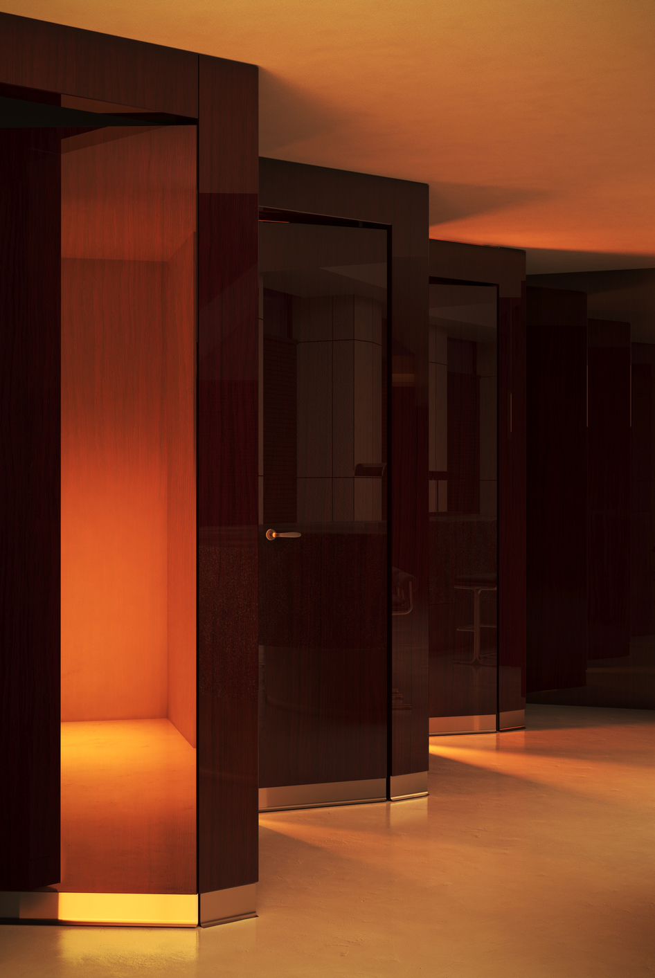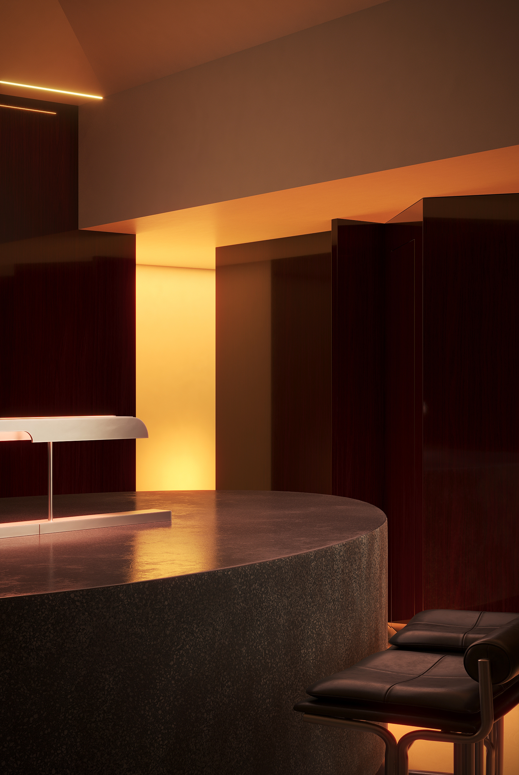 Глянцевые материалы сочетаются с теплым адаптивным освещением и геометрическими формами.