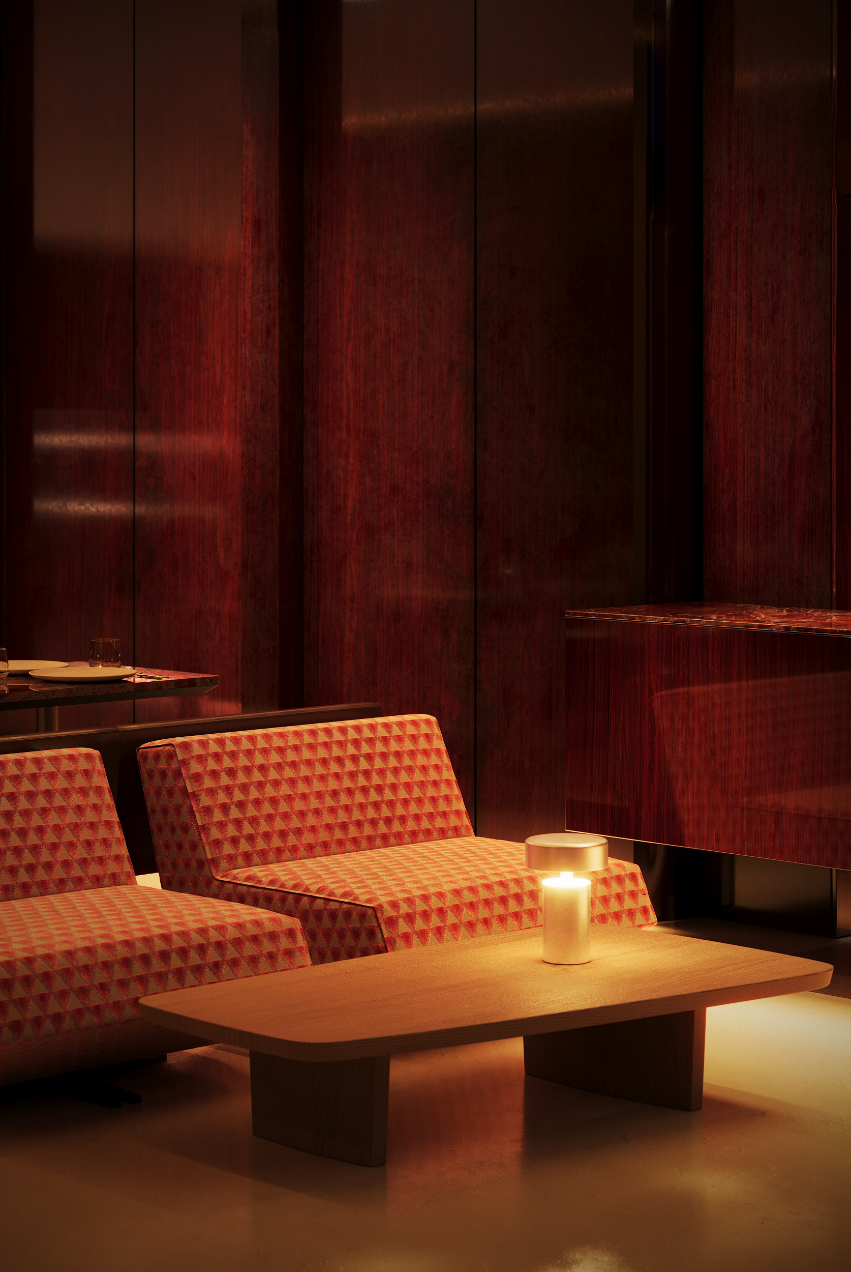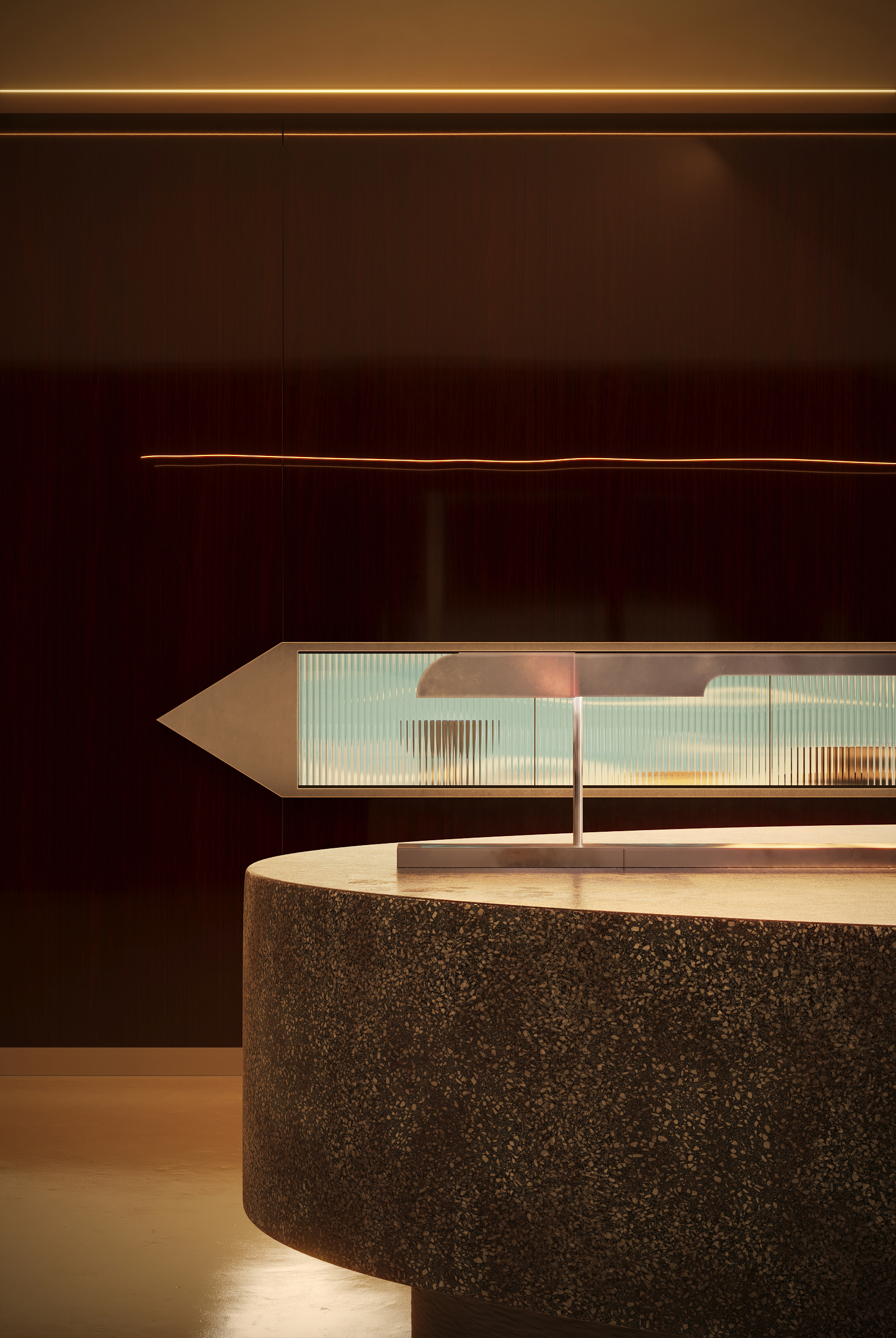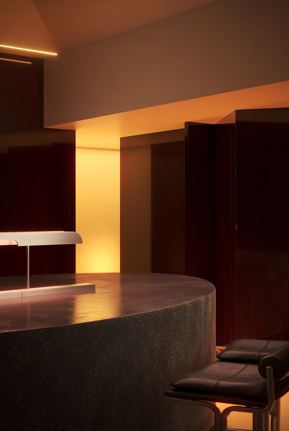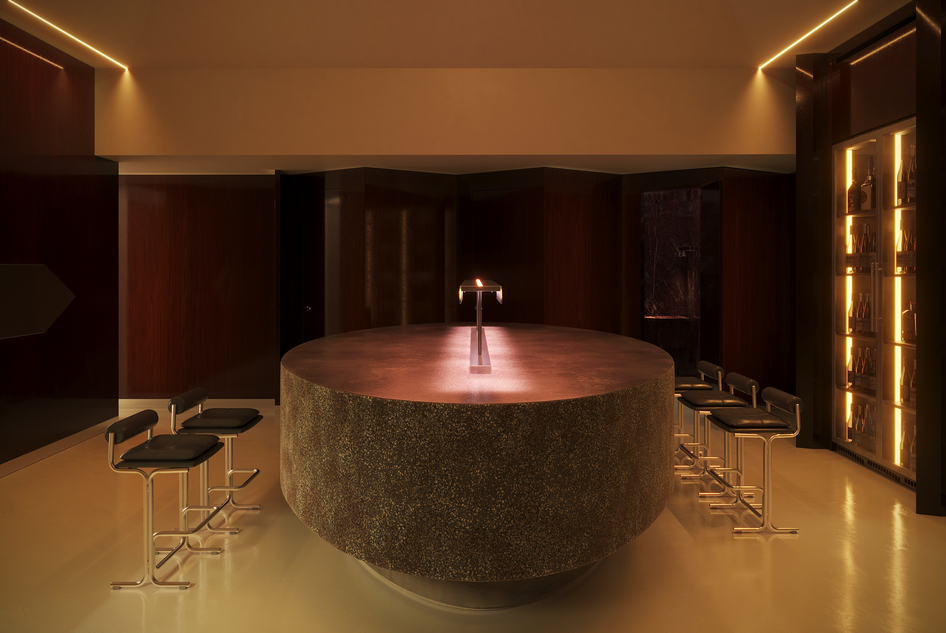 Дизайнеры стремились создать в Millo «театральную атмосферу» за счет богатого взаимодействия текстур, сочетая лакированные стены из орехового дерева с отражающим микроцементным полом, терраццо и мраморными поверхностями.