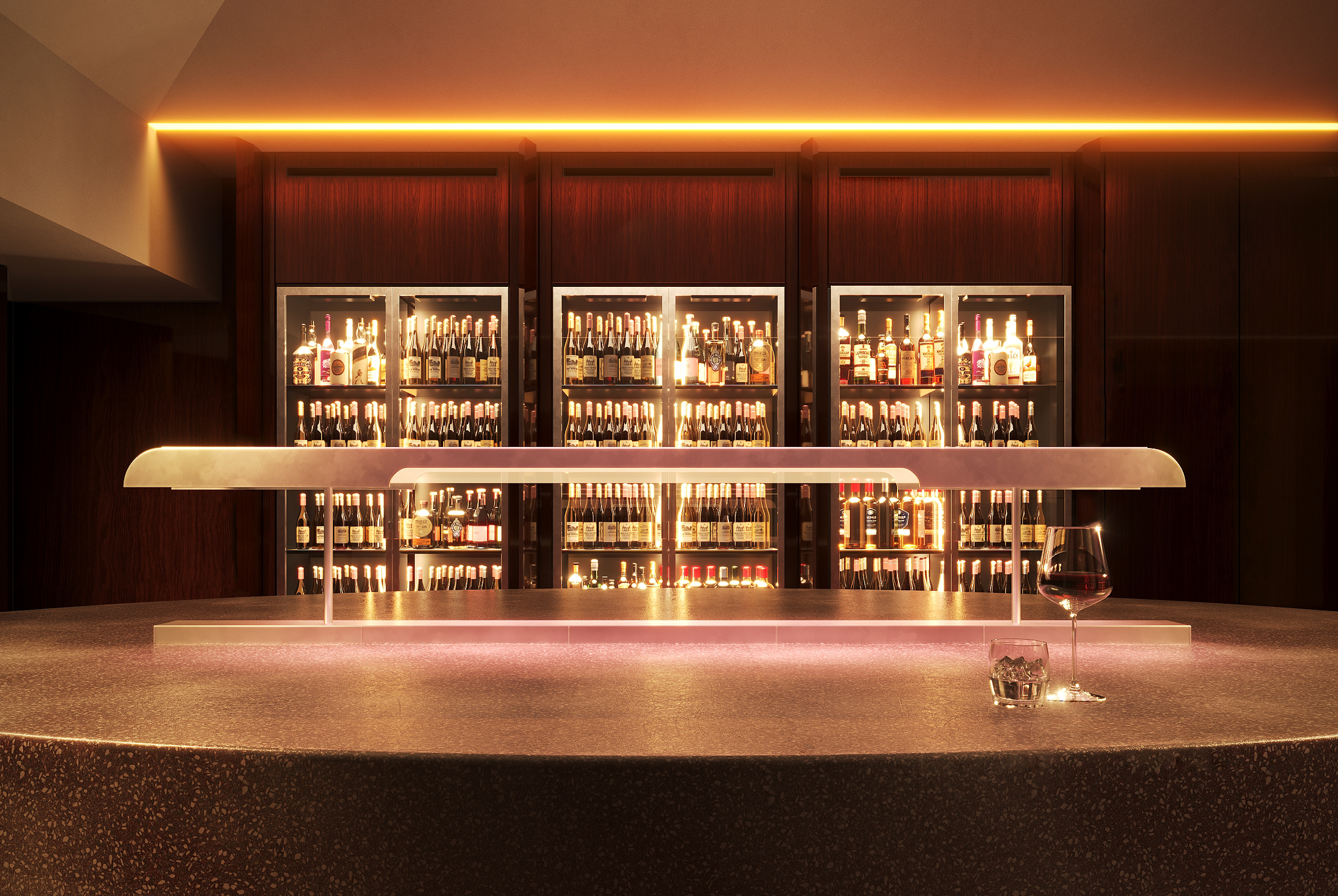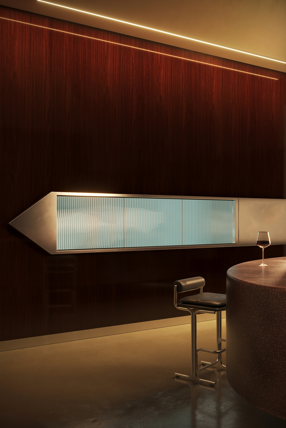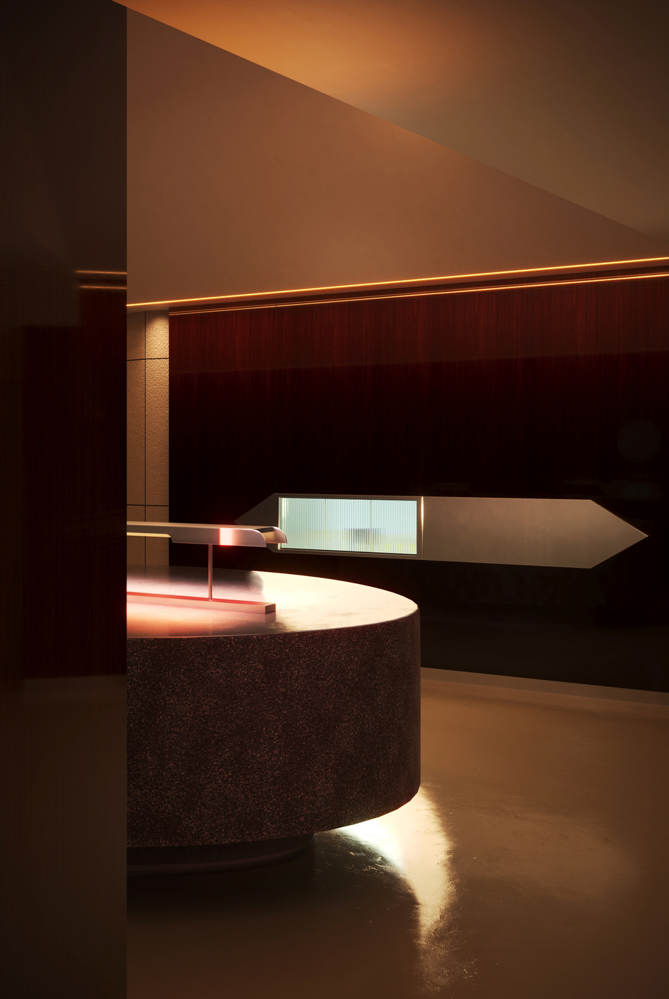 Дизайнеры стремились создать в Millo «театральную атмосферу» за счет богатого взаимодействия текстур, сочетая лакированные стены из орехового дерева с отражающим микроцементным полом, терраццо и мраморными поверхностями.