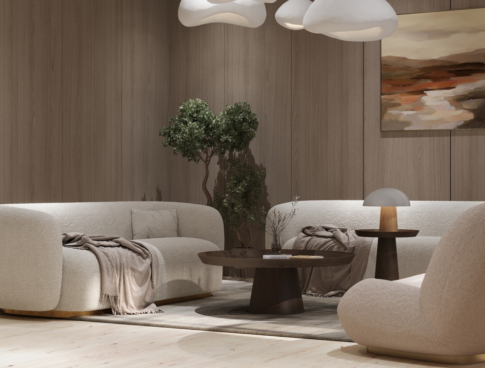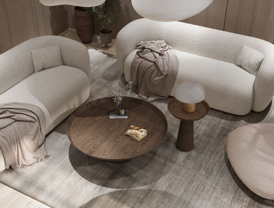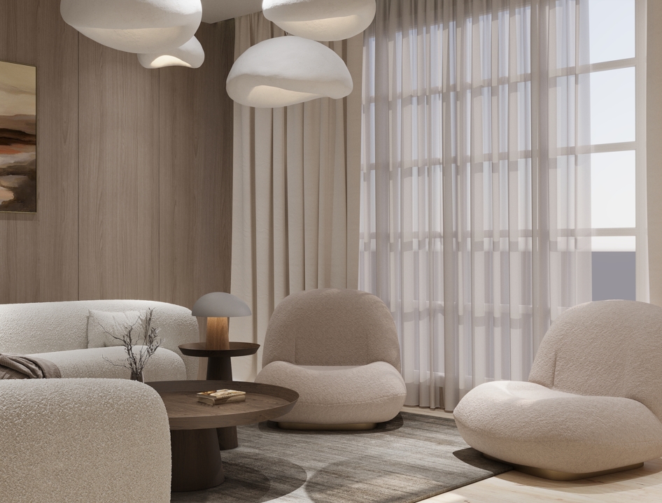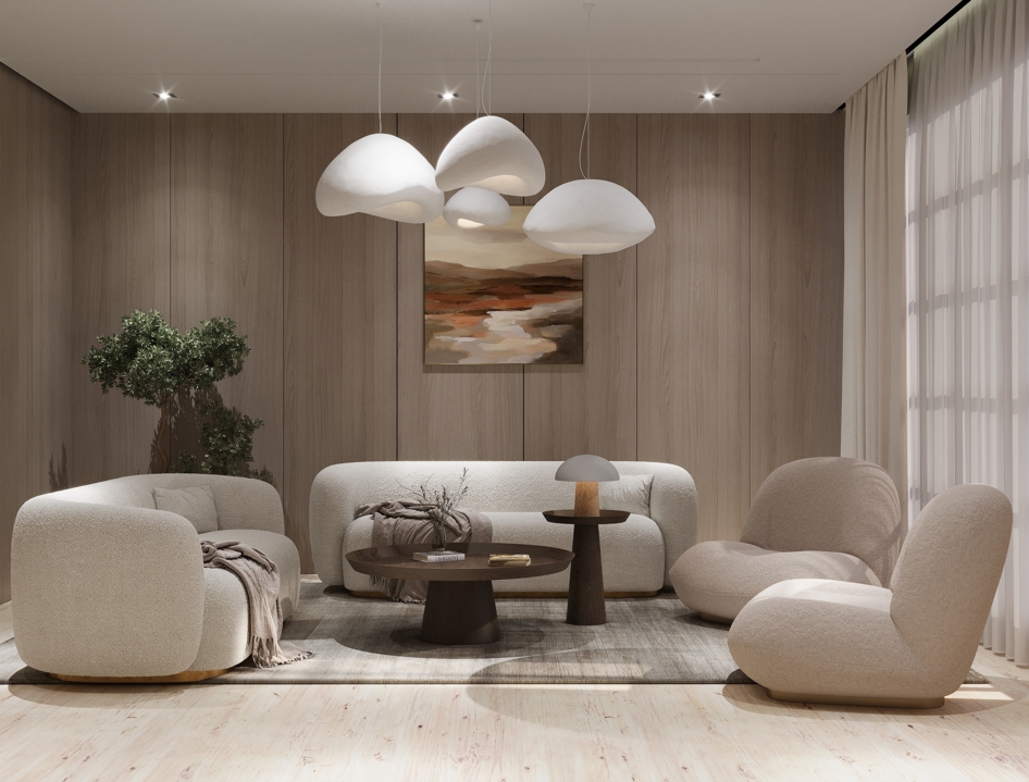 Современный интерьер в стиле минимализм с акцентом на мягкие формы и натуральные материалы.