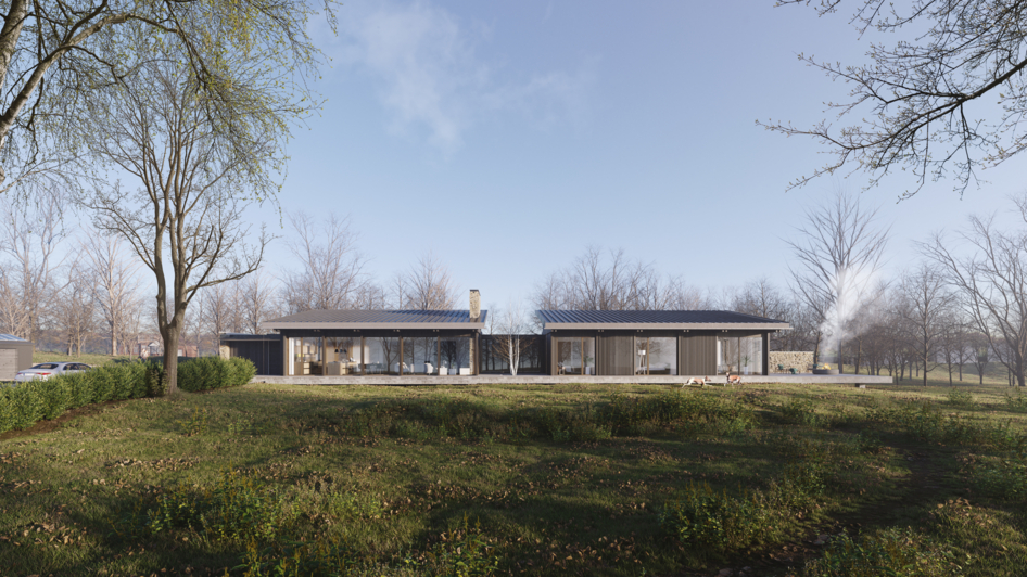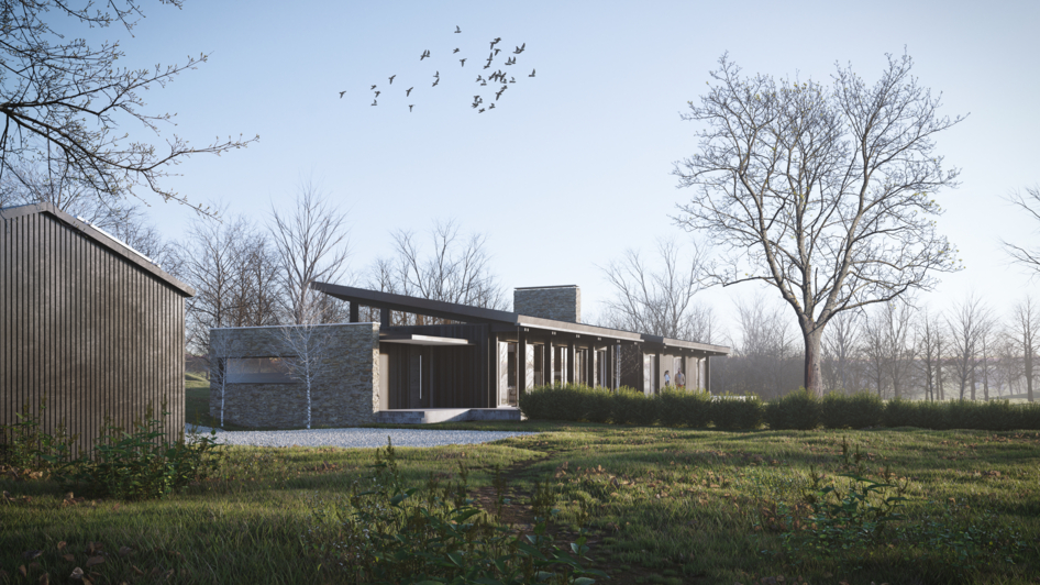 Проект передаёт атмосферу спокойствия и уединения — дом органично вписывается в природное окружение с мягким рельефом, деревьями и естественным освещением. Особое внимание уделено взаимодействию интерьера и экстерьера за счёт больших стеклянных поверхностей.