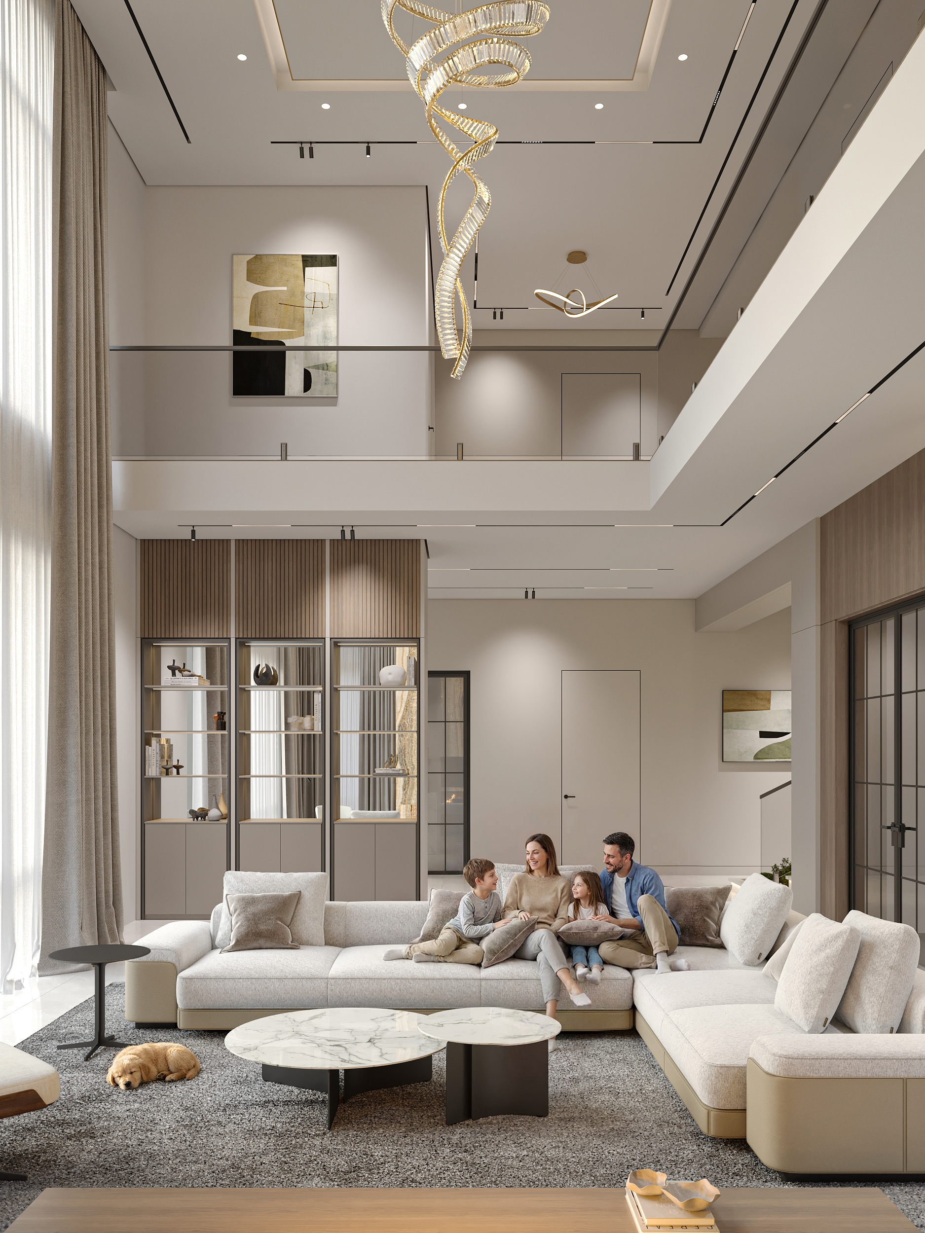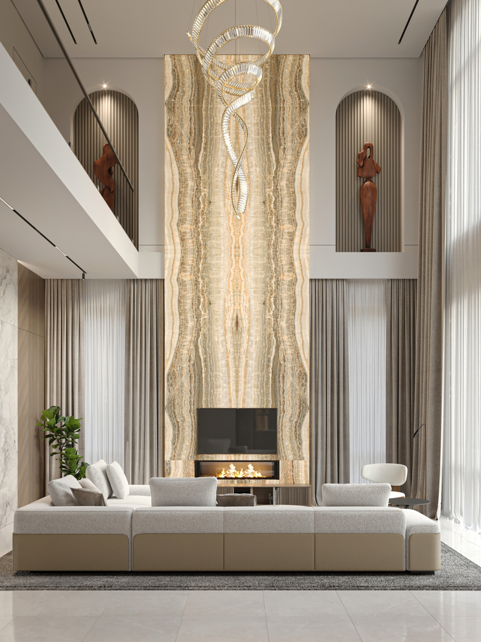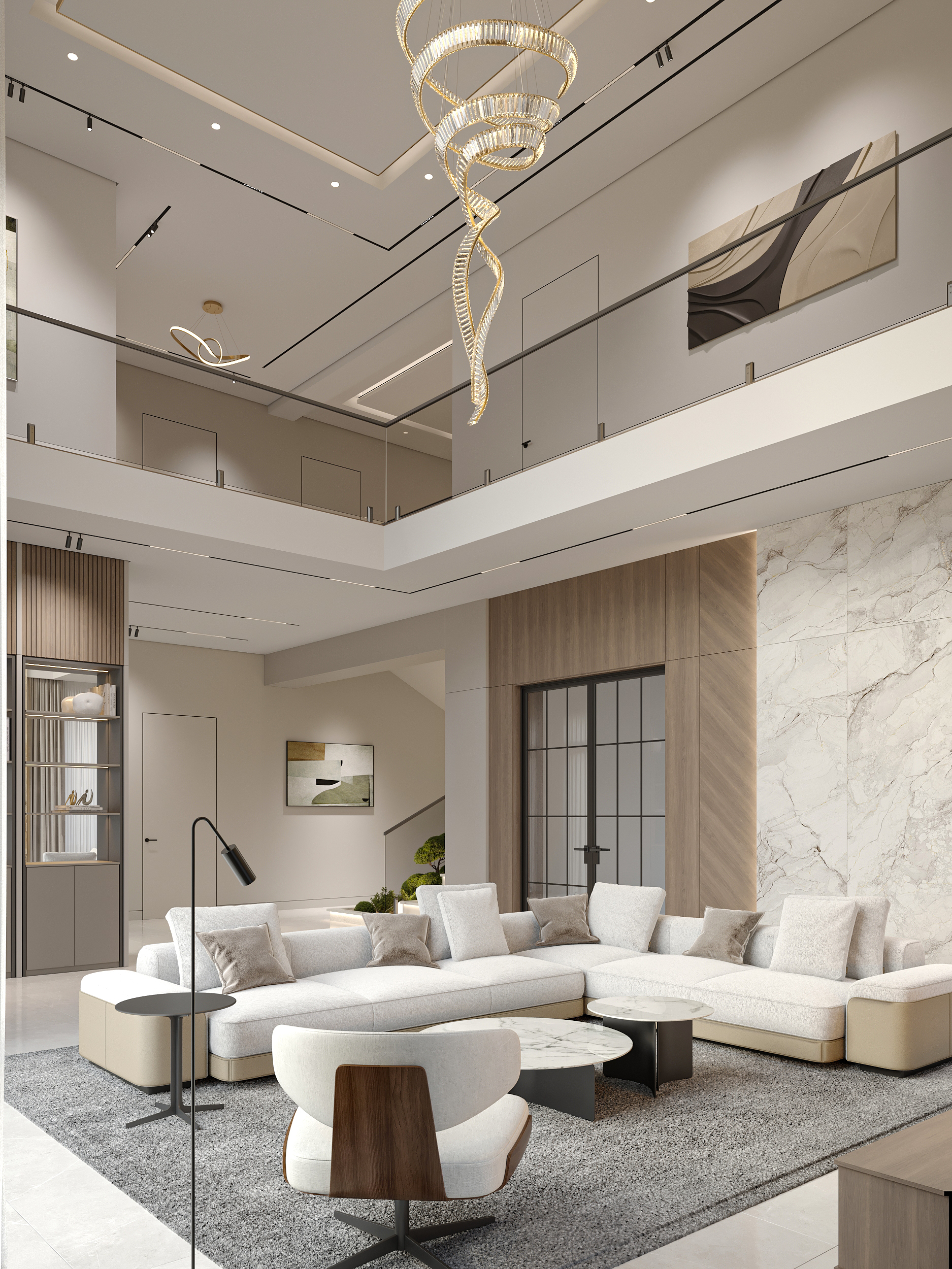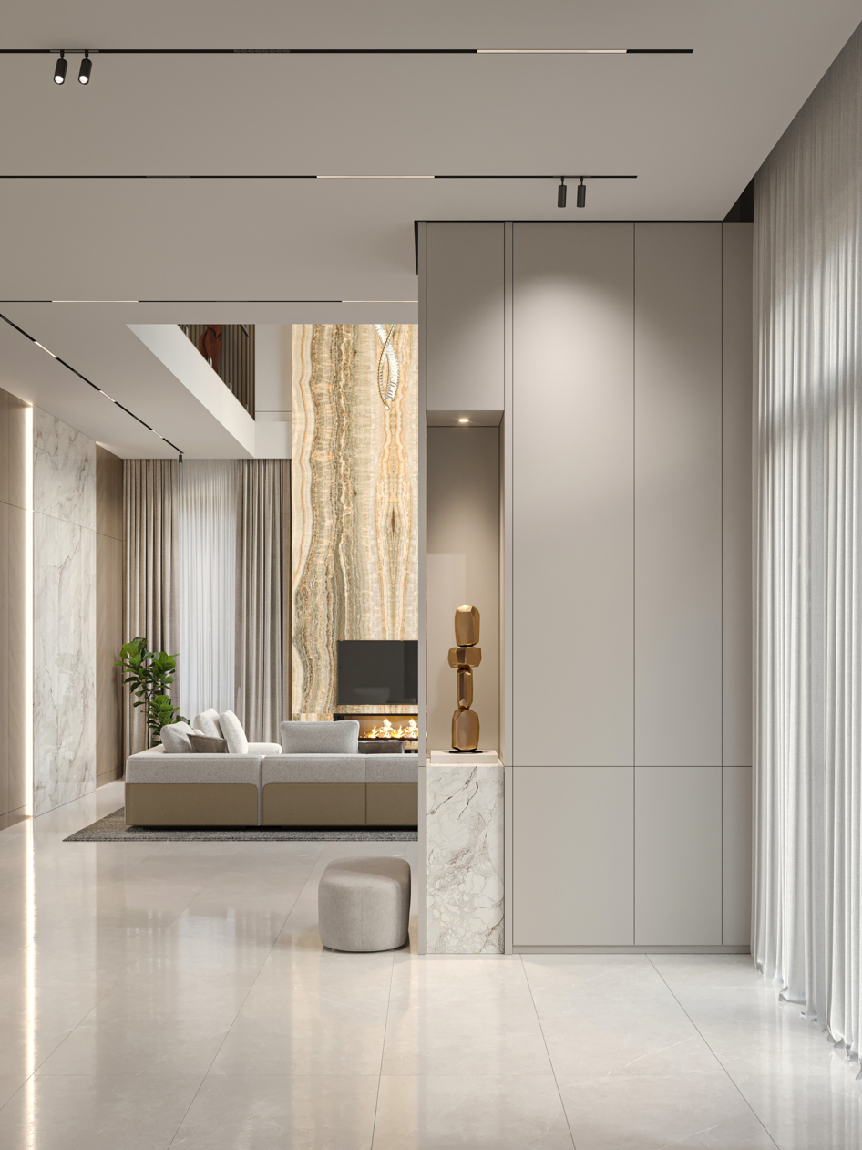 Modern double-height living room interior in a warm minimalist style. Soft natural tones, elegant lighting, and clean architectural lines create a calm and sophisticated atmosphere.