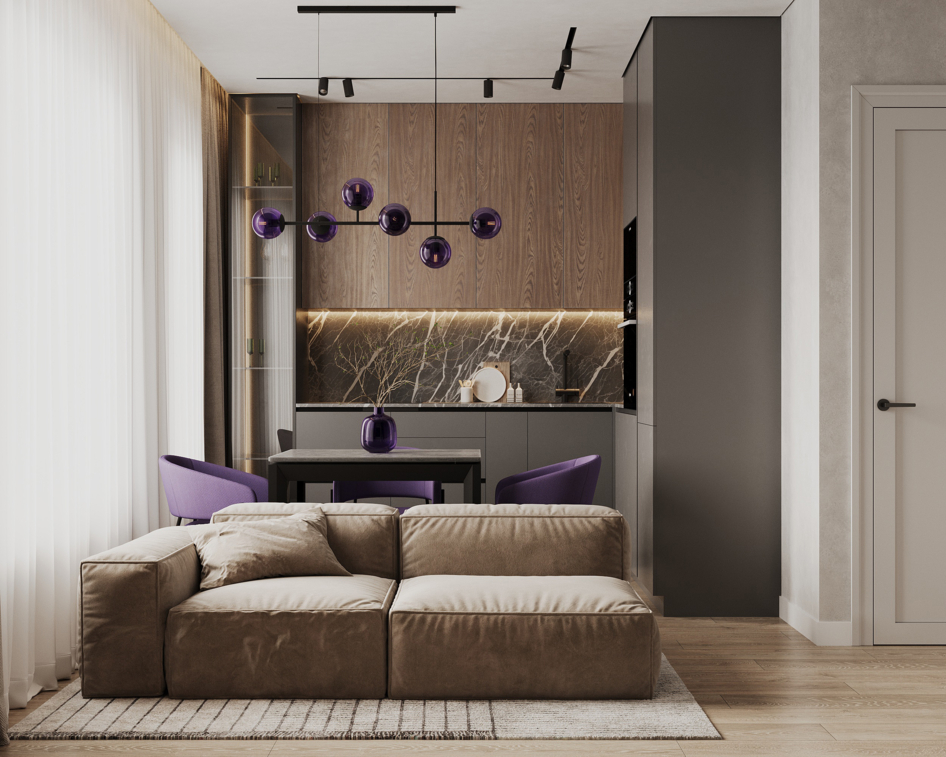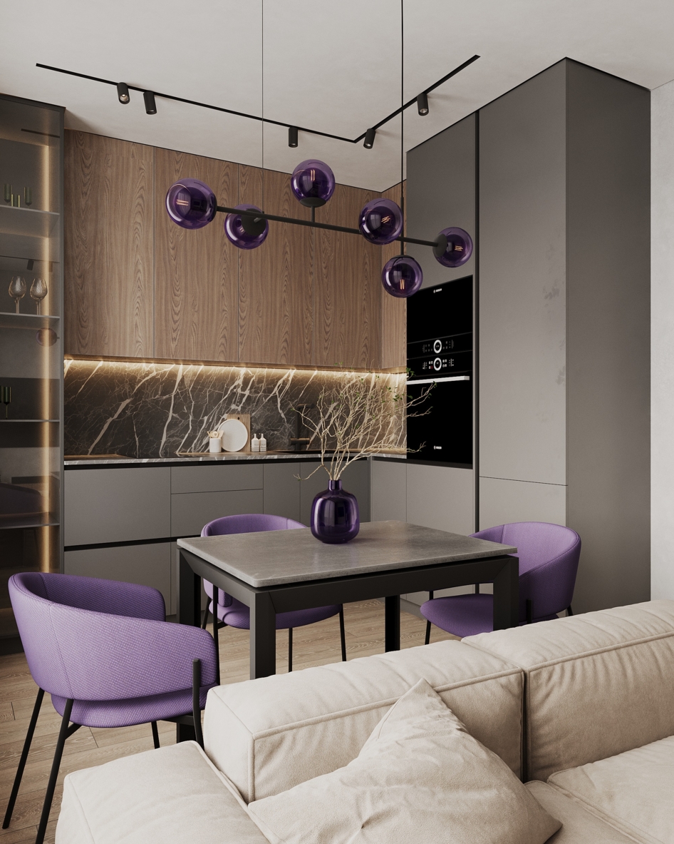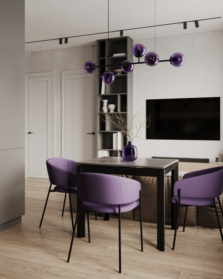 Фиолетовая обеденная зона как будто не вписывается в это серо-бежевое царство. Вот заменить бы бежевый на серый и будет гармония.