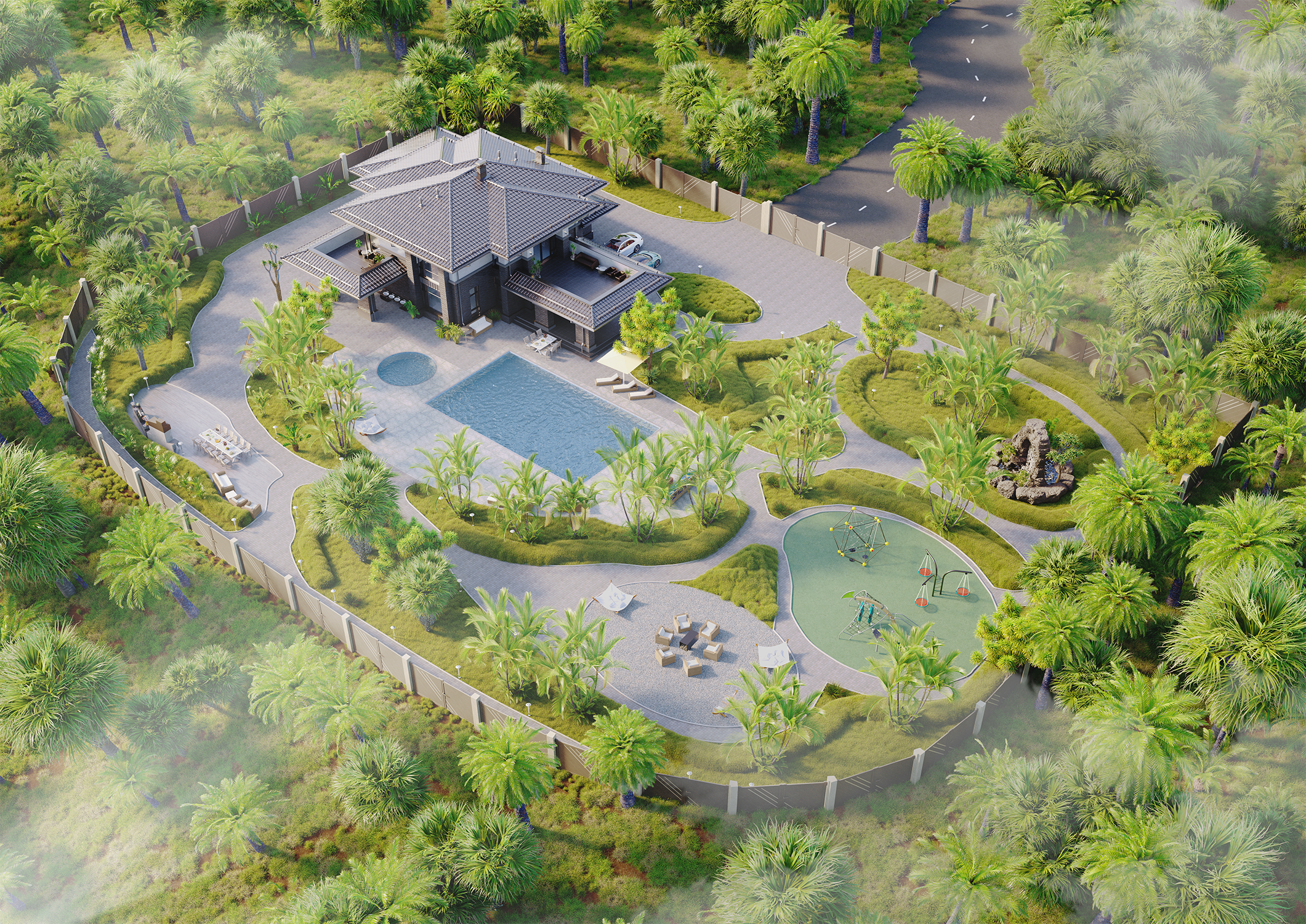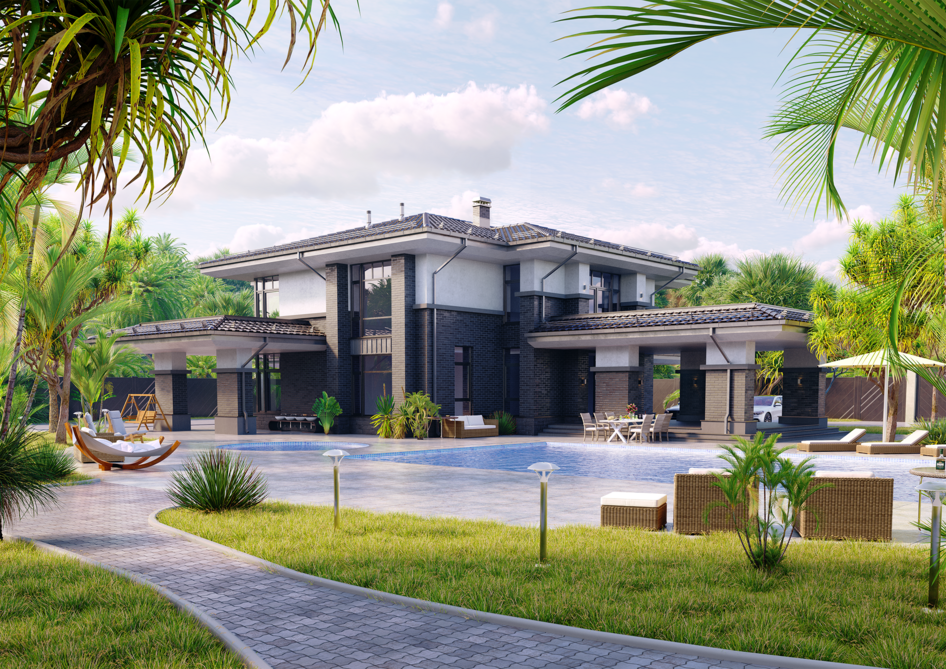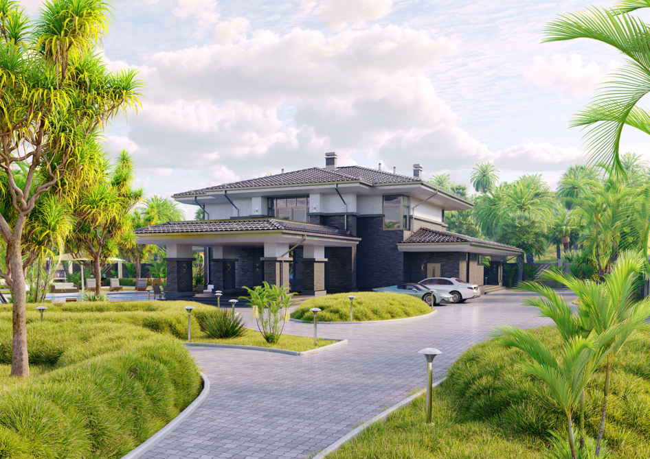 Проект архитектурной визуализации — масштабная частная резиденция, спроектированная в концепции "приватного курорта".