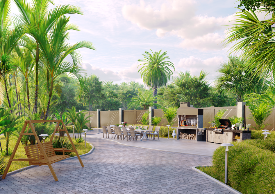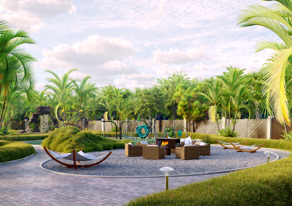 Плавные линии мощения объединяют все зоны в единый гармоничный ансамбль, утопающий в сочной зелени пальм.