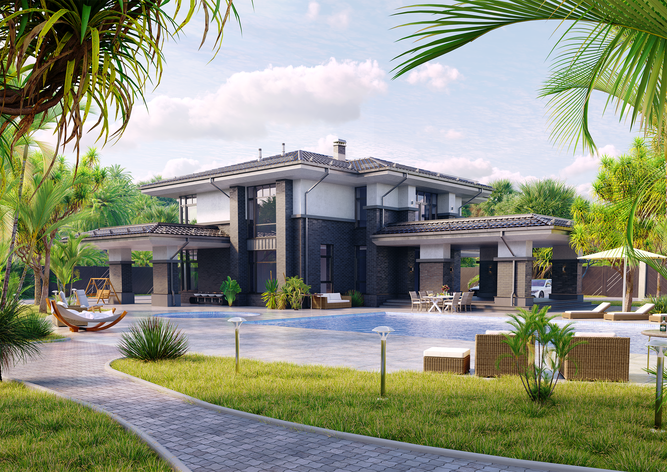 Идея проекта заключается в создании идеального баланса между строгой, современной архитектурой и расслабленной атмосферой тропиков. Фасад дома построен на контрасте: массивный темный кирпич первого уровня придает зданию основательность, а светлая штукатурка второго этажа визуально облегчает конструкцию.