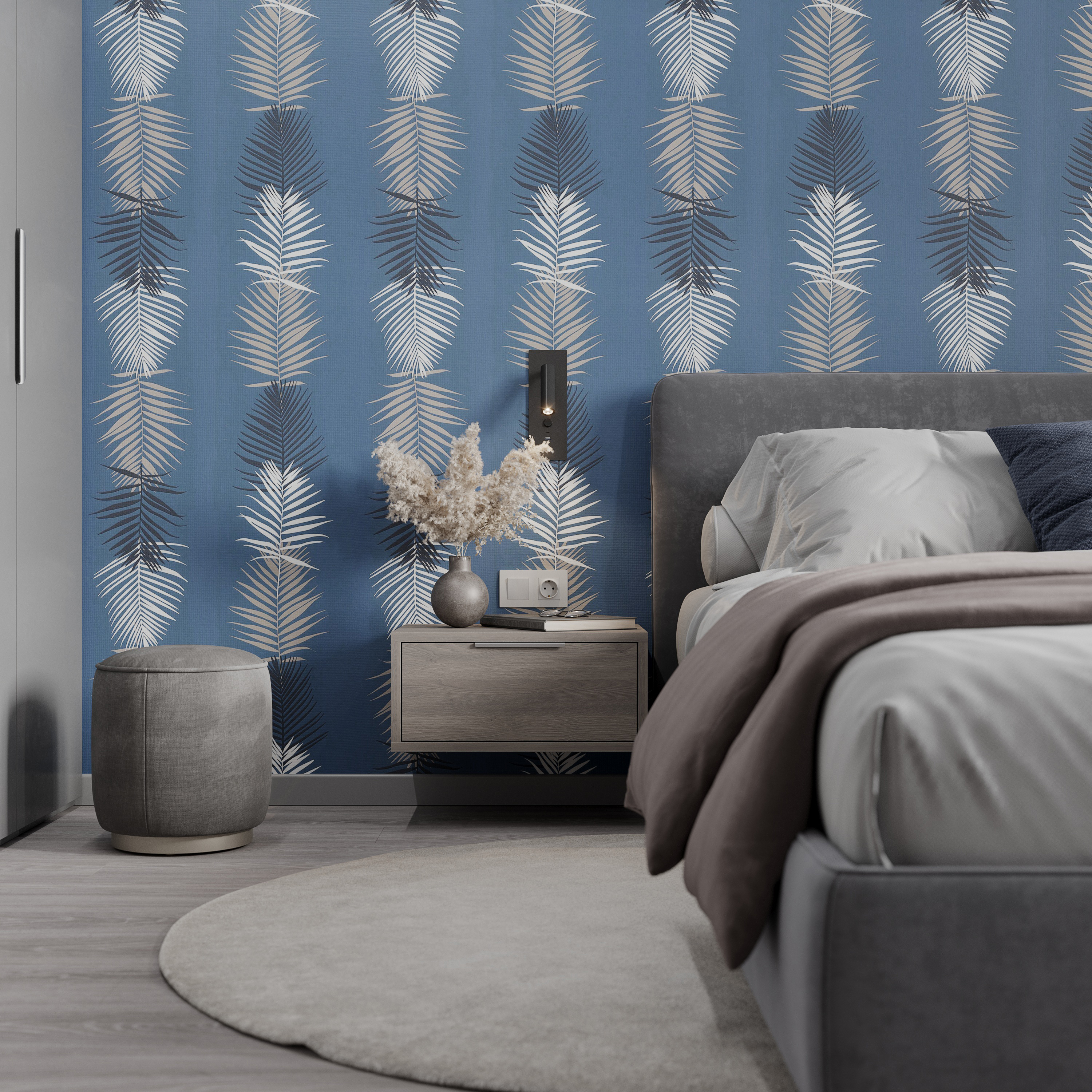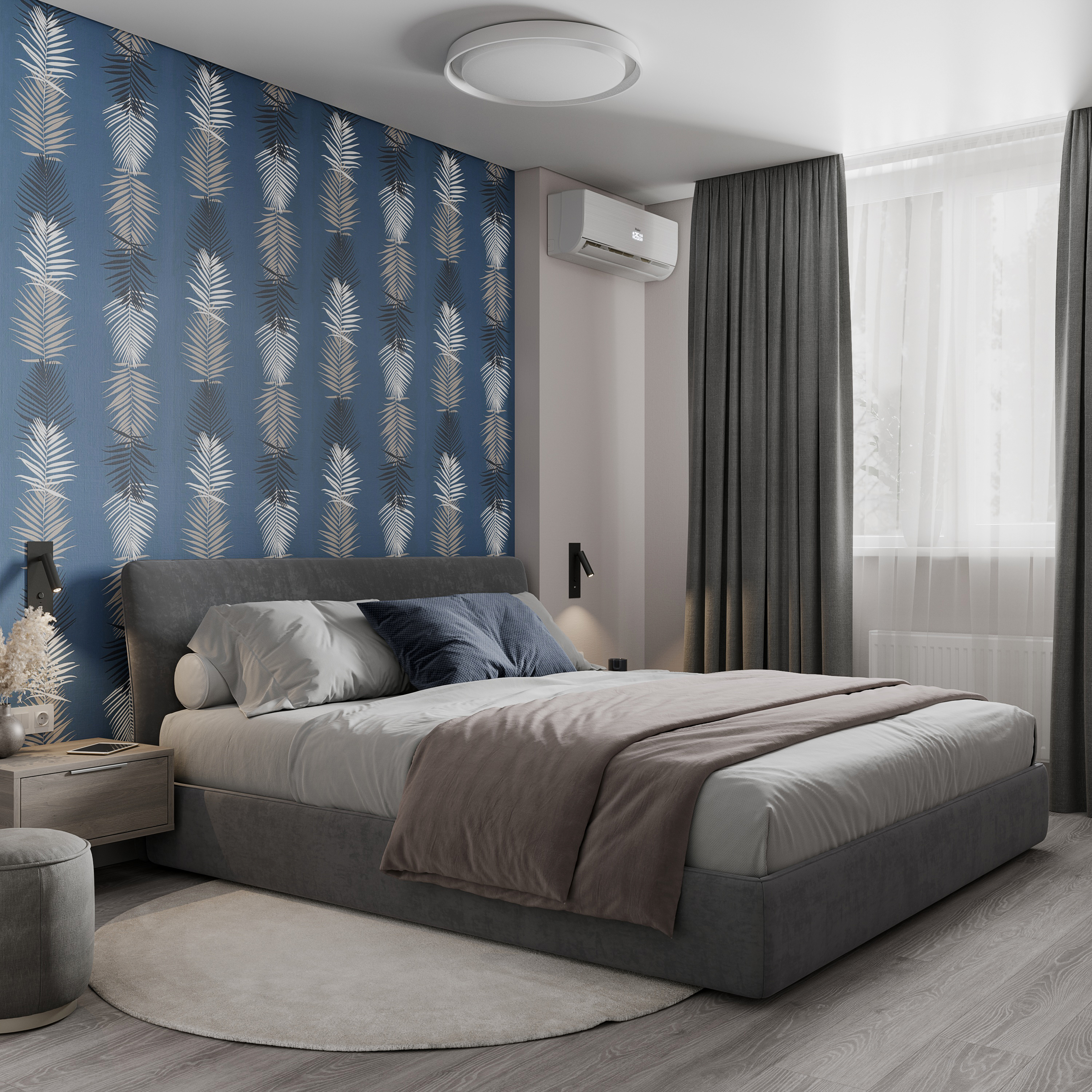 Минималистичная спальня в спокойных приглушенных тонах. Центром этой композиции служит акцентная стена в изголовье кровати с эффектными обоями, украшенными стилизованным принтом в виде пальмовых листьев. Глубокие оттенки синего сочетаются с нейтральной гаммой интерьера, придавая комнате одновременно свежесть и элегантность.