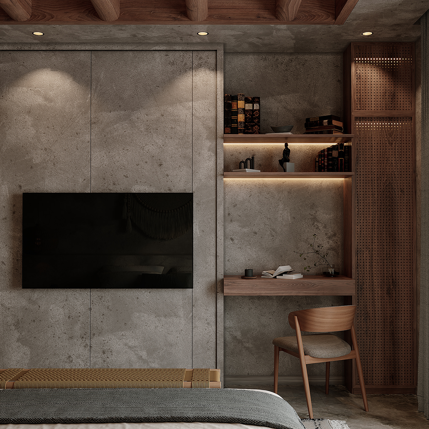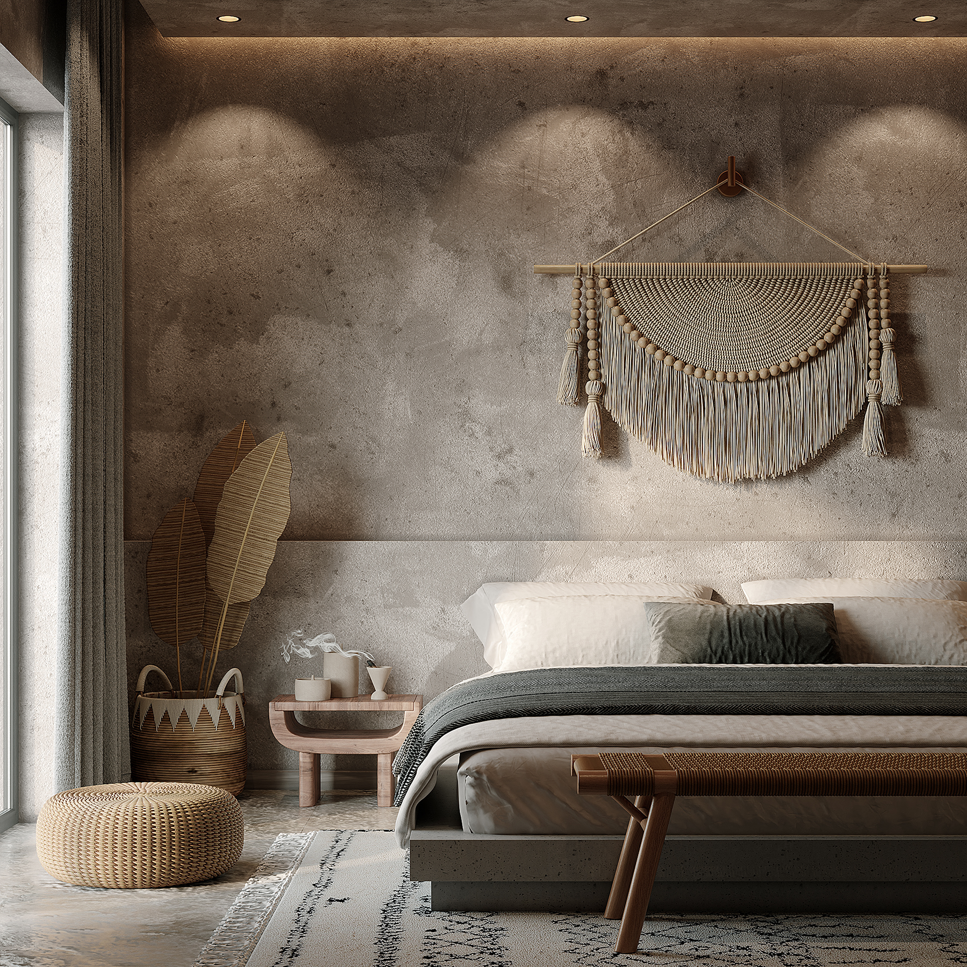 Modern bohemian bedroom design Softs: 3ds Max 2024 Corona render Adobe Photoshop 2024 Contact: