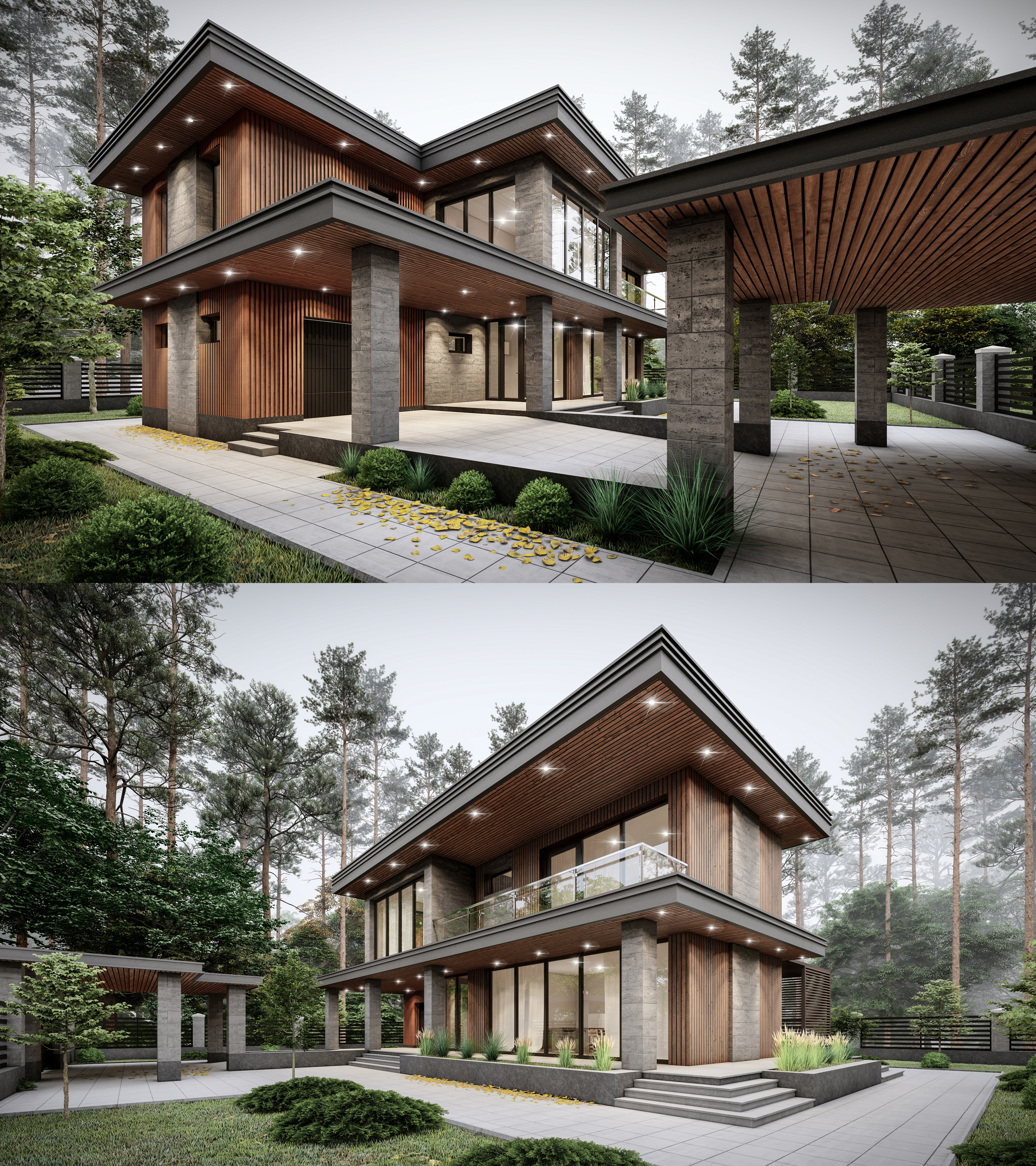 Modern house in a pine forest Фрагменты эскизного проекта современного дома Архитектор: Архитектурное Бюро «FOREST» Визуализация : Темерсултанов Тамерлан Behance: