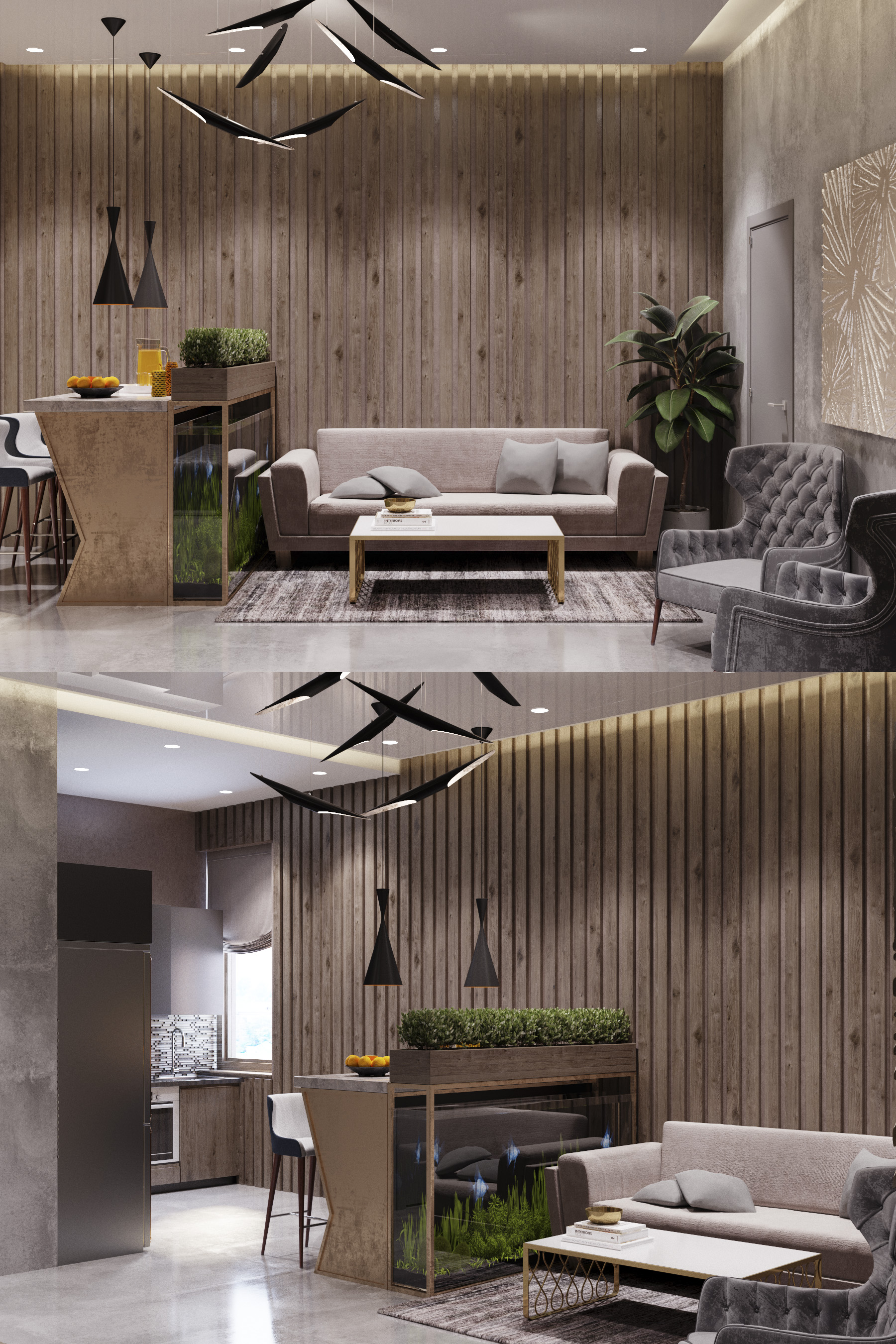 Текстура бетона очень не красиво затайлилась. Или так и задумано? Да и люстра странно расположена. Рядом с подвесами.