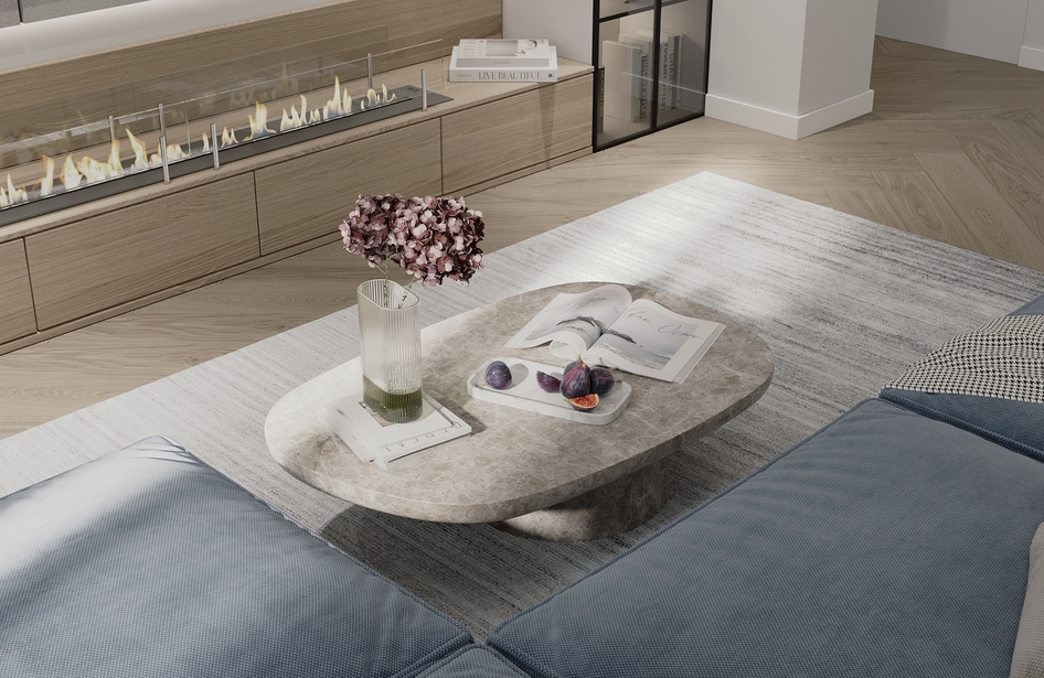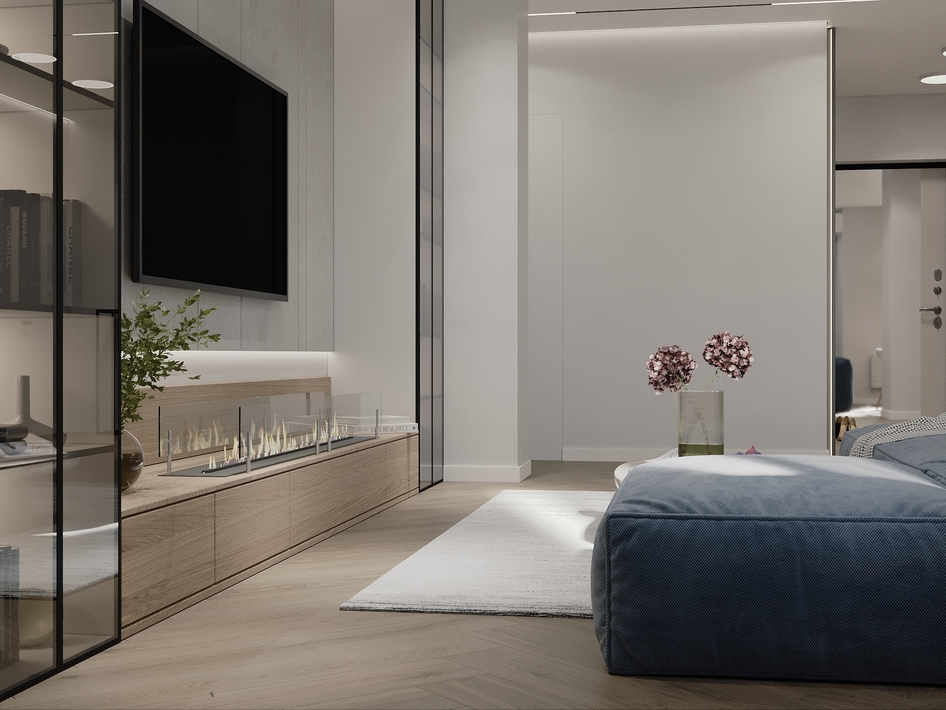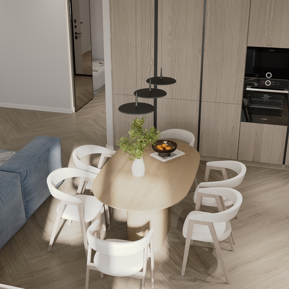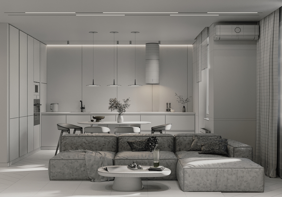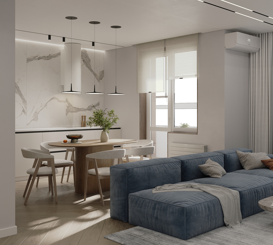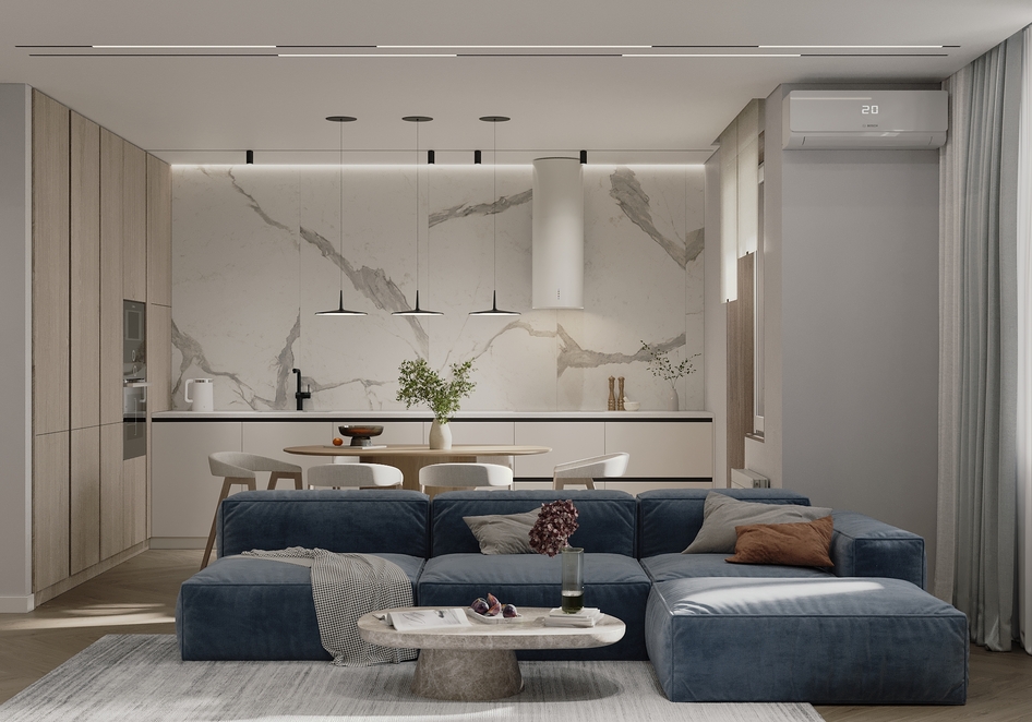 Светлая просторная кухня-гостиная с яркой цветовой доминантой в виде дивана от BOCA ROOM