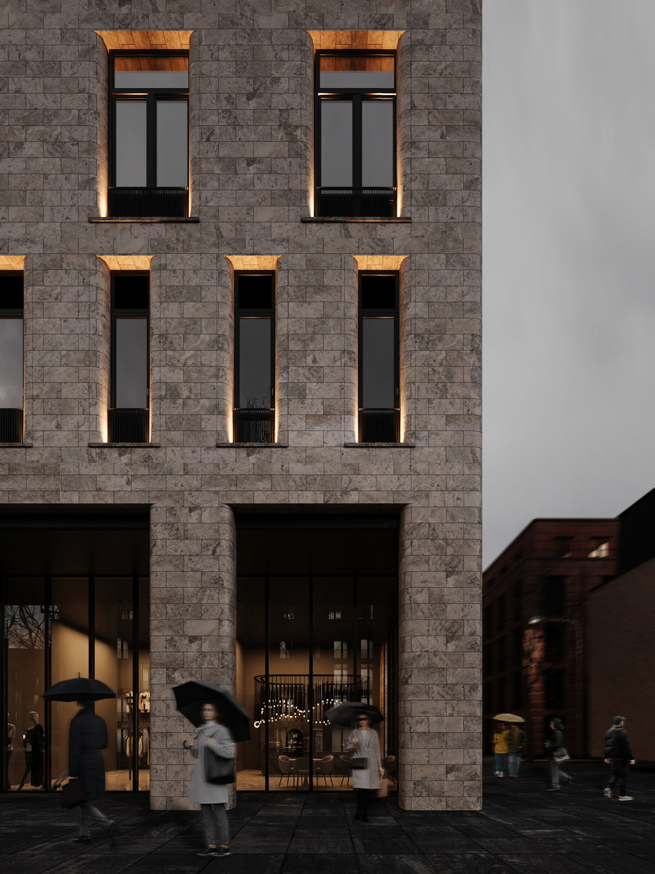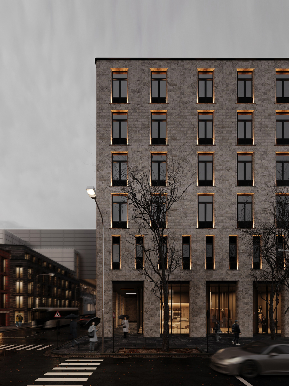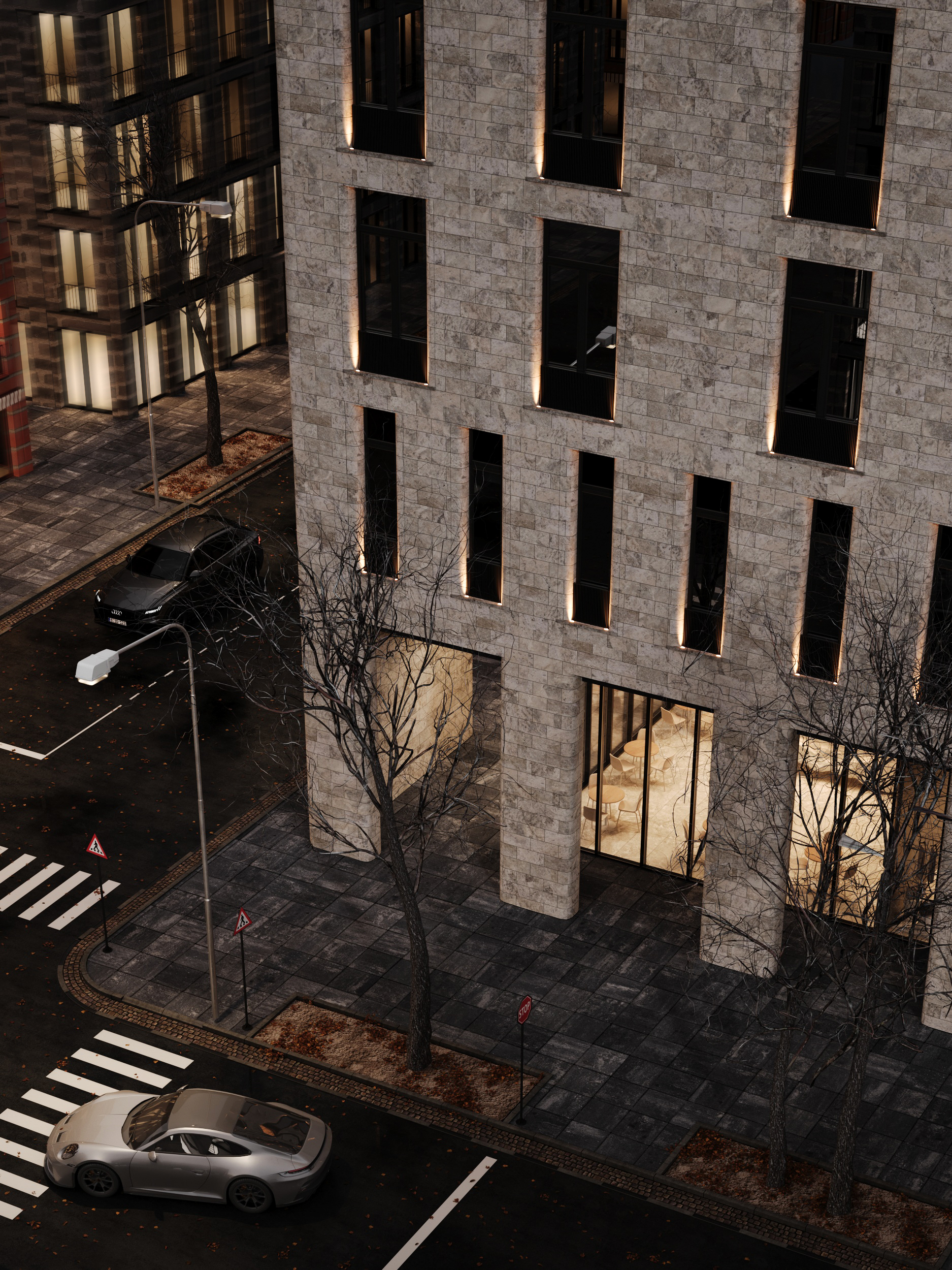 This project showcases a contemporary commercial building with a clean, minimalist aesthetic. The ground floor is designed for retail or hospitality use, featuring an inviting facade with warm integrated lighting that creates a welcoming evening ambiance.