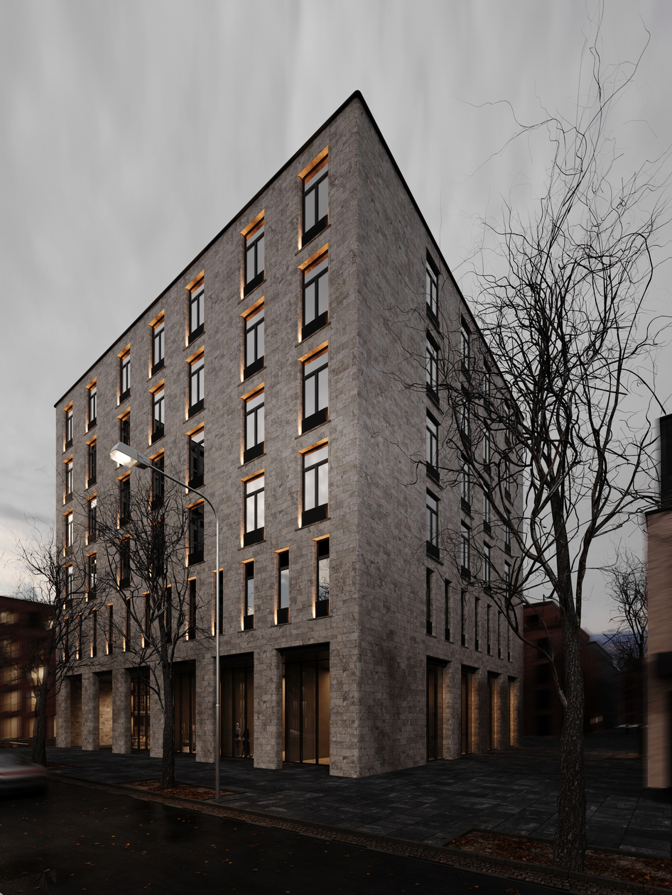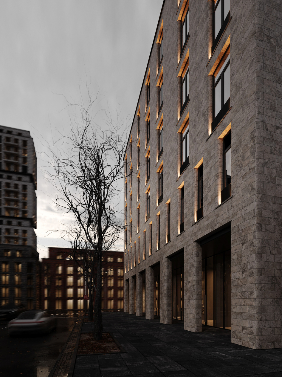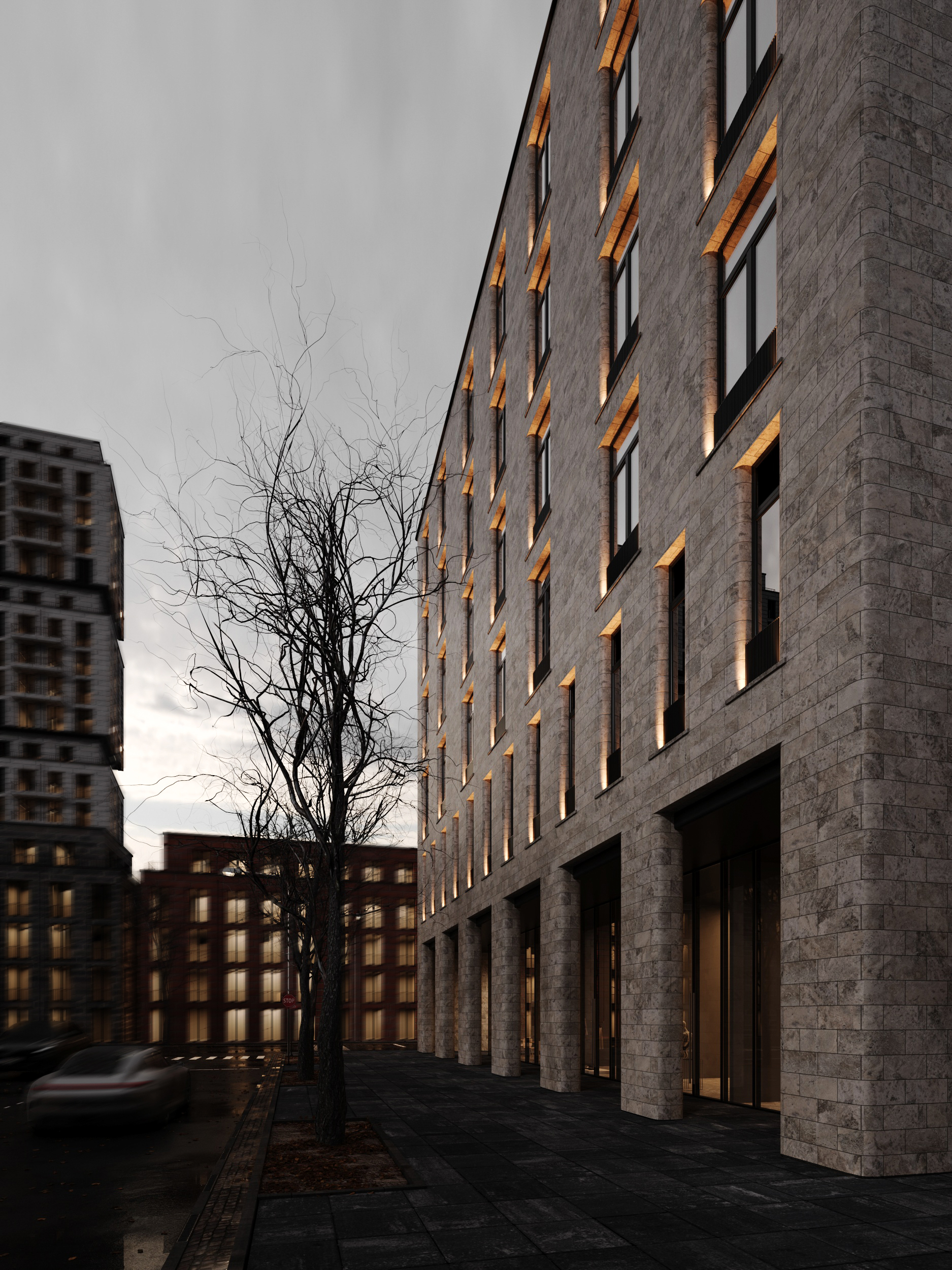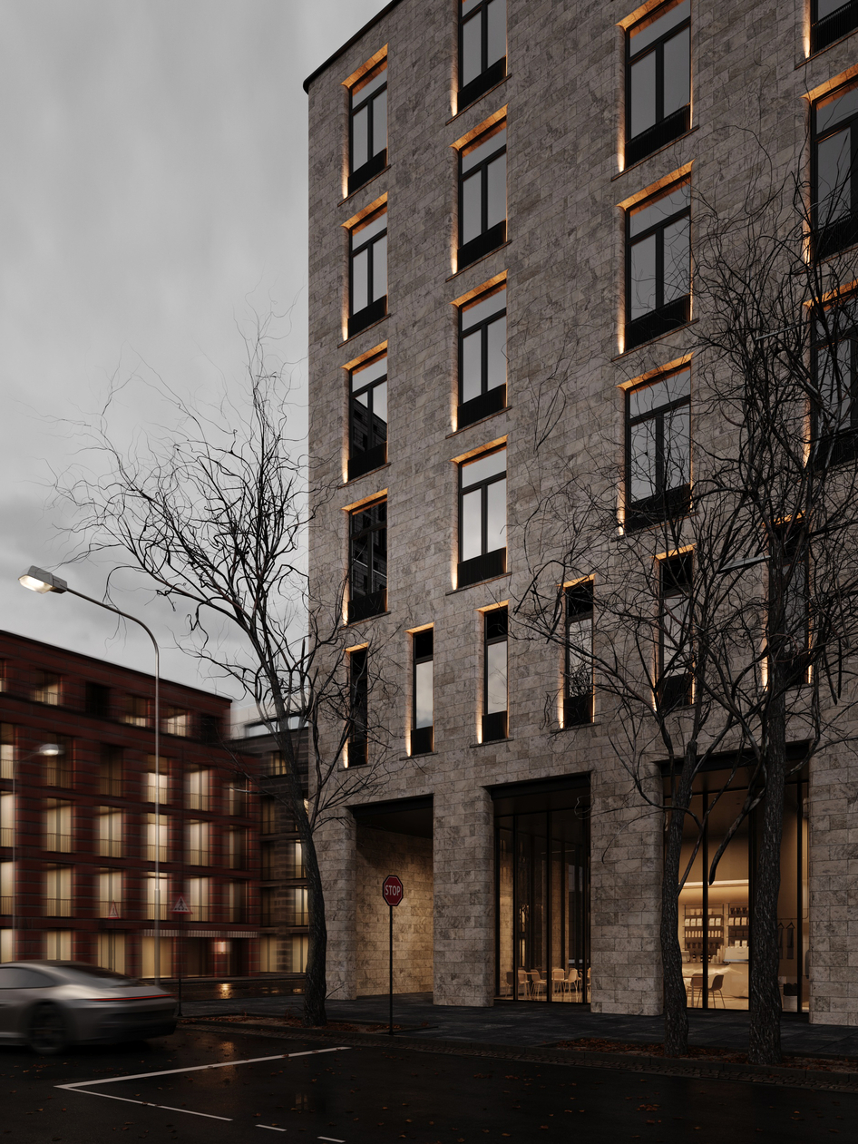 This project showcases a contemporary commercial building with a clean, minimalist aesthetic. The ground floor is designed for retail or hospitality use, featuring an inviting facade with warm integrated lighting that creates a welcoming evening ambiance.