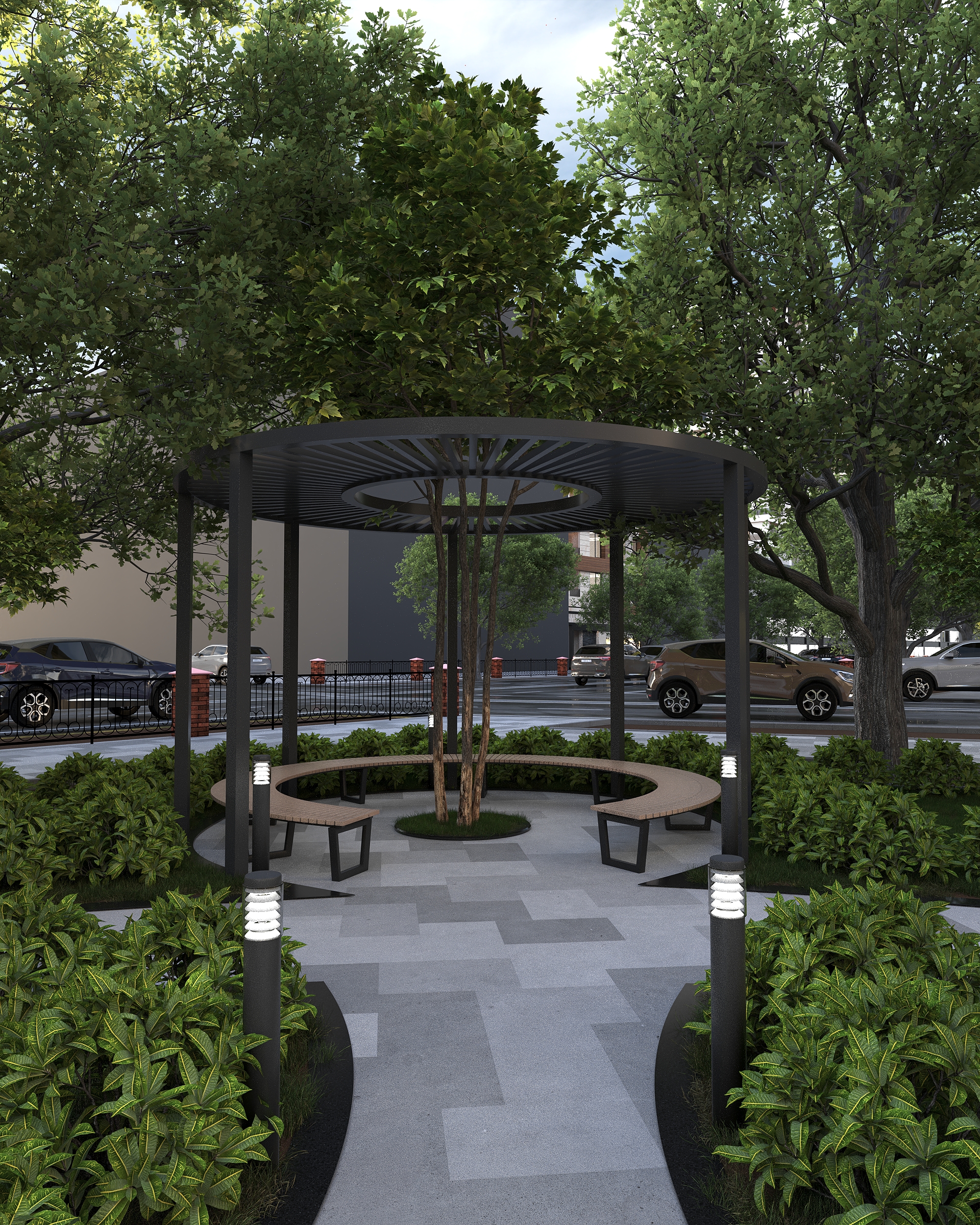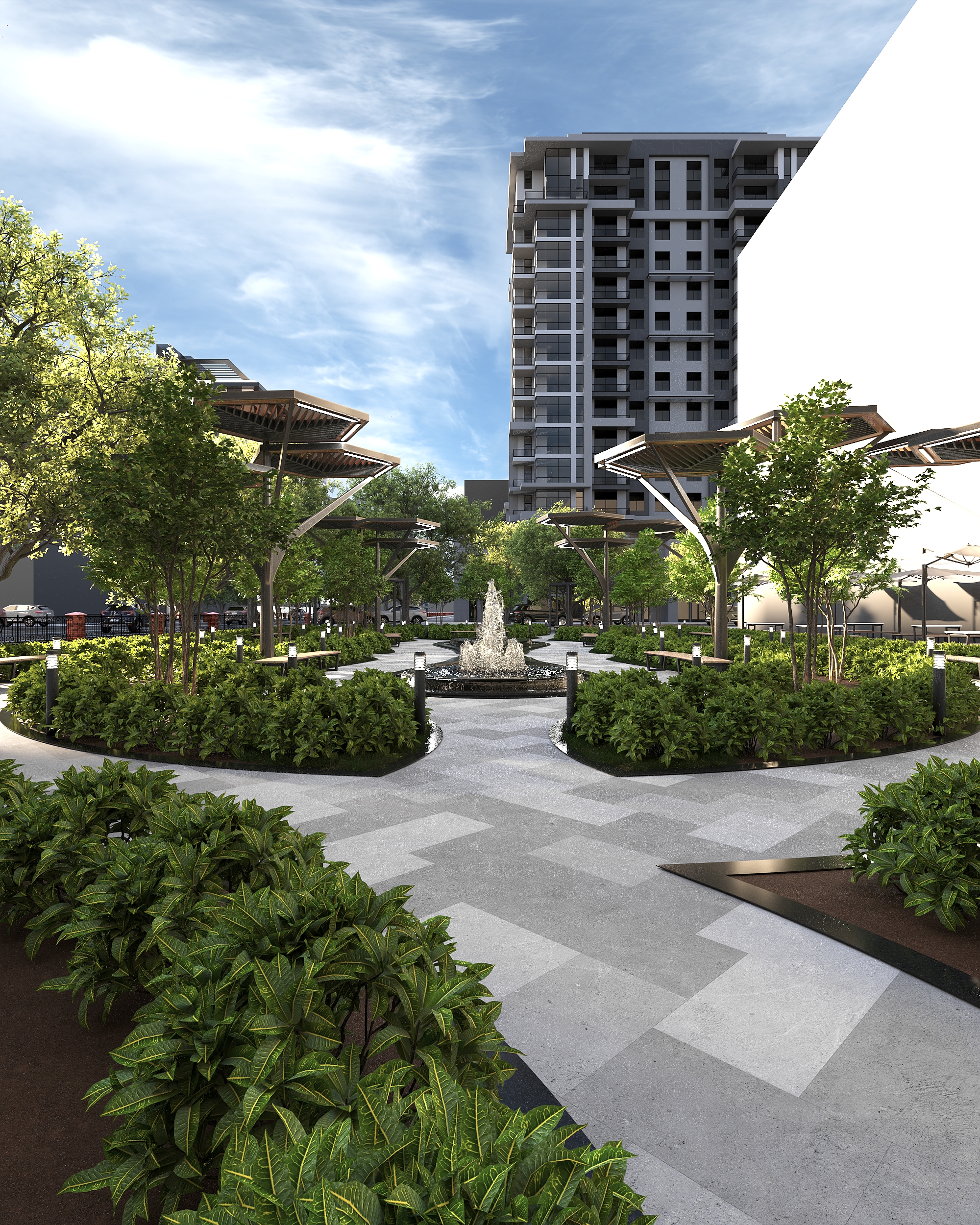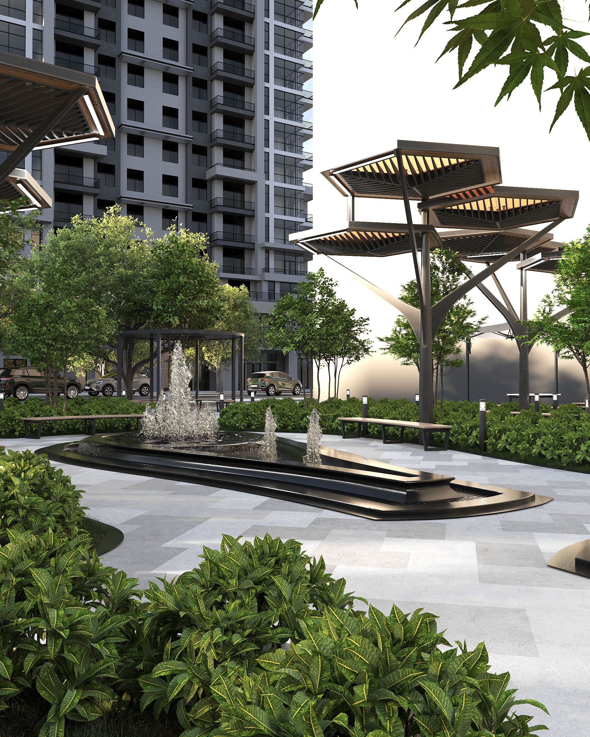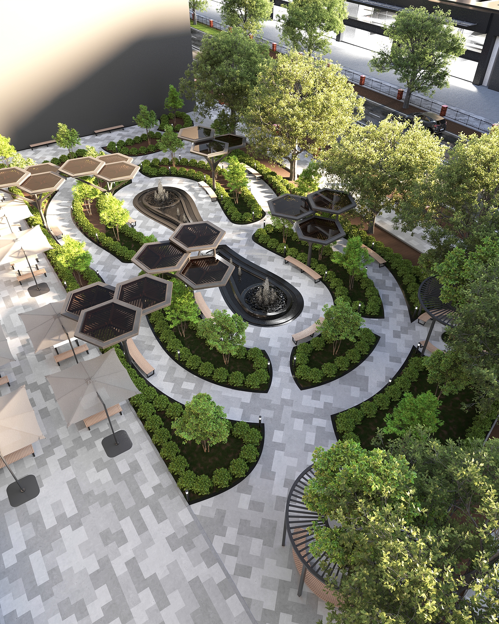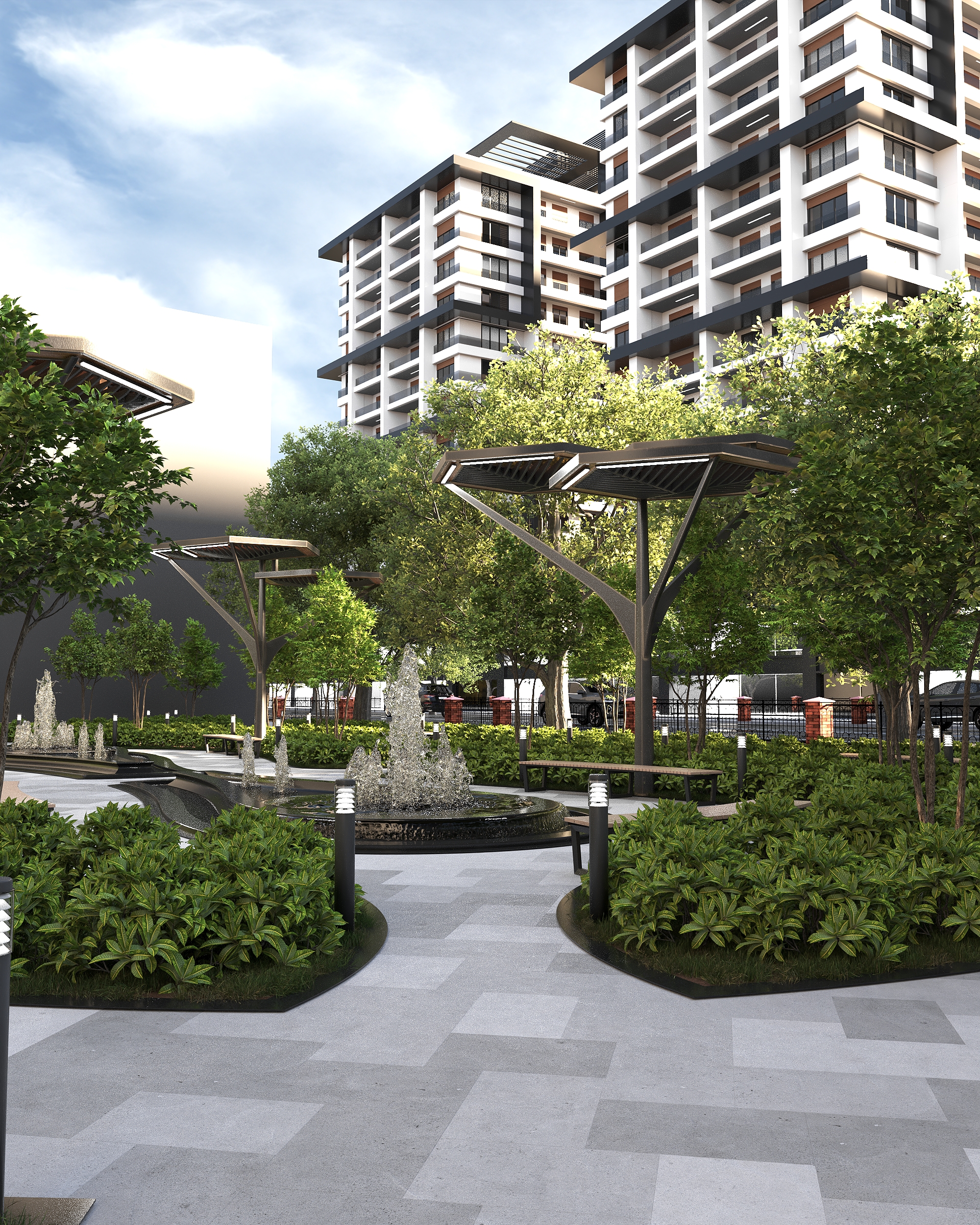 A stylish and modern public recreation area designed for relaxation and social gatherings. The space features a central water fountain surrounded by green landscaping, contemporary seating areas, and geometric paving patterns. Combining nature with urban aesthetics, this design provides a calm and elegant outdoor atmosphere perfect for city residents.