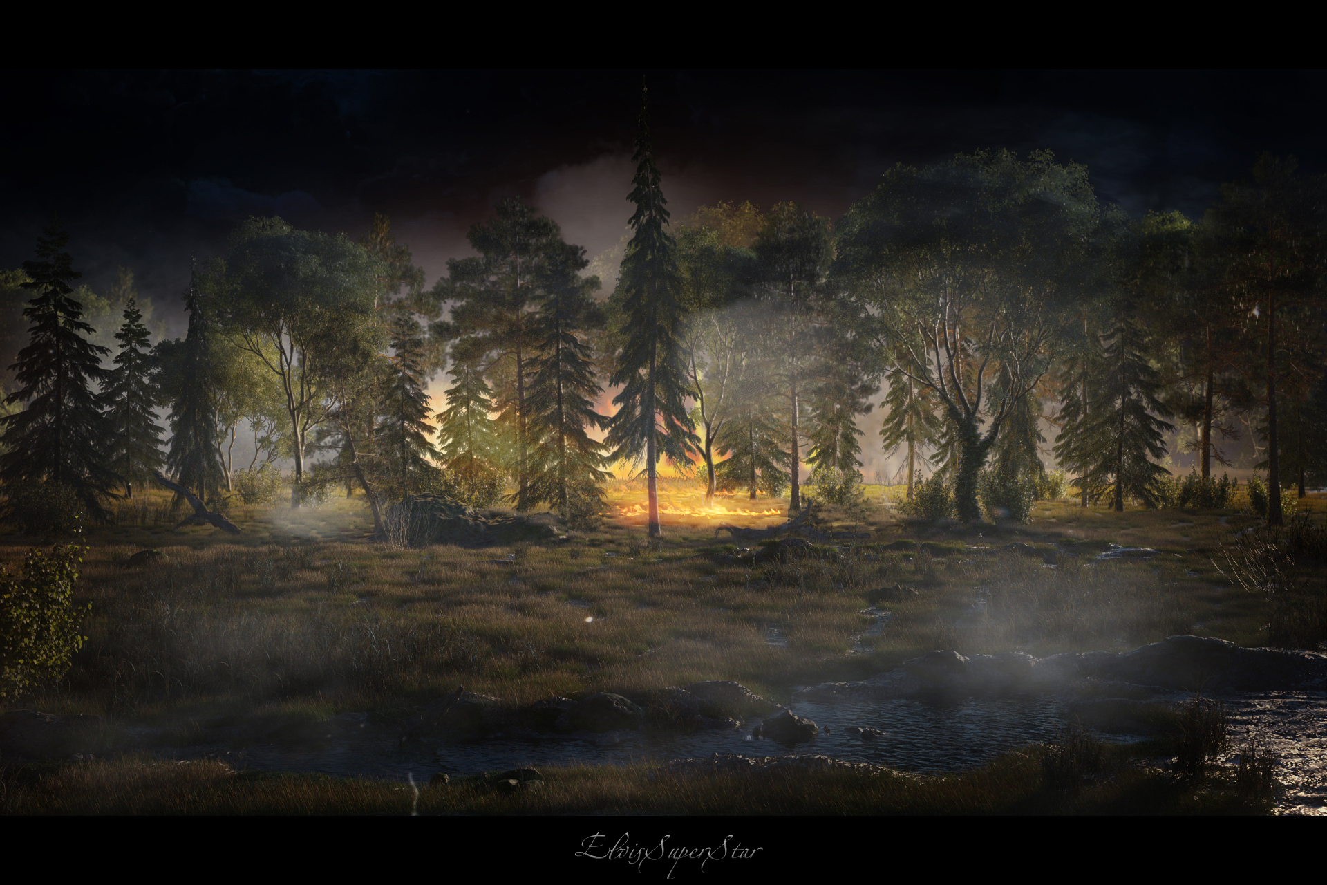 Мне кажется, в реальности больше было бы отсветов пламени на кронах деревьев, чем внизу. Если даже просто костер в лесу жечь, то кроны ярко освещены.