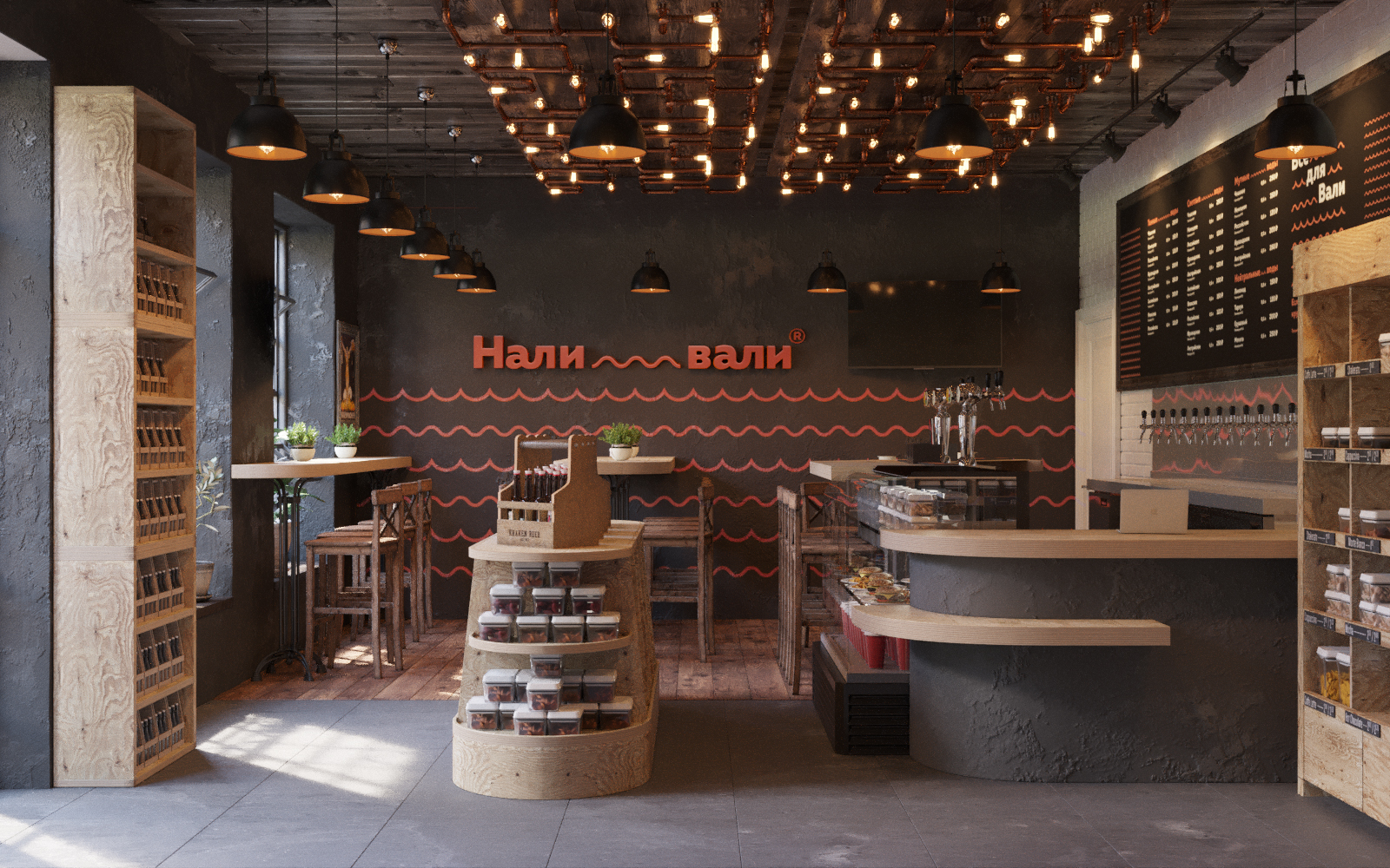 Бетон и тёмное дерево, участвовующие в качестве фонов в рамках фирменного стиля «Нали-вали», разбавлены светлыми поверхностями (фанера, плитка). Таким образом, помещение производит приятное впечатление уютного атмосферного заведения, оставаясь при этом и магазином, куда можно забежать по дороге с работы за разливным пивом и снеками.