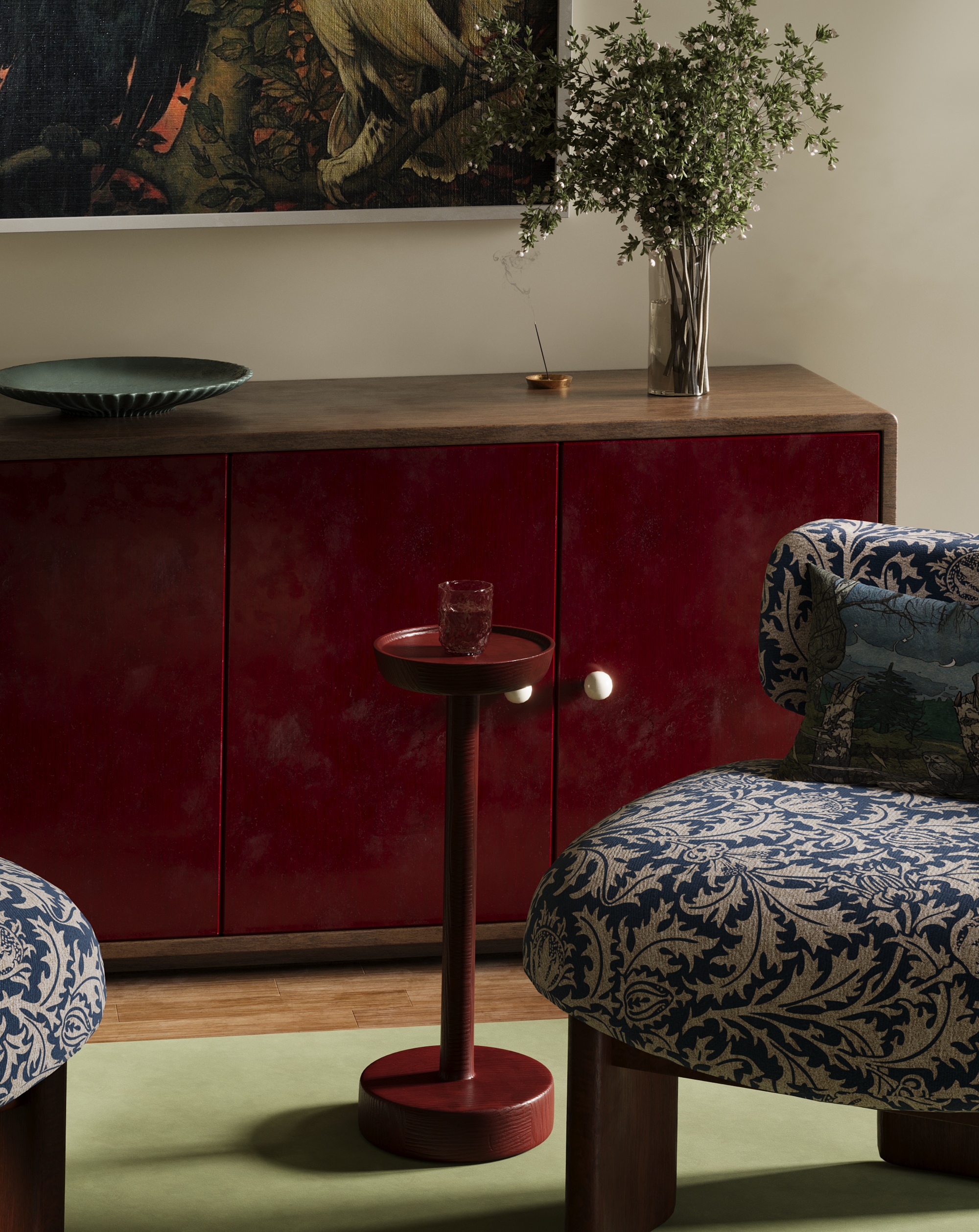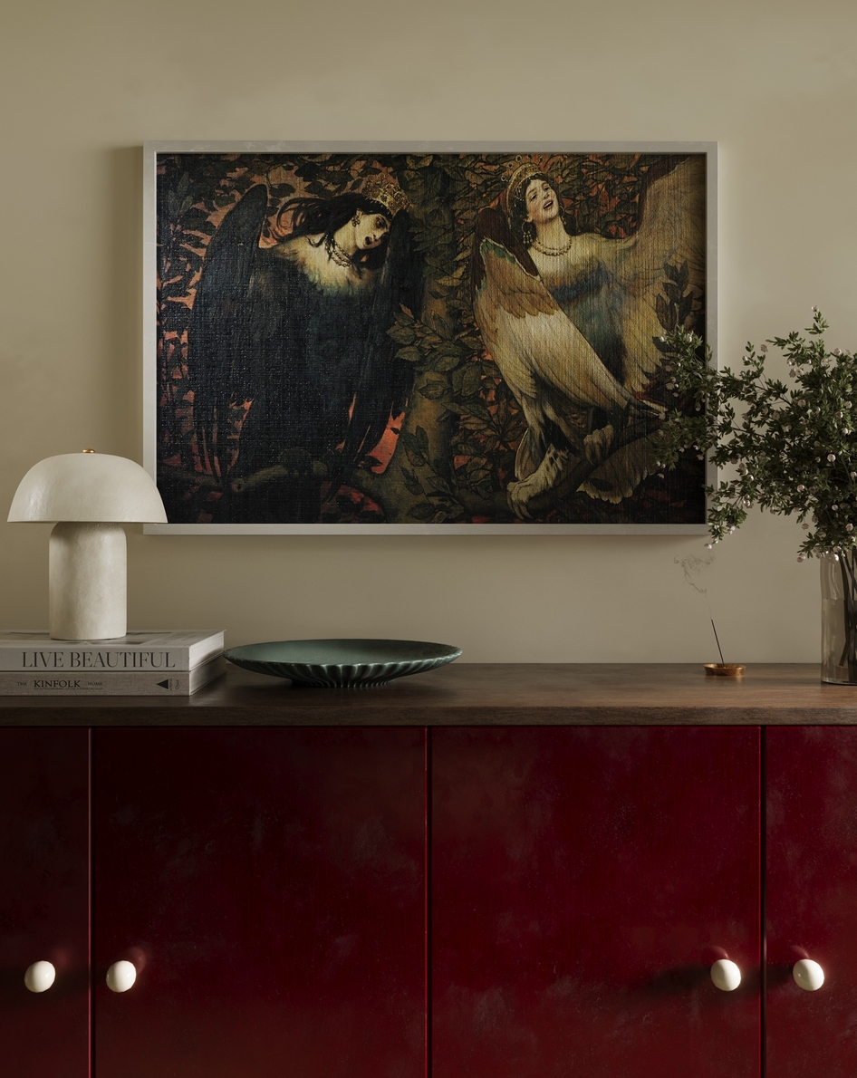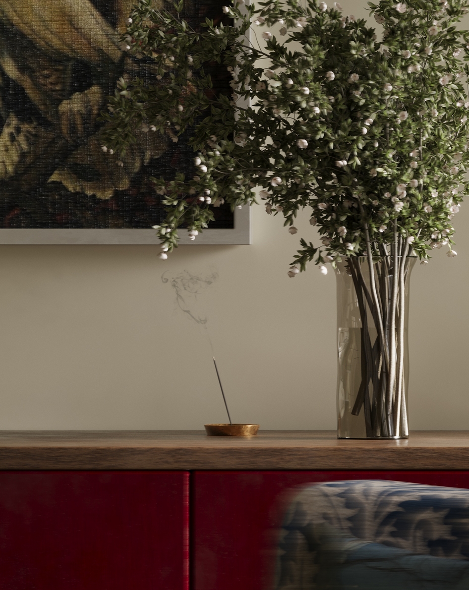 Работа выполнена по референсу. Так как мне хотелось добавить больше колорита и атмосферы, я решила внести изменения в обивку кресел, так же заменила картину на стене и принт подушки