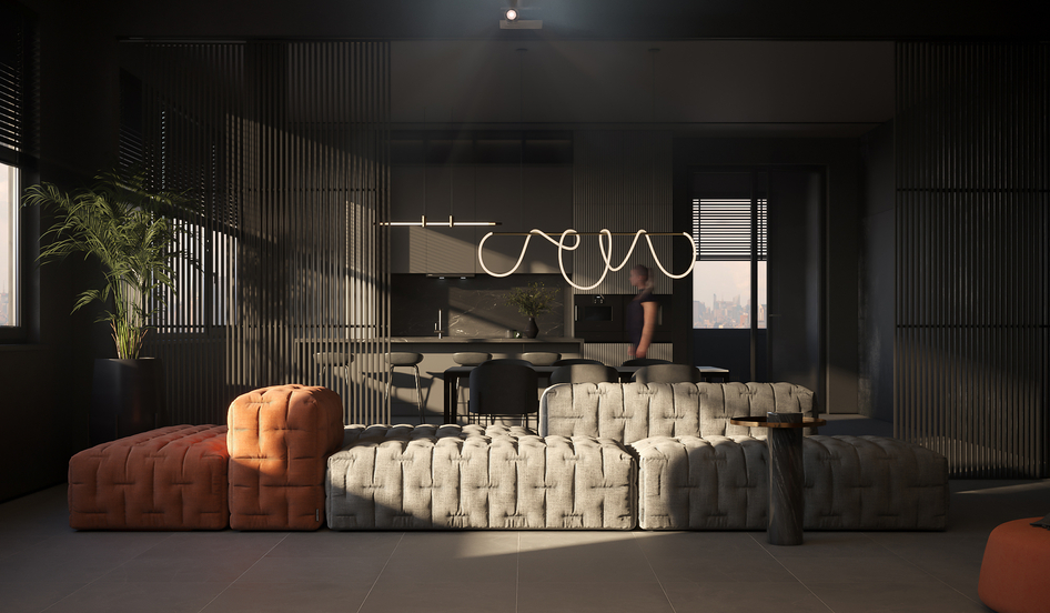 Ощущение пространство и свободы Диван Boca Foo-Five Реечная перегородка Boca Stripe Пуф Boca Pouf Инструменты: 3ds Max, Corona Render, Аdobe Рhotoshop, 2023 My design with an idea: Виктория Толмачева Visualization: Виктория Толмачева Дополнительные ракурсы