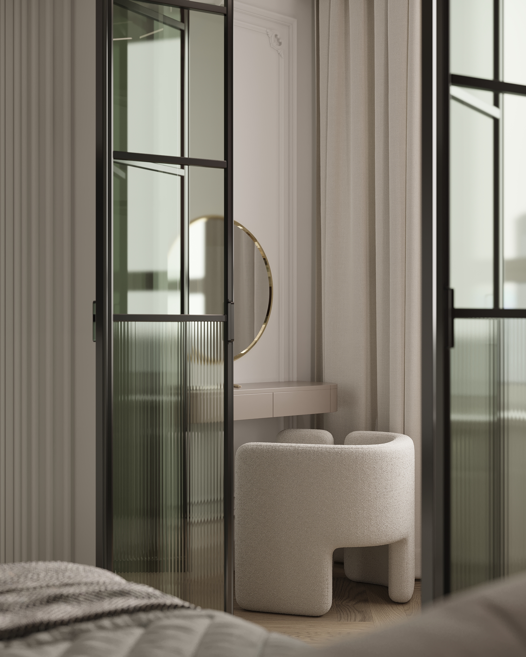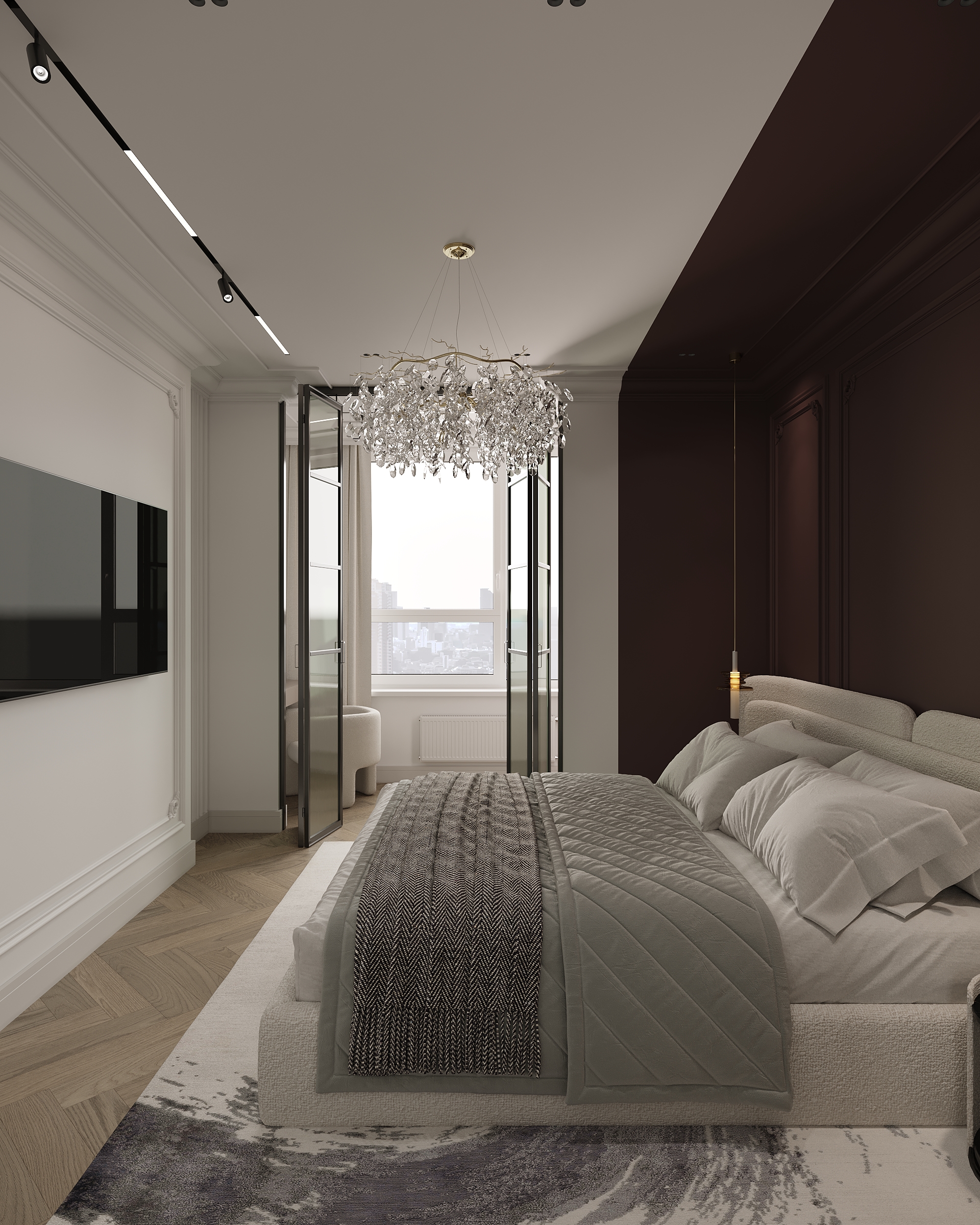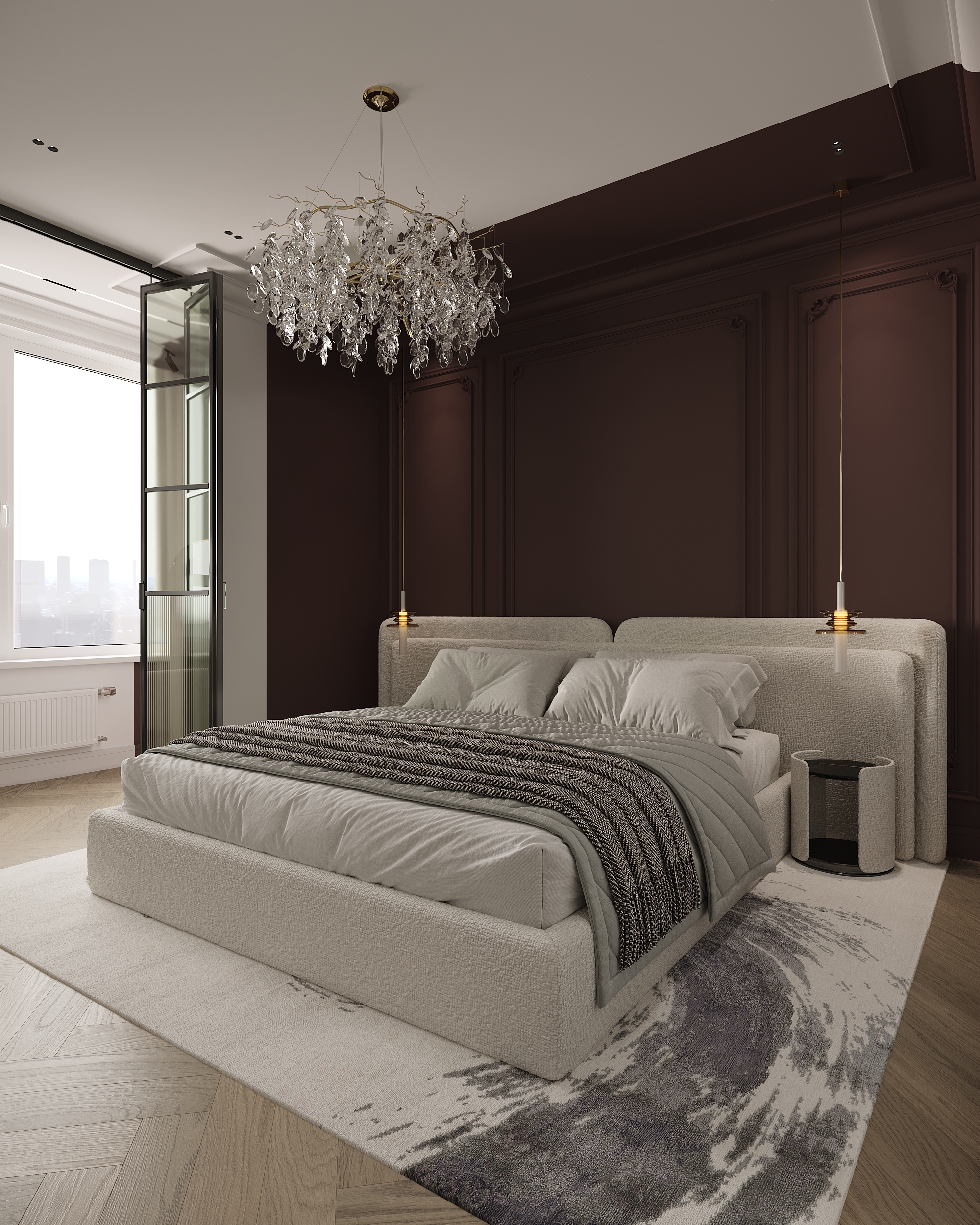 A neoclassical bedroom interior enriched with elegant red accents. The harmonious balance of refined colors, symmetry, and delicate details creates a cozy yet luxurious atmosphere. The design focuses on the interplay of color, texture, and lighting to achieve a timeless and sophisticated look