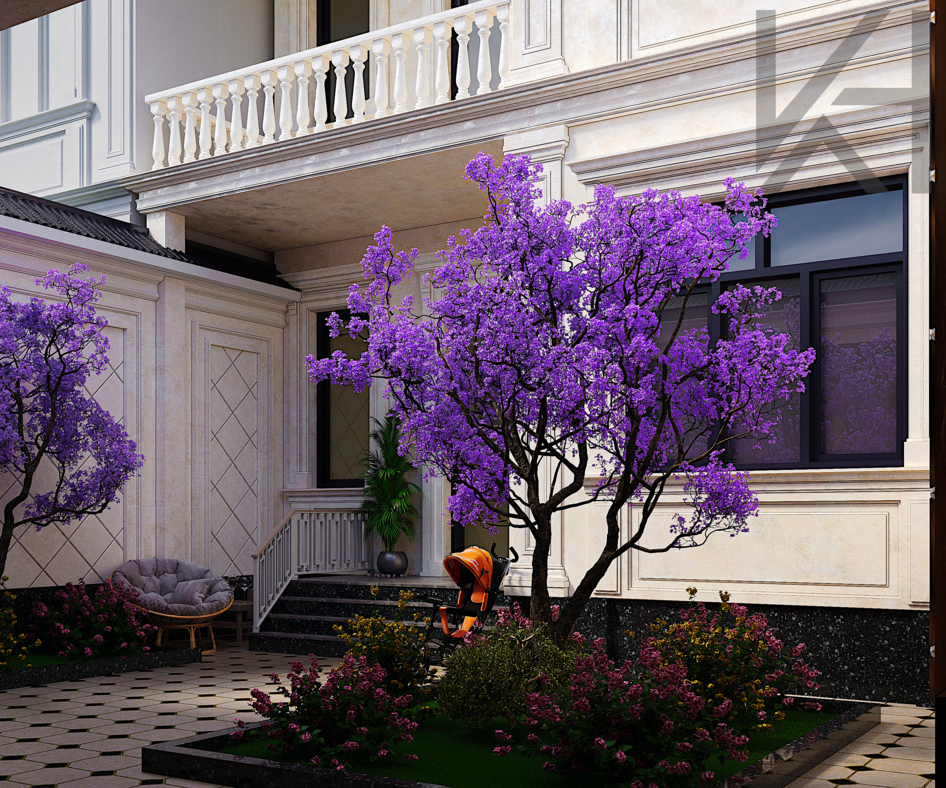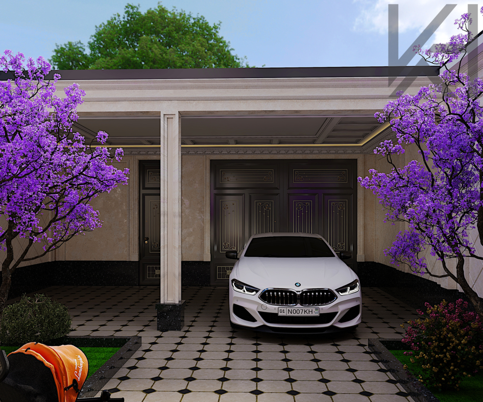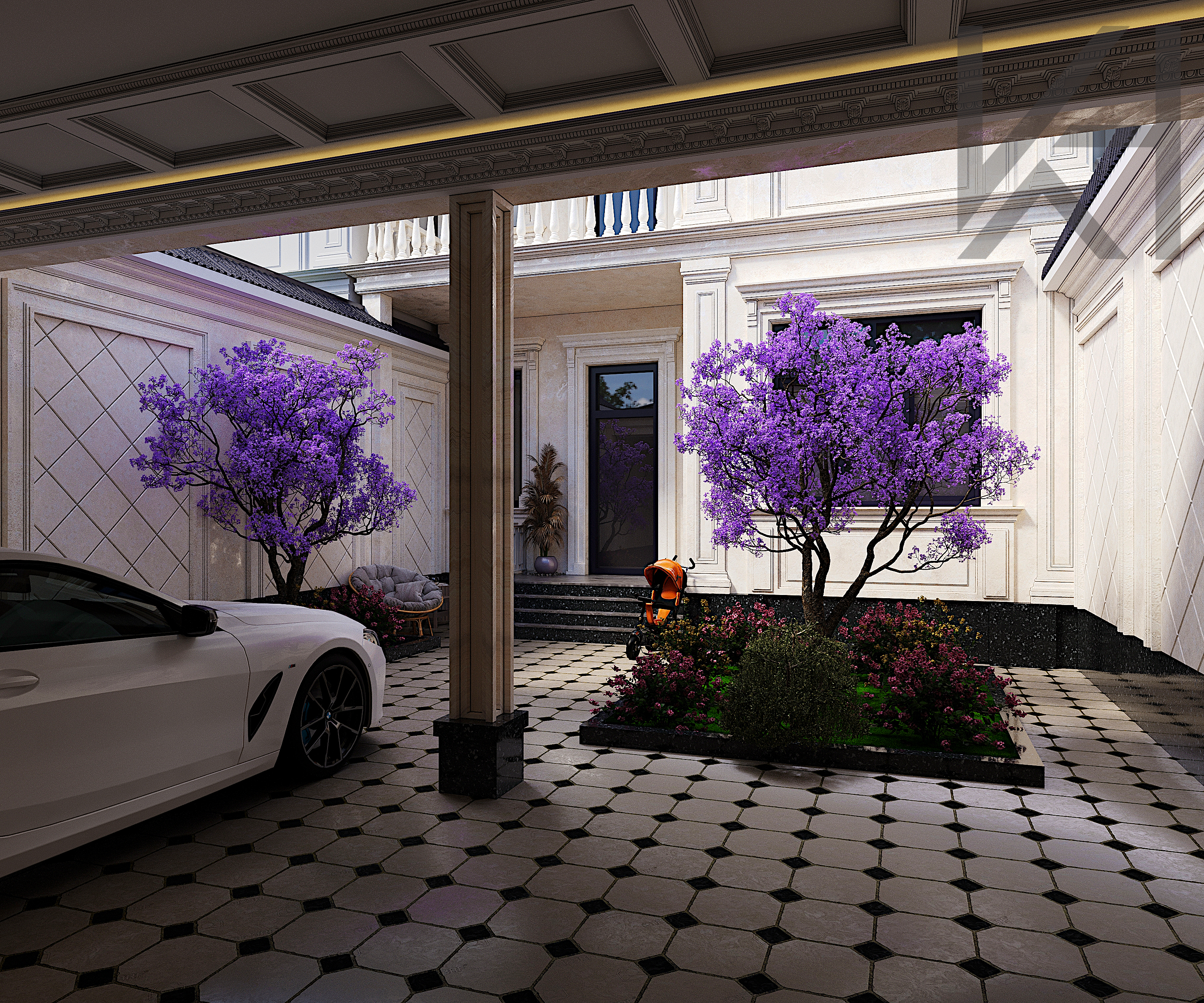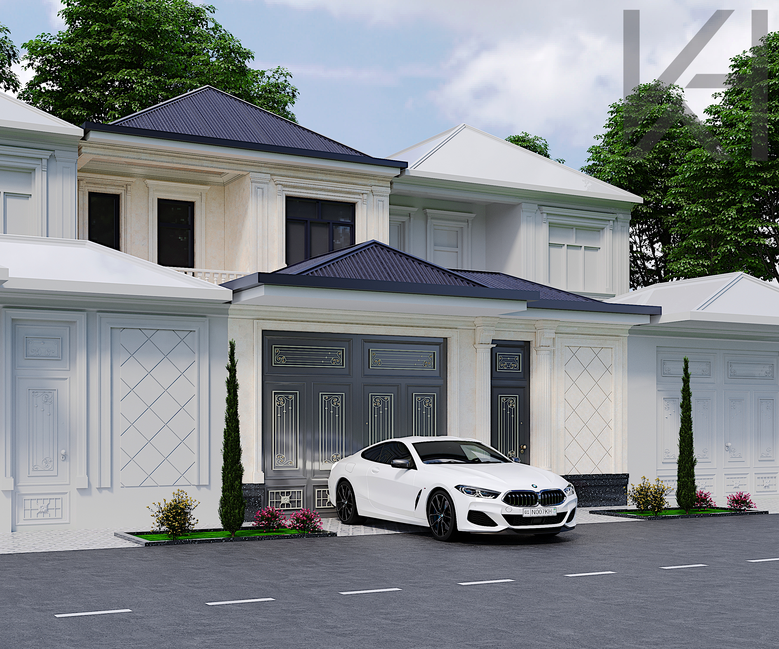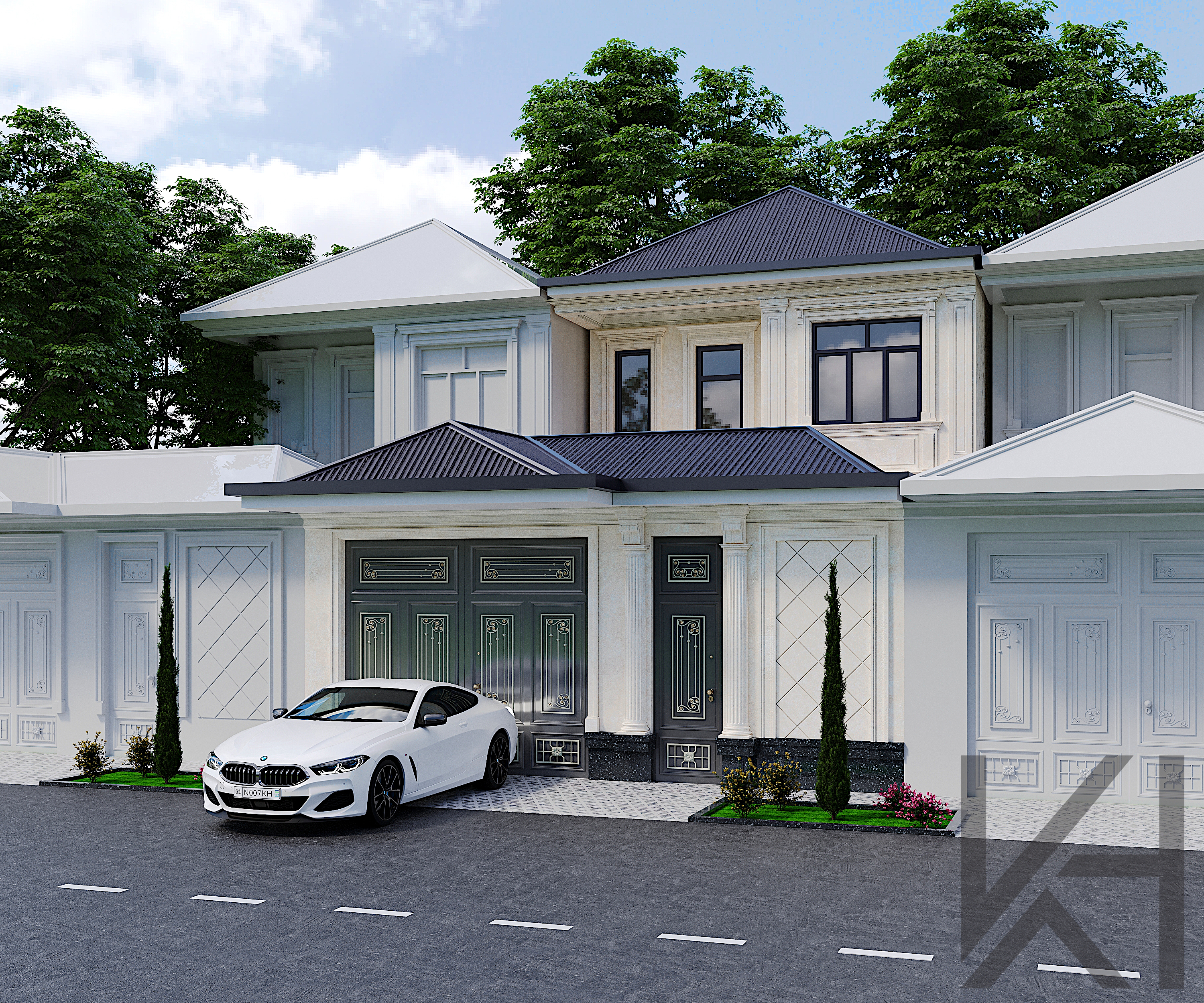 Neoclassical house exterior. Elegant facade with classical elements, modern proportions and neutral colors. Perfect for architectural visualization and exterior scenes.