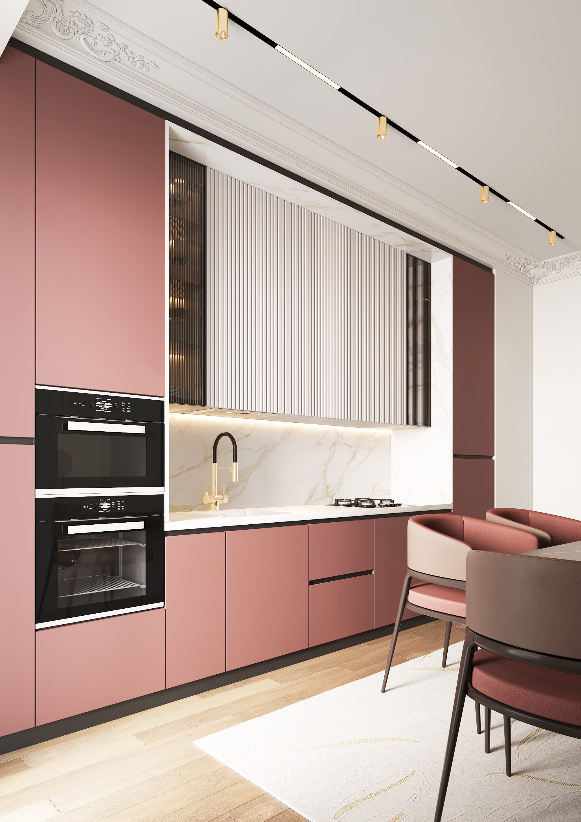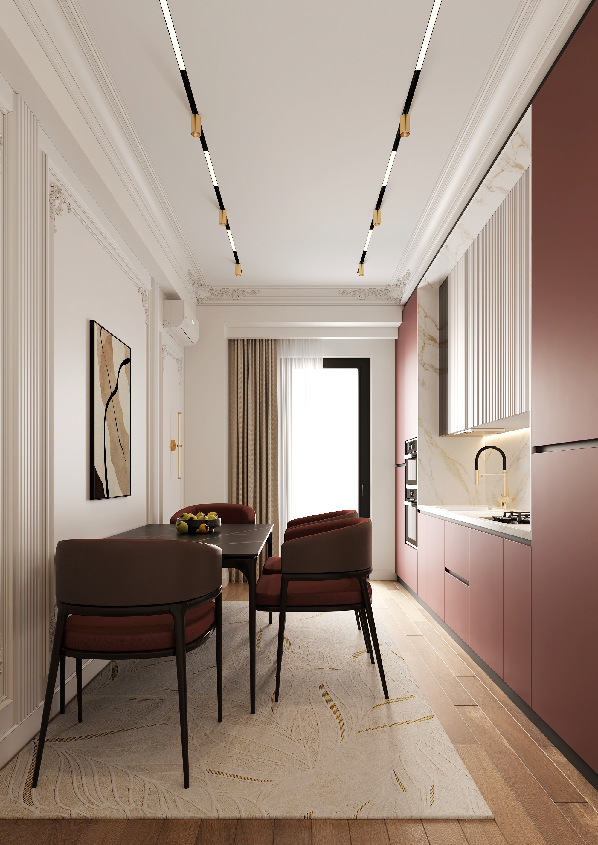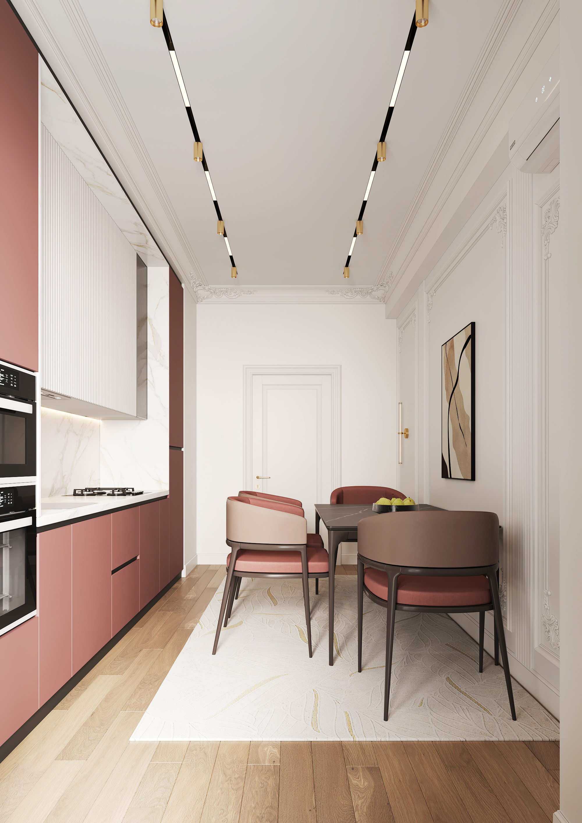 Neoclassical kitchen interior. Soft color palette, moldings, classic forms and modern materials. Visualization created in a calm luxury neoclassic style with an emphasis on light, textures and elegant details