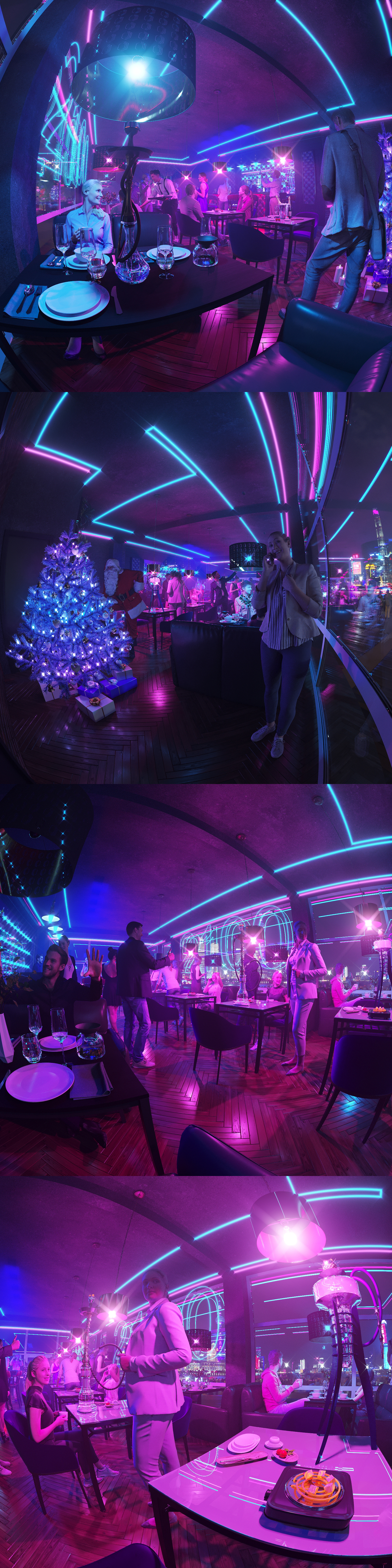 А мне кажется, что в будущем будут роботы, виртуальна реальность и все остальное, но некоторые люди будут праздновать новый год по старинке, в уютном баре, возможно с элементами дизайна будущего...)