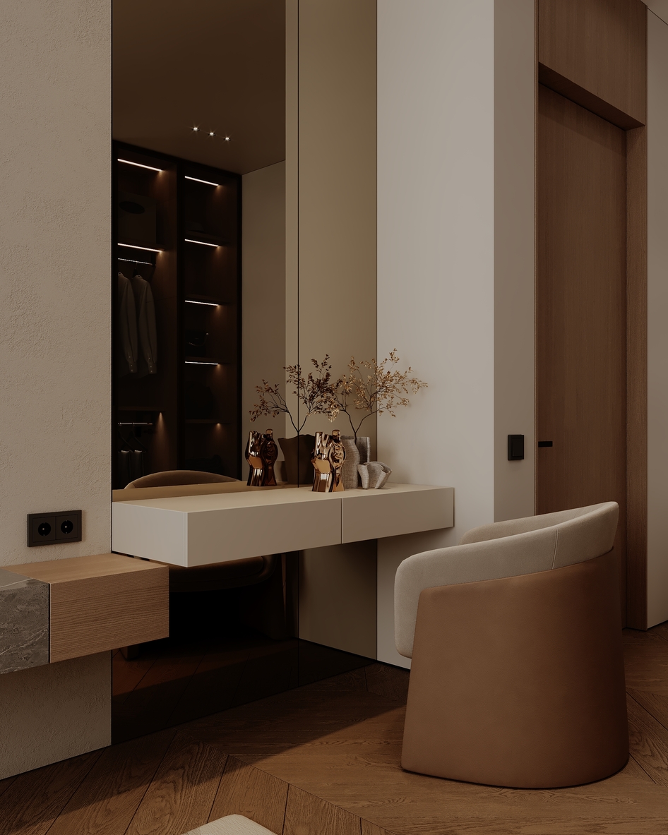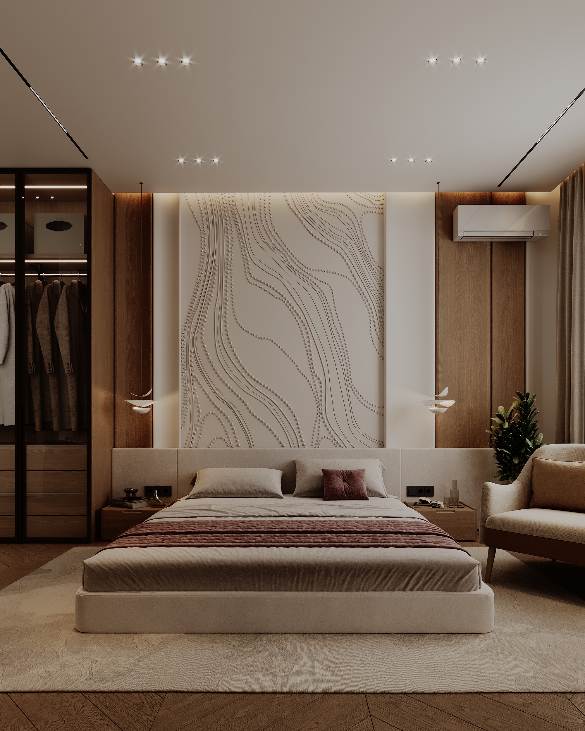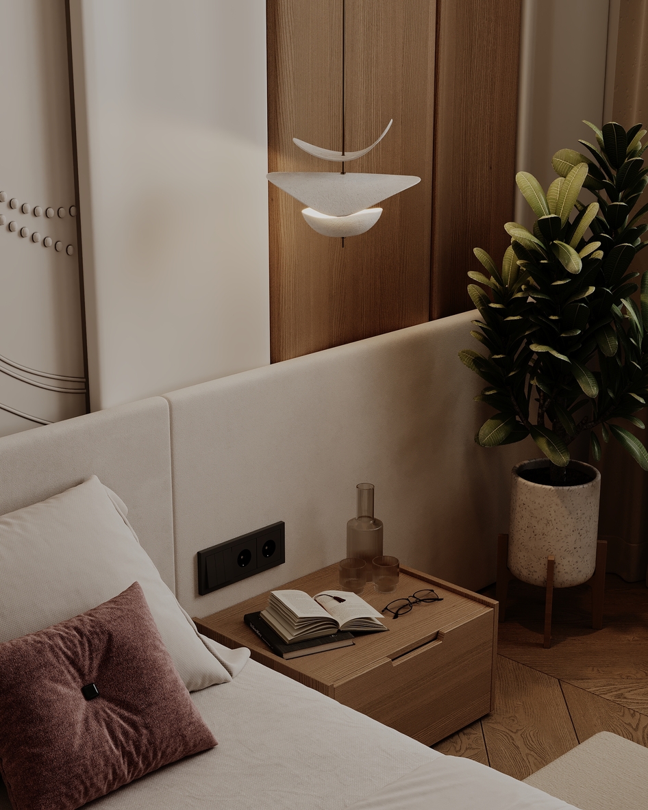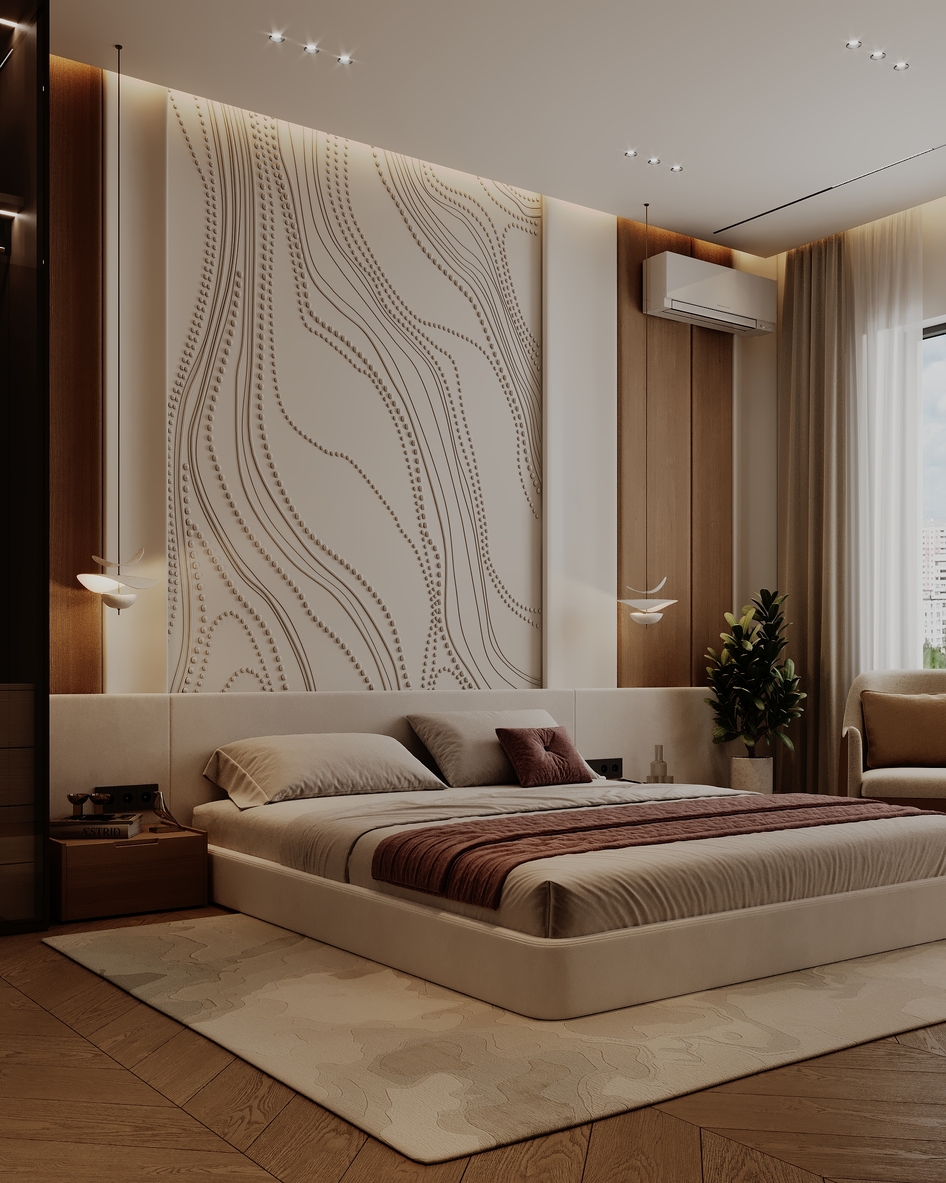 Представляем новый проект — современный дизайн спальни, где гармония достигается за счет сочетания минималистичных форм и богатых текстур