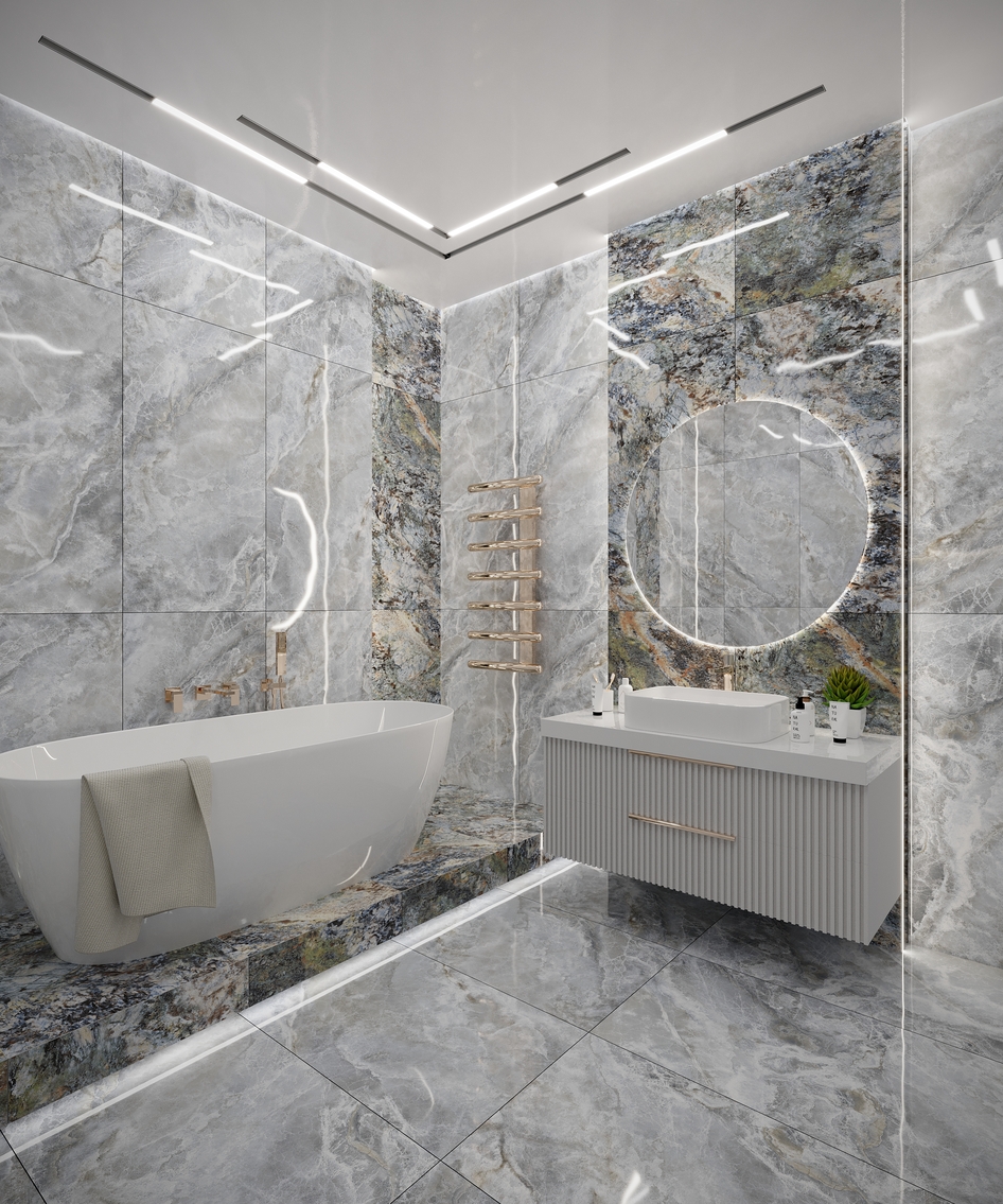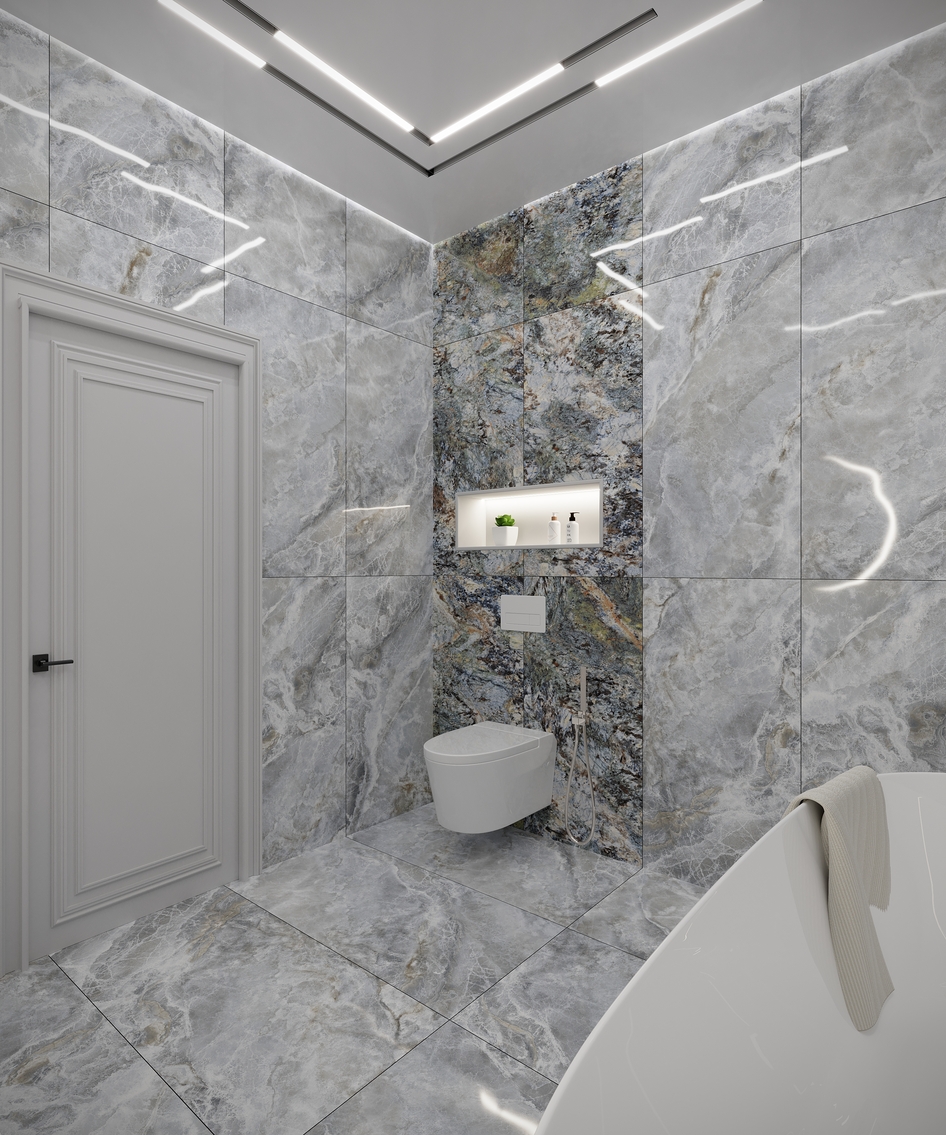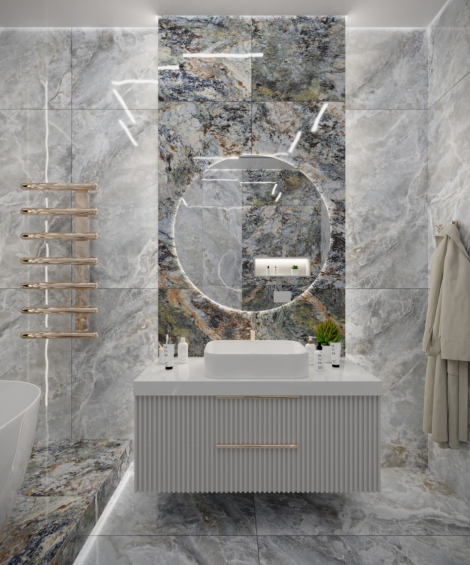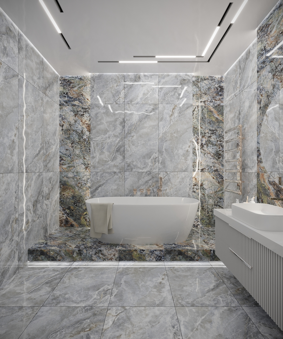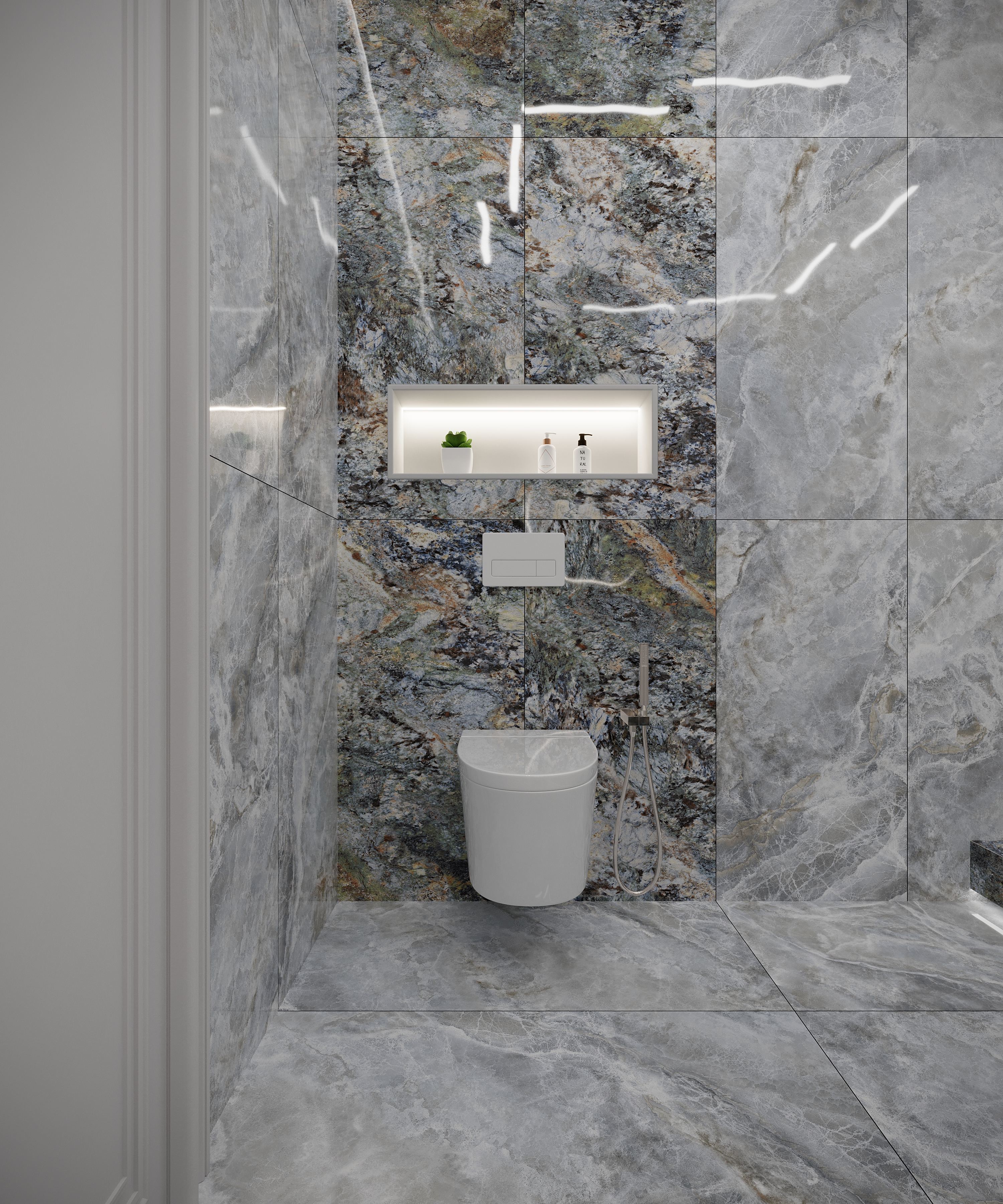 В итоге получилось выразительное и цельное пространство, где холодные оттенки и насыщенные прожилки создают ощущение глубины и текучести. Первая плитка создает ощущение воды, что находится где-то глубоко в океане, а вторая плитка еще больше подчеркивает эффект от первой, создавая вид дна океана.