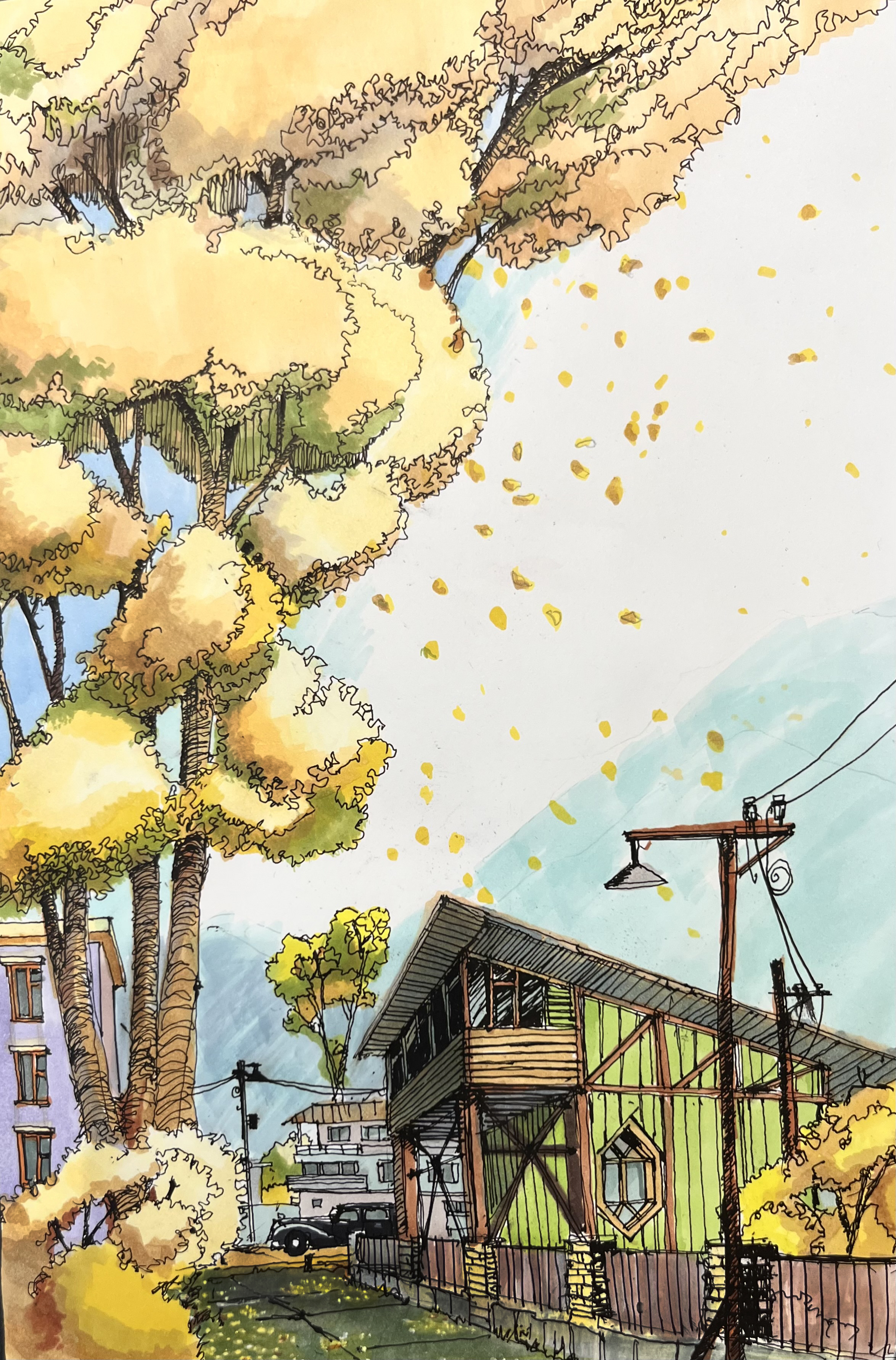 Осень за городом. Бумага, маркеры.