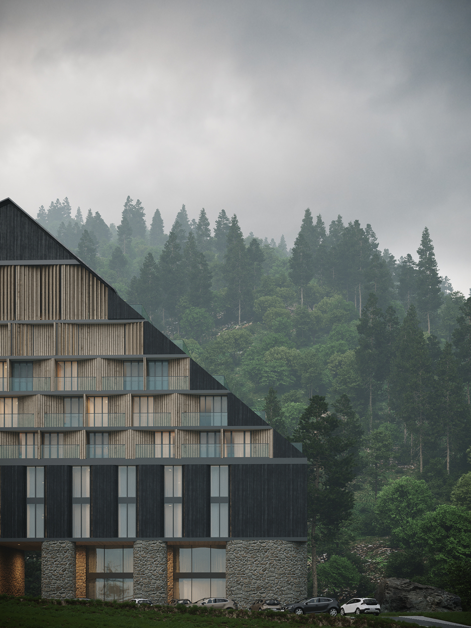 Визуализация отеля в Жигулёвских горах в национальном парке Самарская Лука. Be: