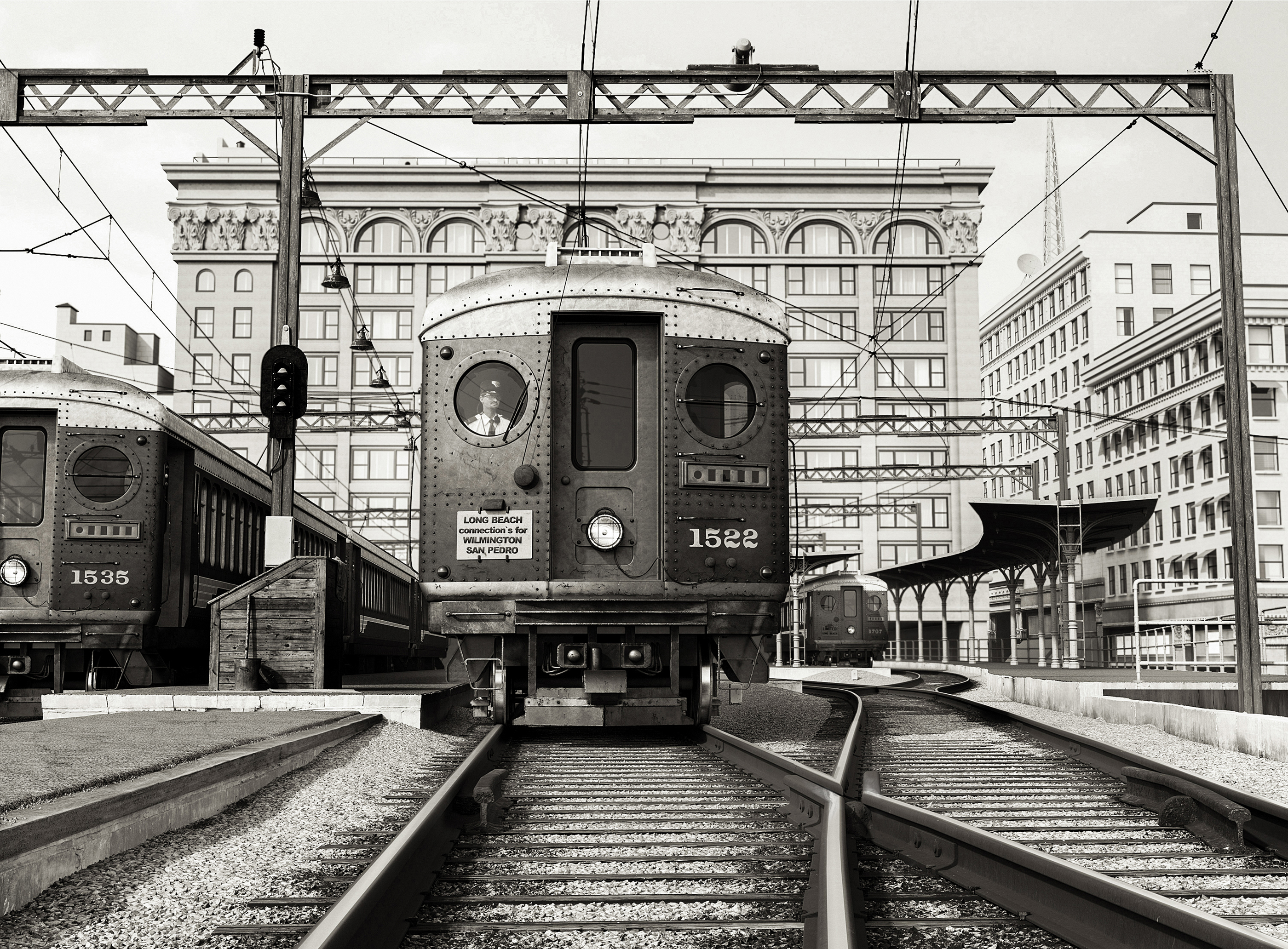 Лос-Анжелес. Трамвай No 1522 покидает Pacific Electric Building на 6-й и Главной улицах, направляясь в Лонг-Бич в декабре 1960 года, незадолго до окончания службы в 1961 году.