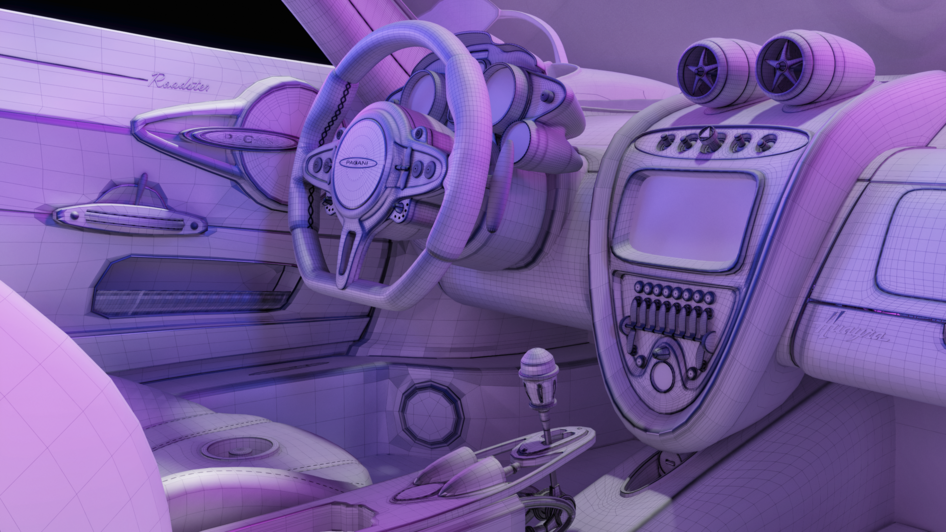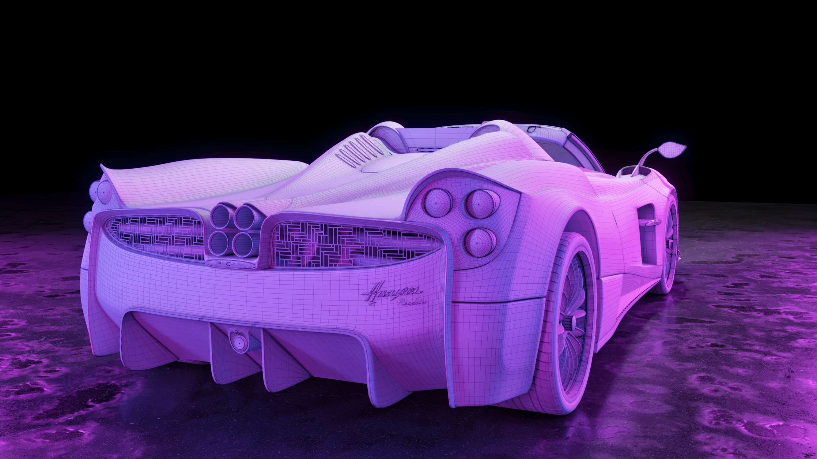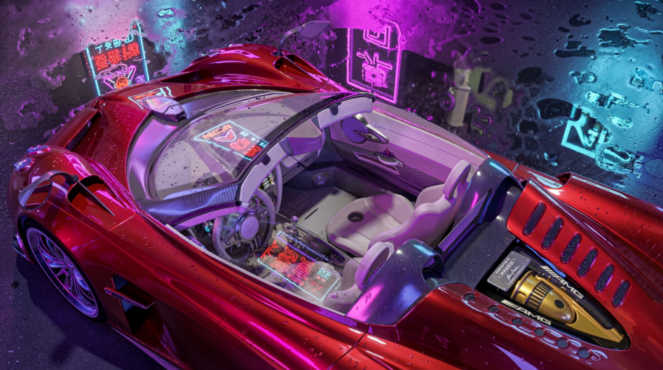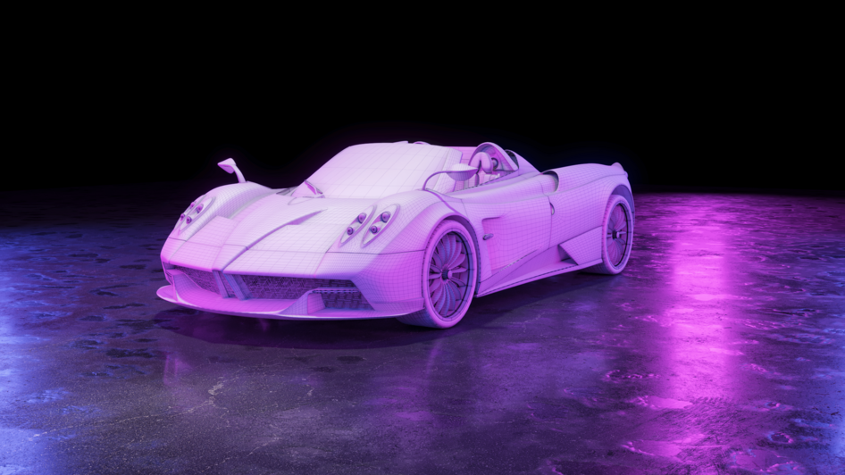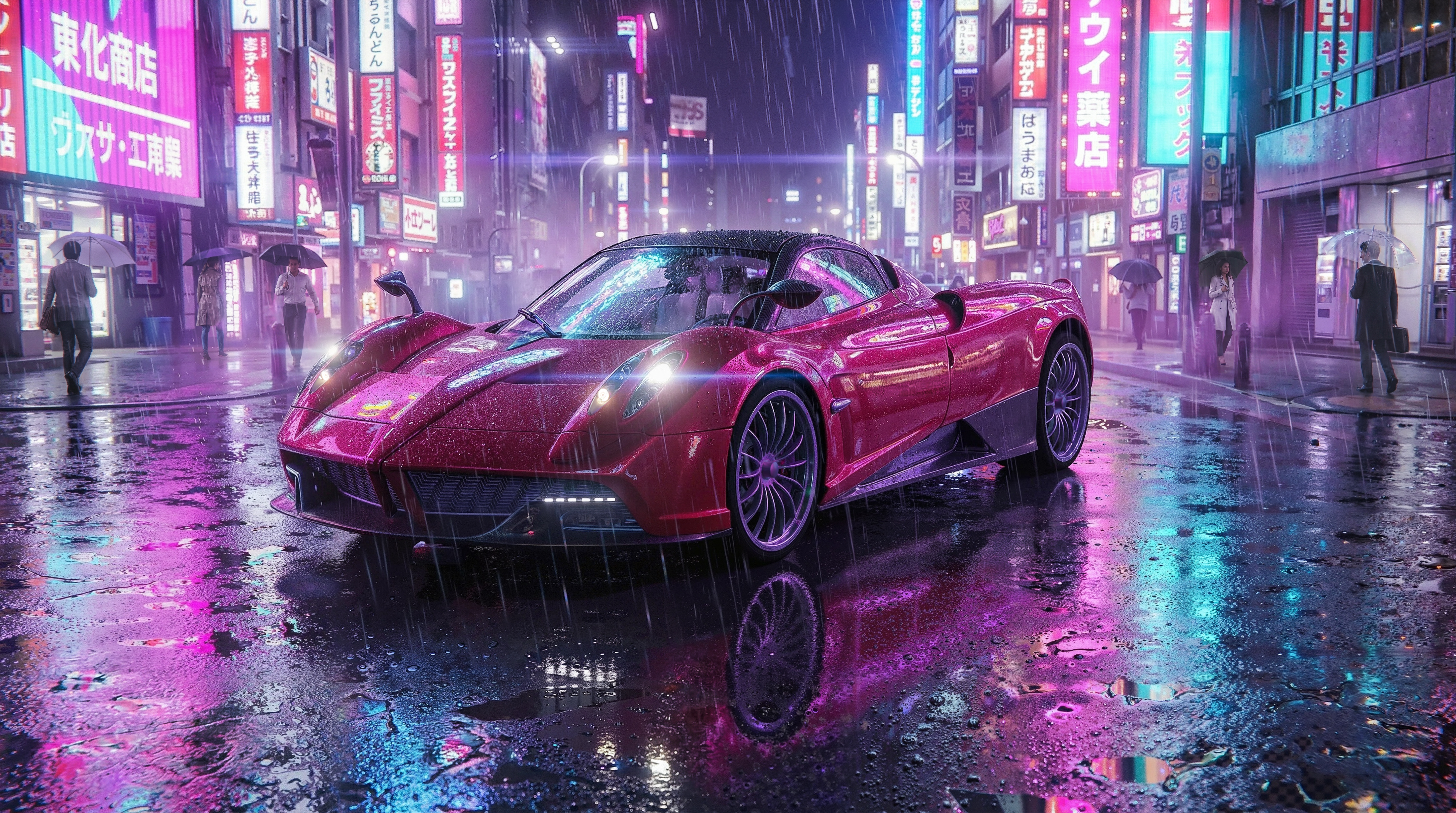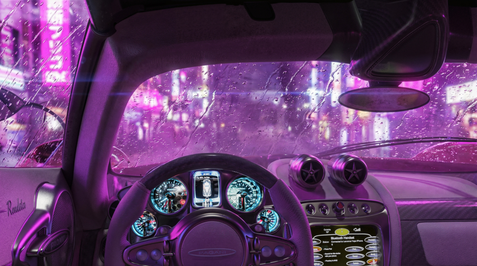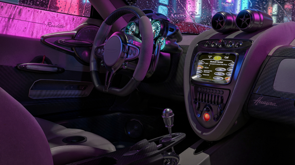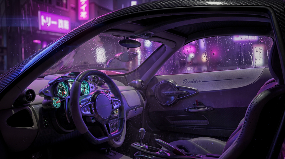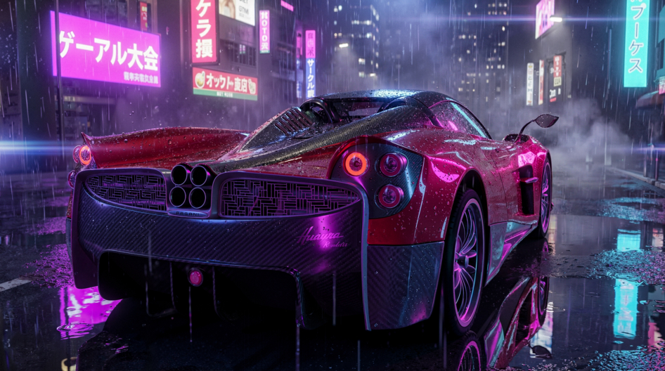 Визуализация Pagani Huayra Roadster в стилистике ночного дождливого Токио.
