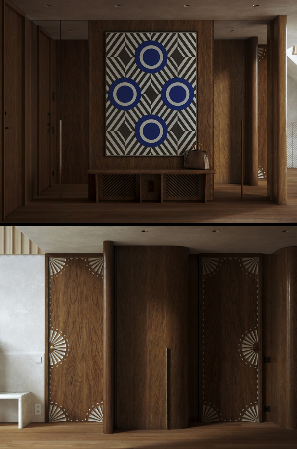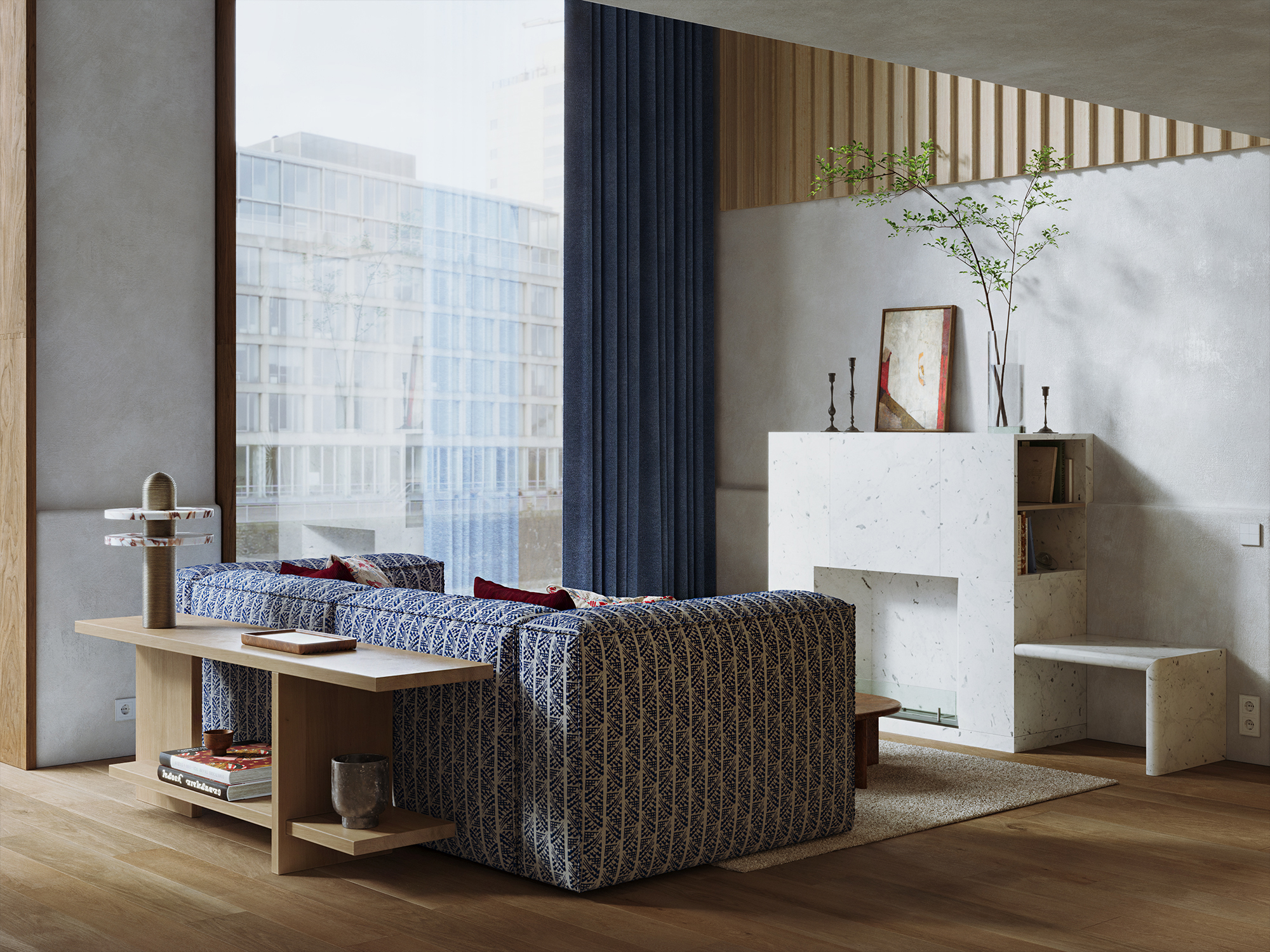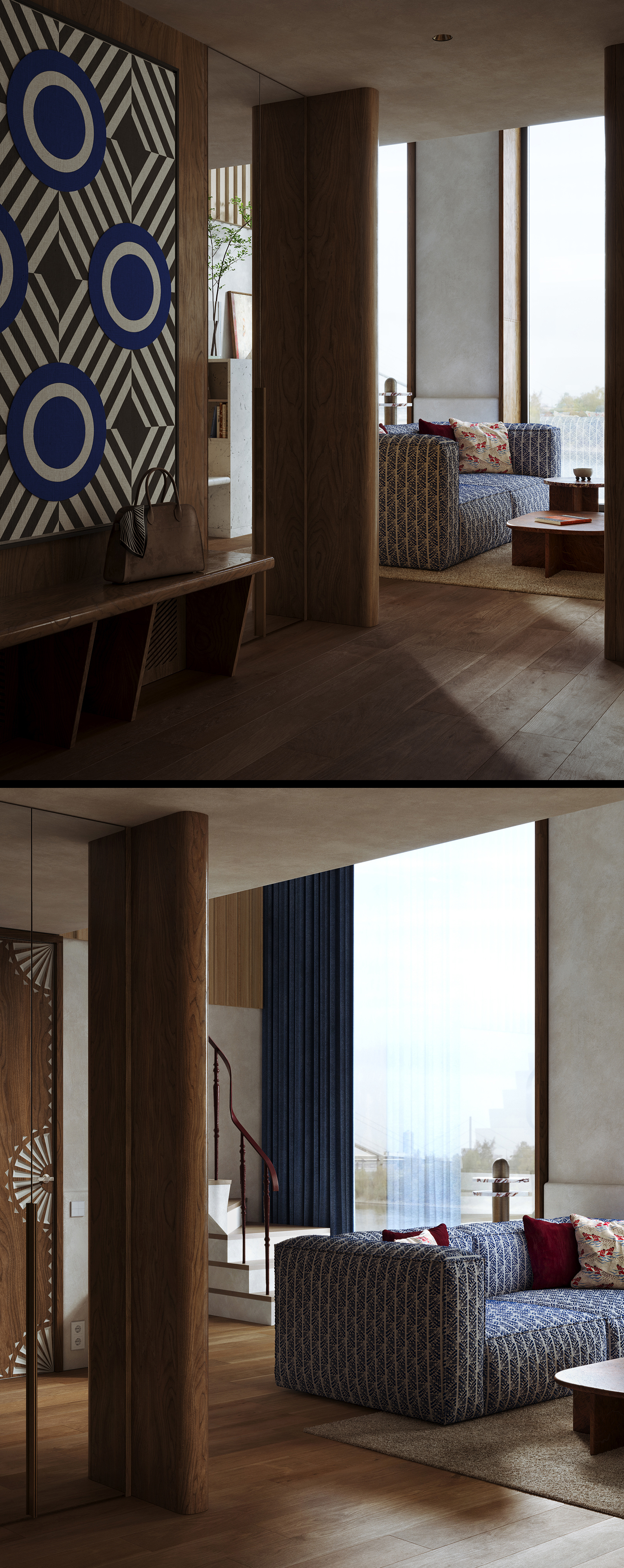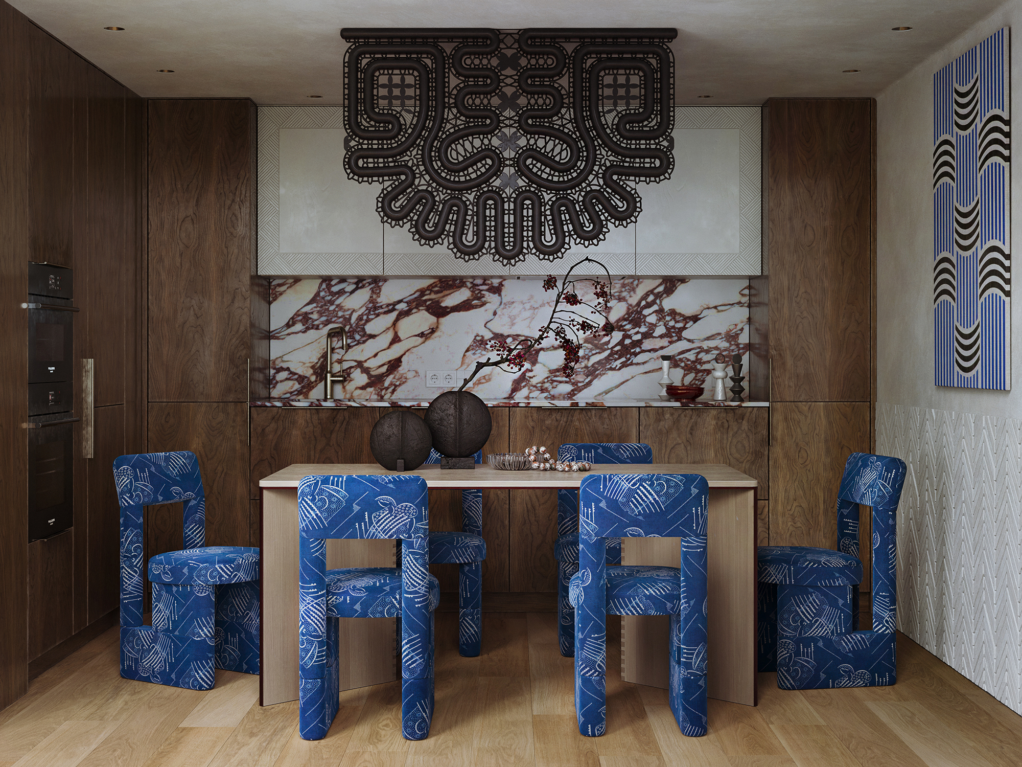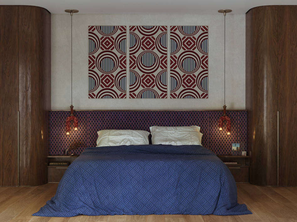 В основе проекта лежит идея создания интерьера в современном русском стиле, где традиционные узоры перекликались бы с орнаментами советского авангарда. Агиттекстиль здесь соседствует с резьбой, характерной для севернорусских прялок.