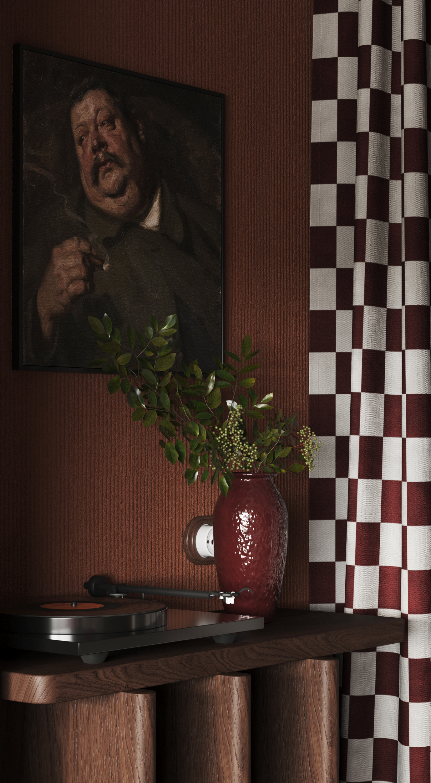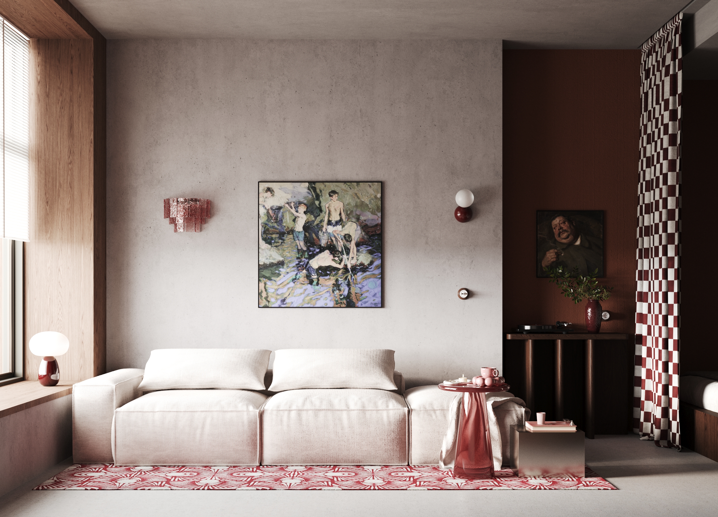 Работа создавалась не с целью стать точной копией оригинального автора, а для отработки навыков в настройке материалов, схем освещения, постановки ракурсов, а также развить общую насмотренность в создании интерьеров с яркими акцентами.