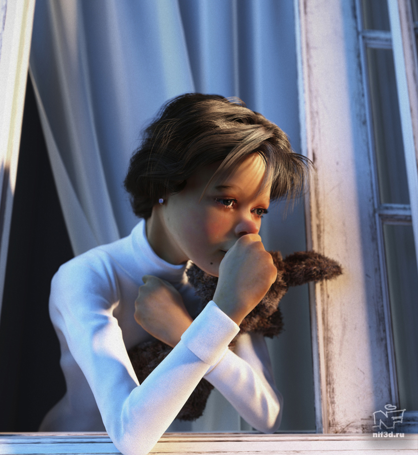 Очень здорово, эмоции передать получилось, цвета приятные и выглядит как очень красивая иллюстрация, немного подводят волосы (как и часто у компьютерных персонажей, из-за этого даже воротилы 3d иногда не могут сделать их реалистично, потому-то Бенджамин Баттон лысый и в очках, чтобы волосы и глаза не выдали компьютерную графику). Не понравились пряди волос на крупном плане, спадающие косо со лба, неестественно пересекаются в одном месте и волосы выглядят как грязные и слипшиеся. а вот глаза, наоборот, получились классно, лицо закрыто рукой и персонаж выражает эмоции в основном глазами и позой, это получилось живо и натурально.