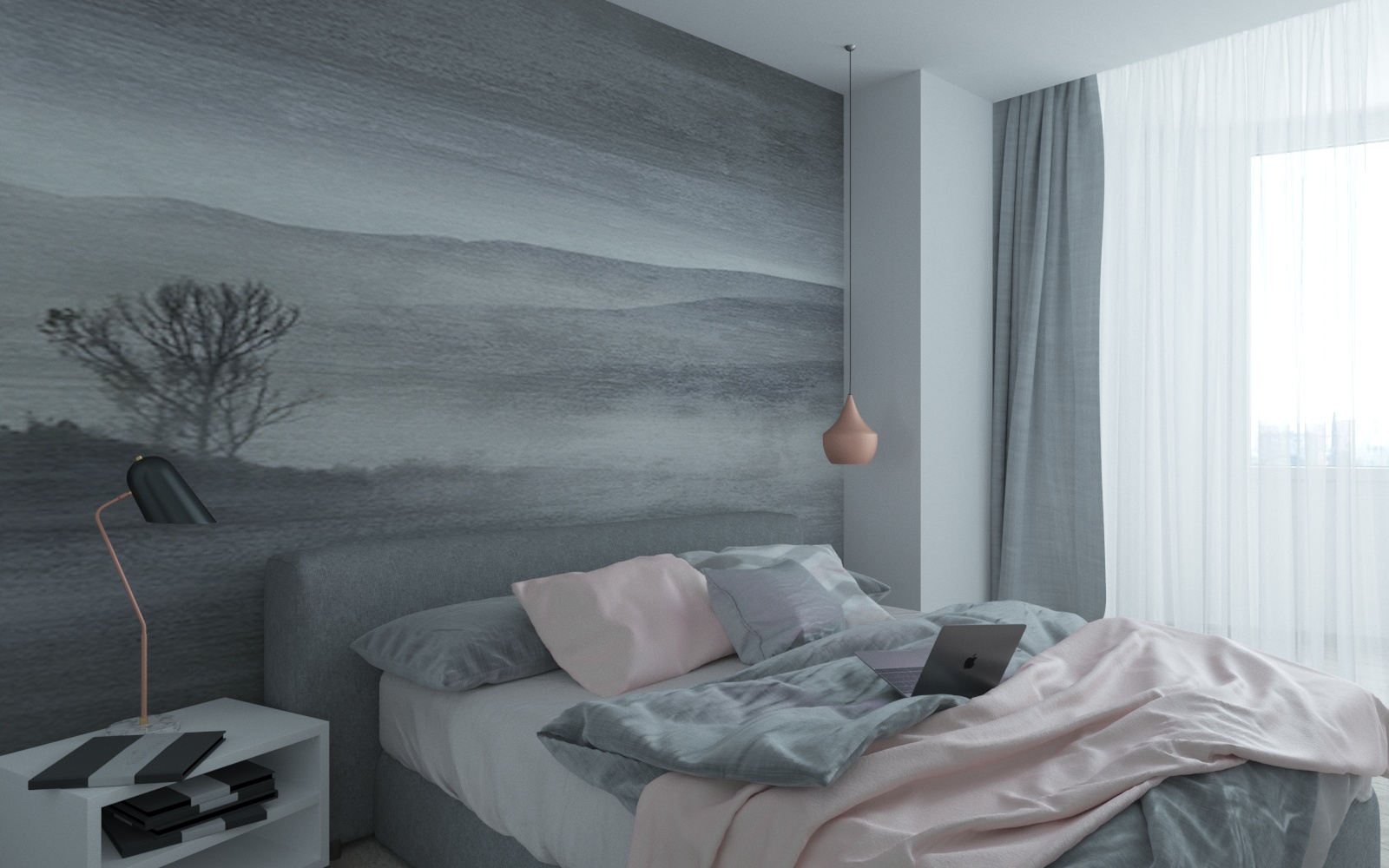сори конечно но это больше похоже просто на тест для дизайнера показать,нежели финал,это я имею ввиду про виз! принту на стене явно не хватает размера самой текстуры , пересвет бьет по глазам,материал тюли уже озвучили тв вроде вкл,но оч тусклый,еще есть куда рости) удачи)