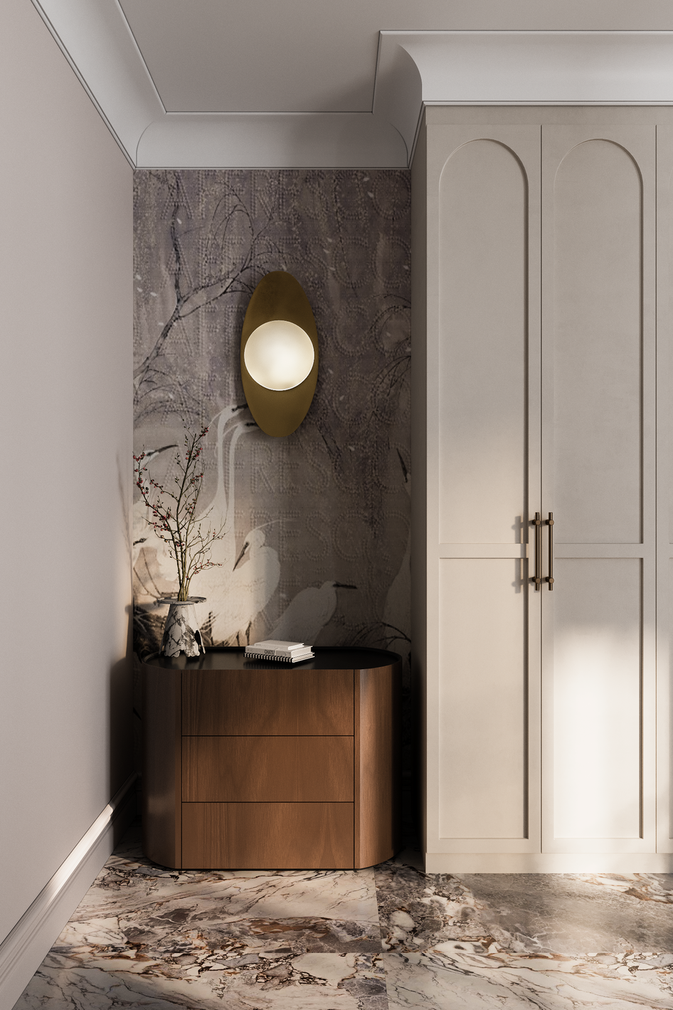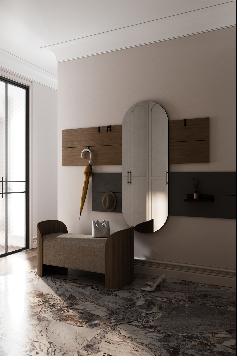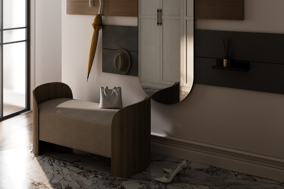 Благодаря скругленным углам, комод и банкетка смотрятся очень легко и компактно, визуально не загромождая пространство комнаты.