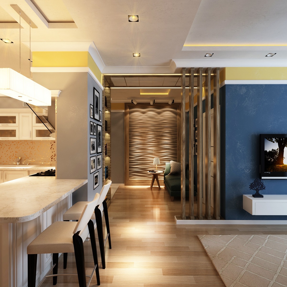 - совмещенная кухня с гостевой комнатой, разделенной барной стойкой